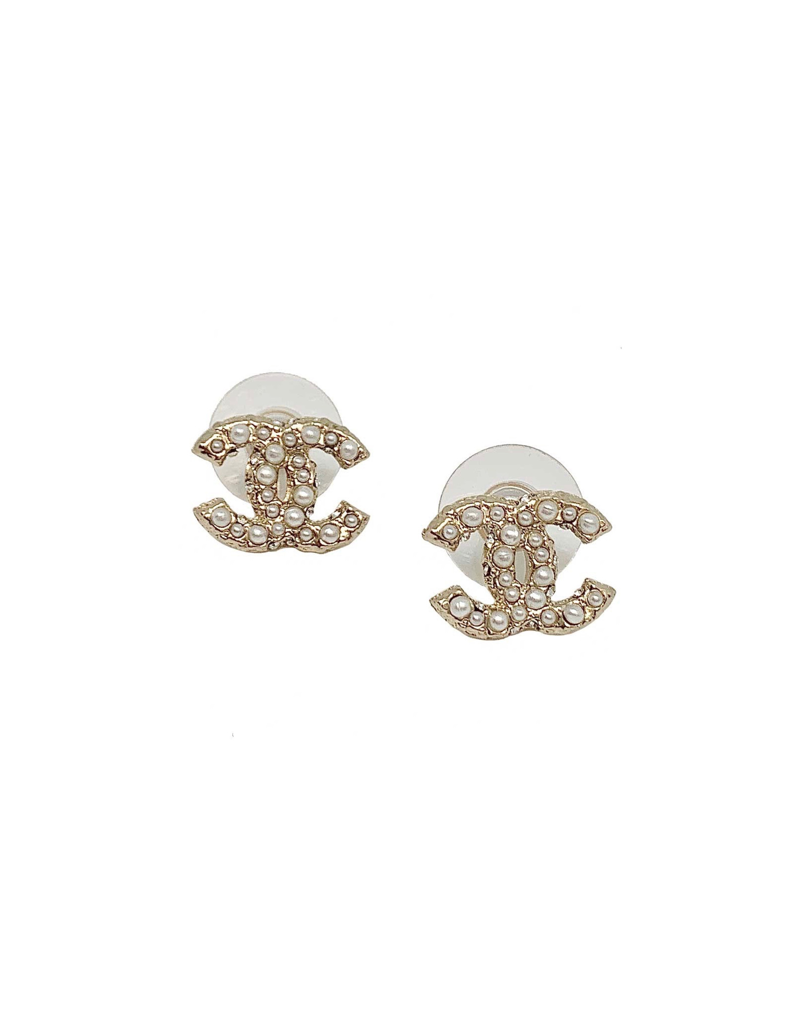 Elégants et raffinés! Clous de la maison CHANEL, CC, en métal doré or pâle, sertis de strass et perles nacrées.