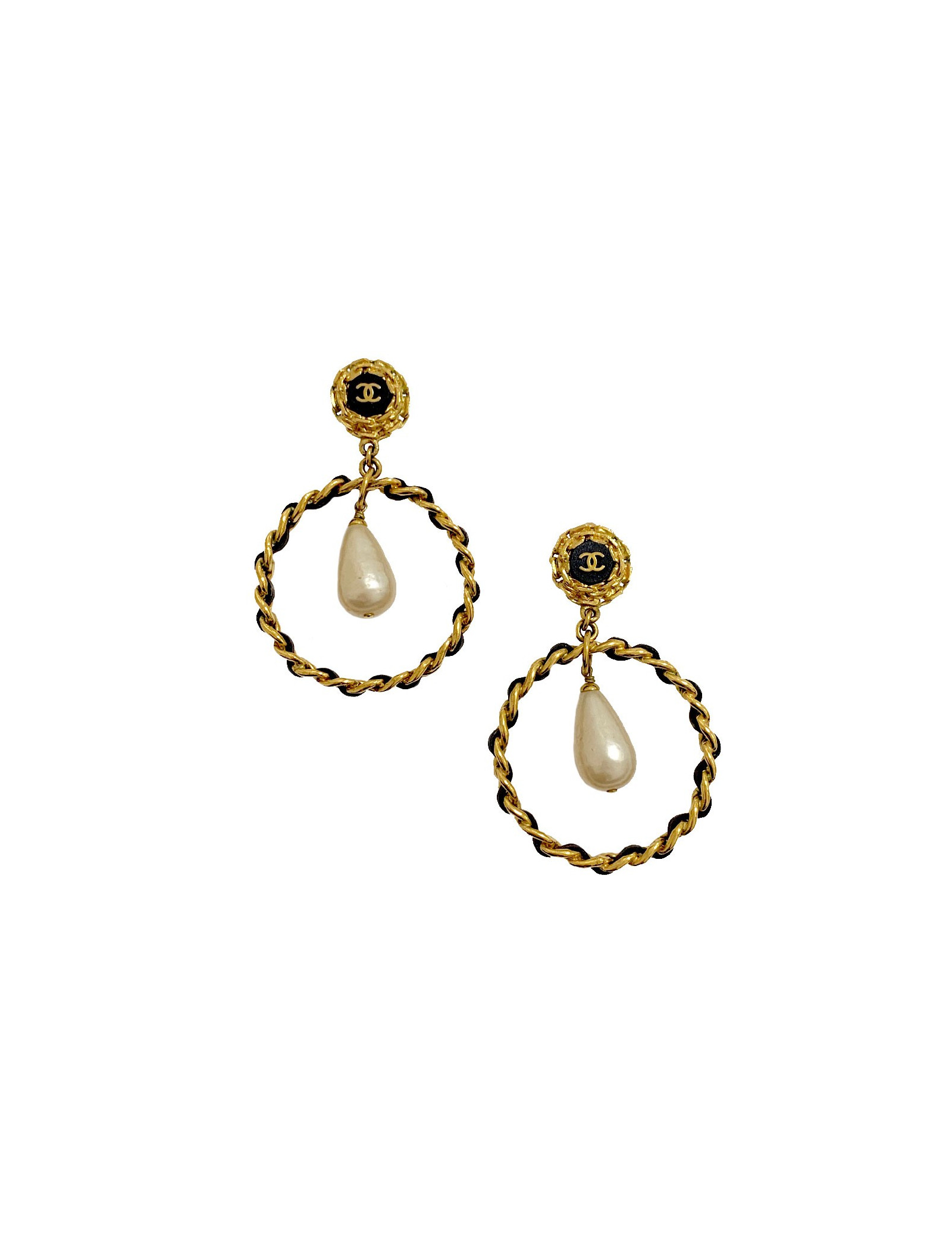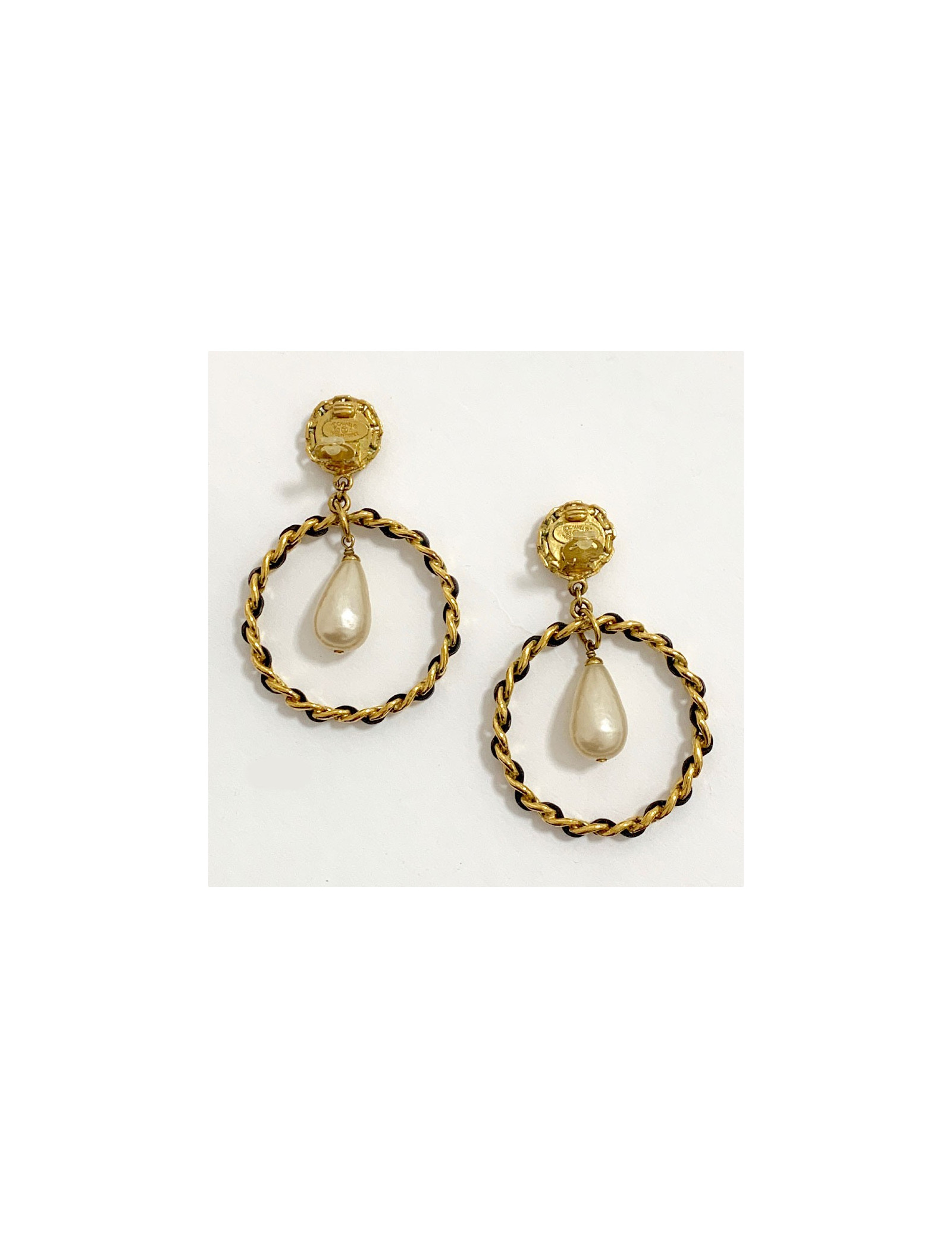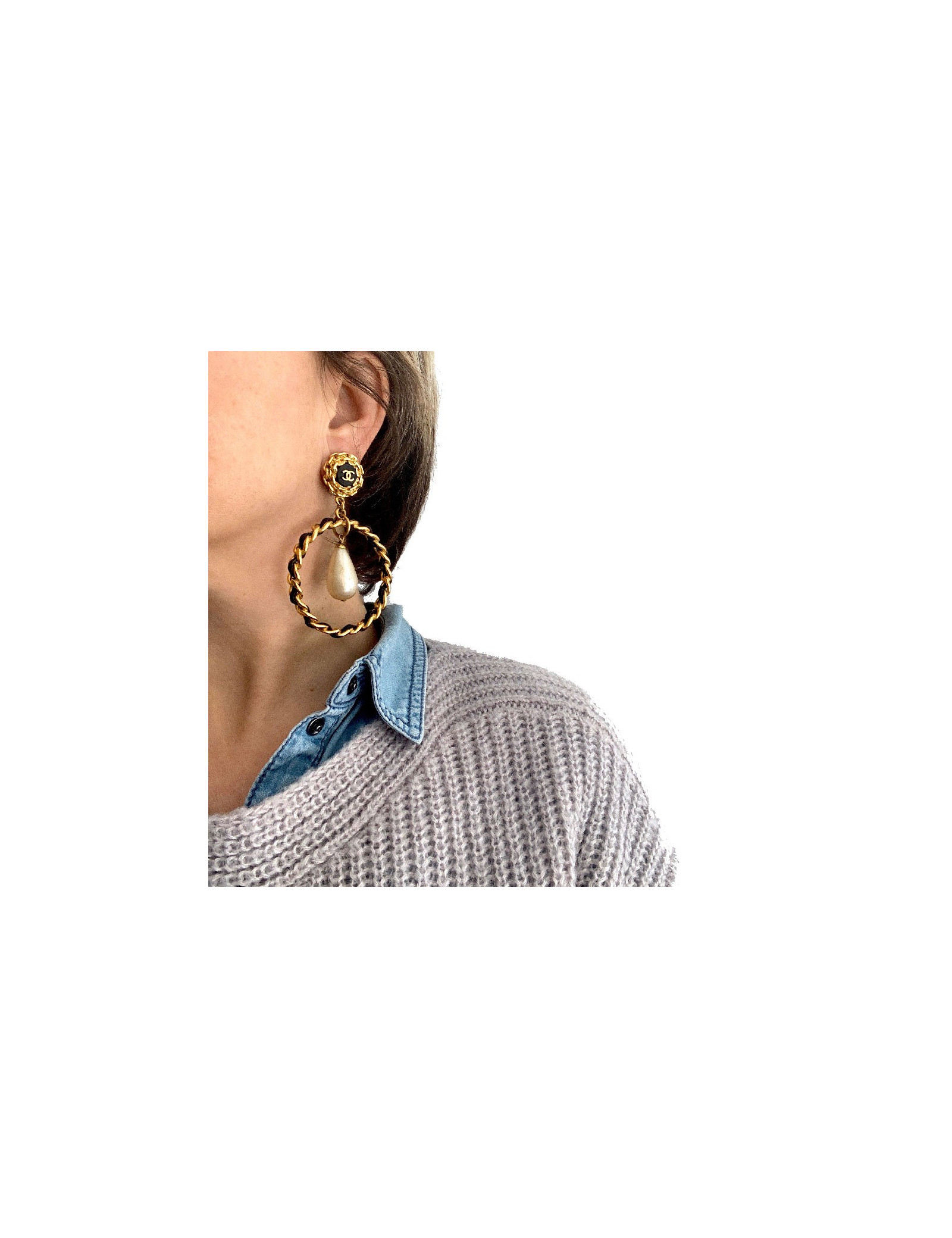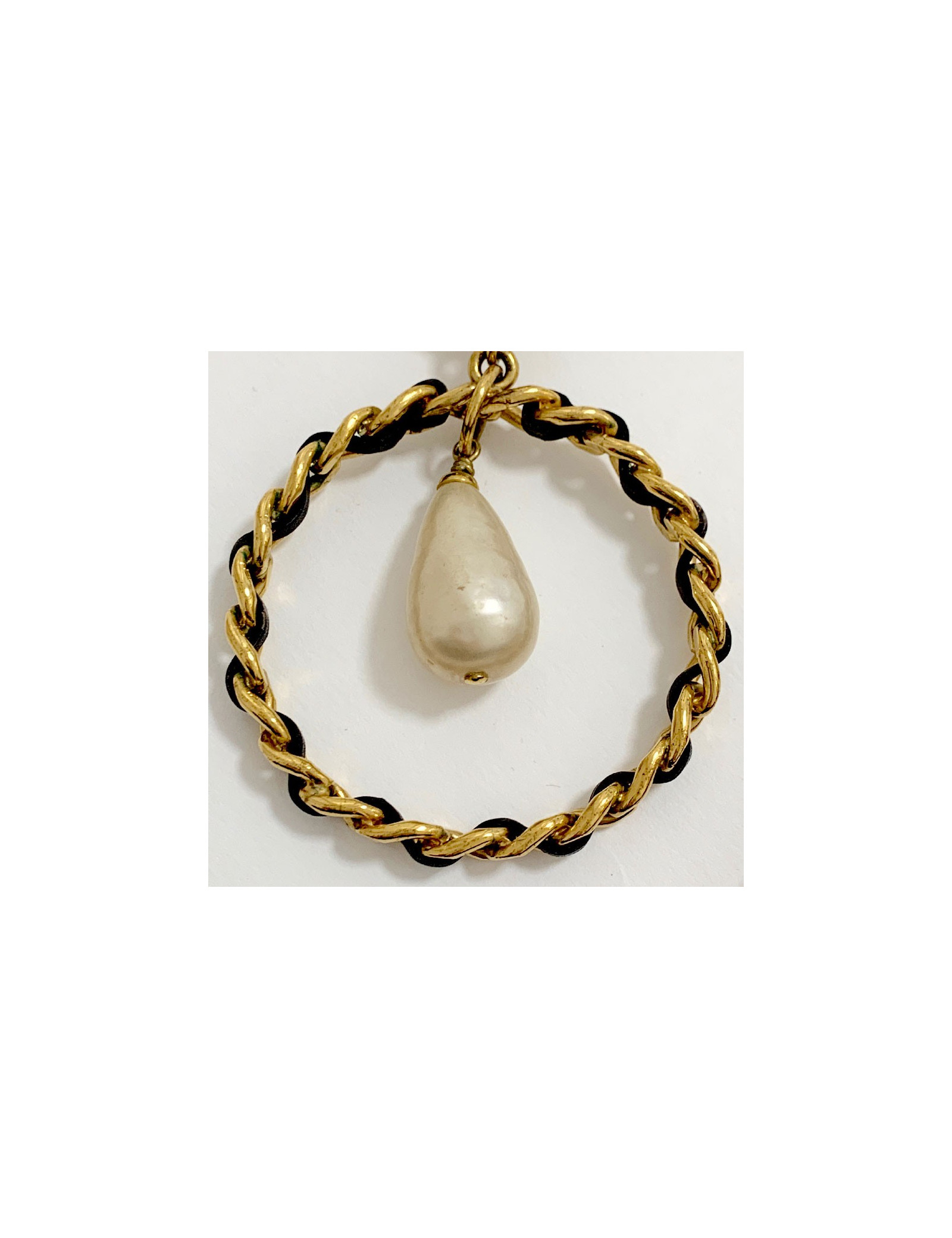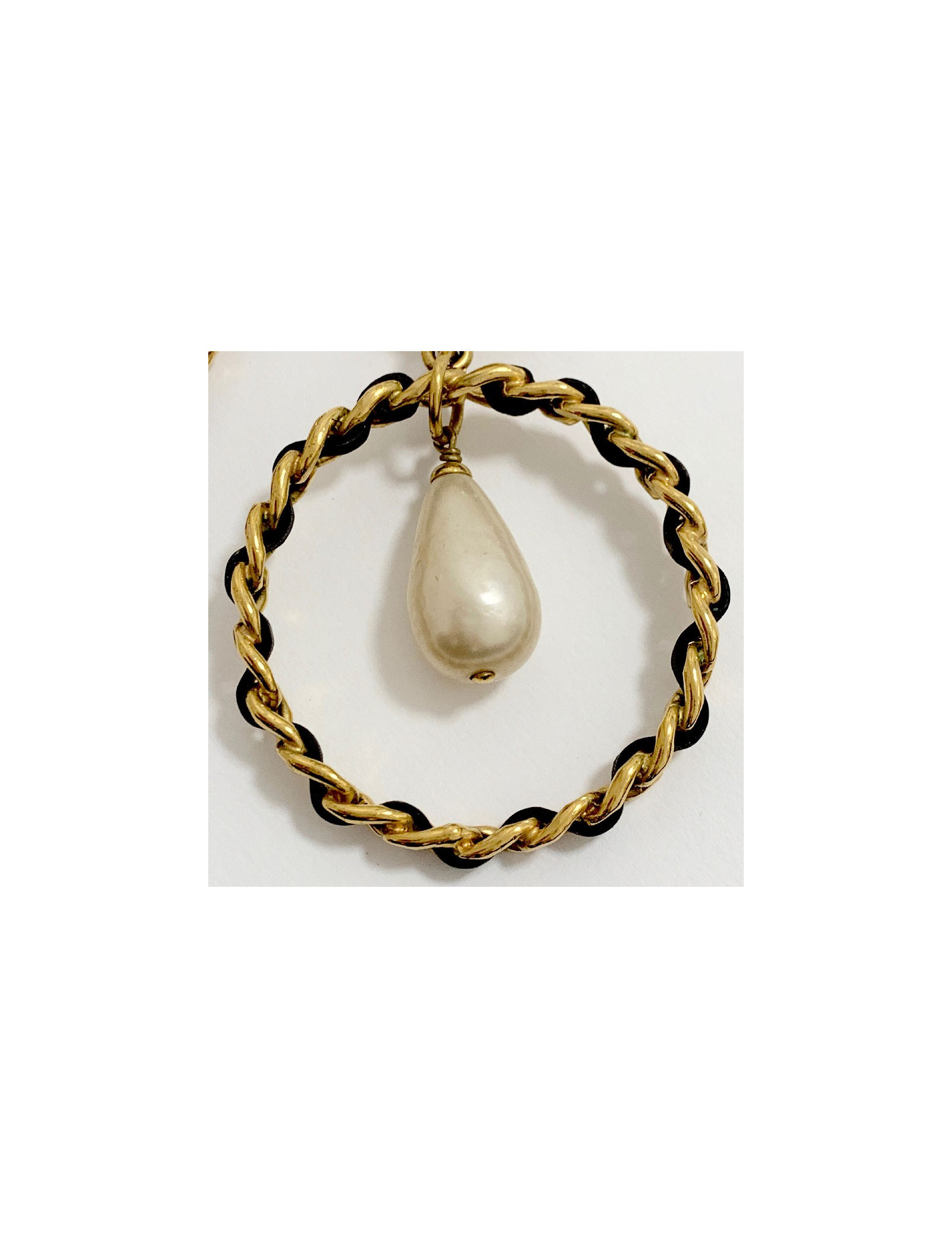 Collector, Années 90, période Claudia Schiffer! Superbe boucle d'oreille CHANEL chaine en métal doré entrelacé de cuir noir. Une perle en forme de goutte est suspendue au milieu de l'anneau. Des créoles vintages mais si tendance!!!