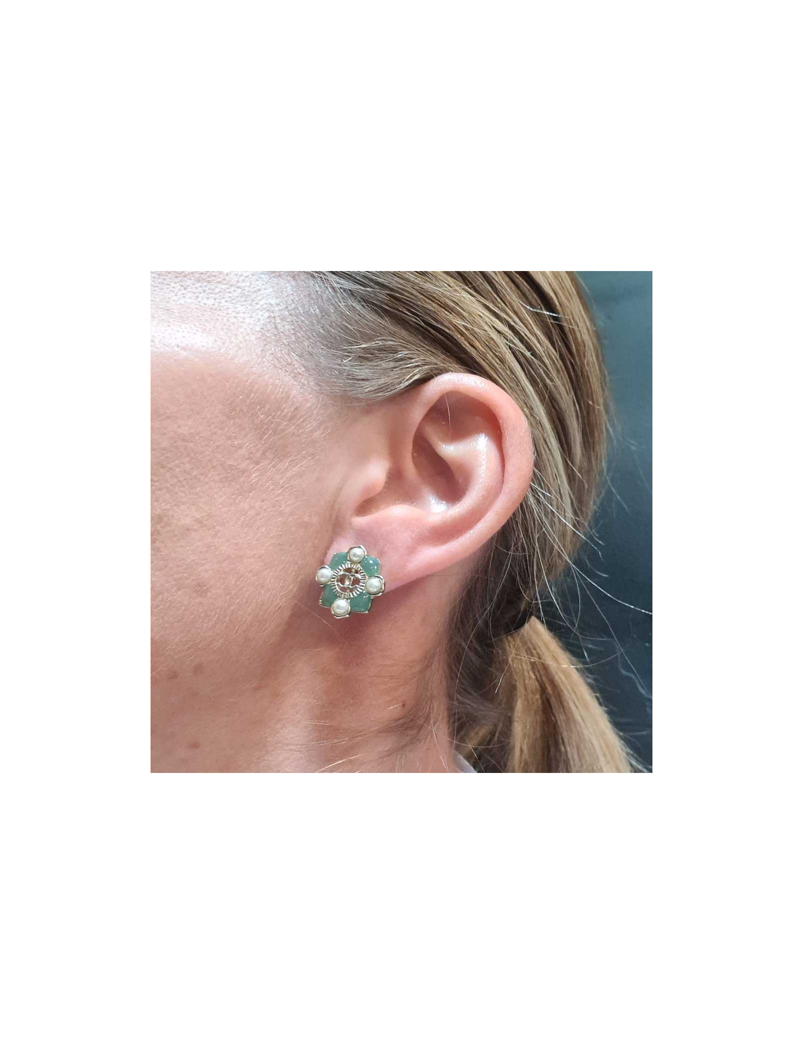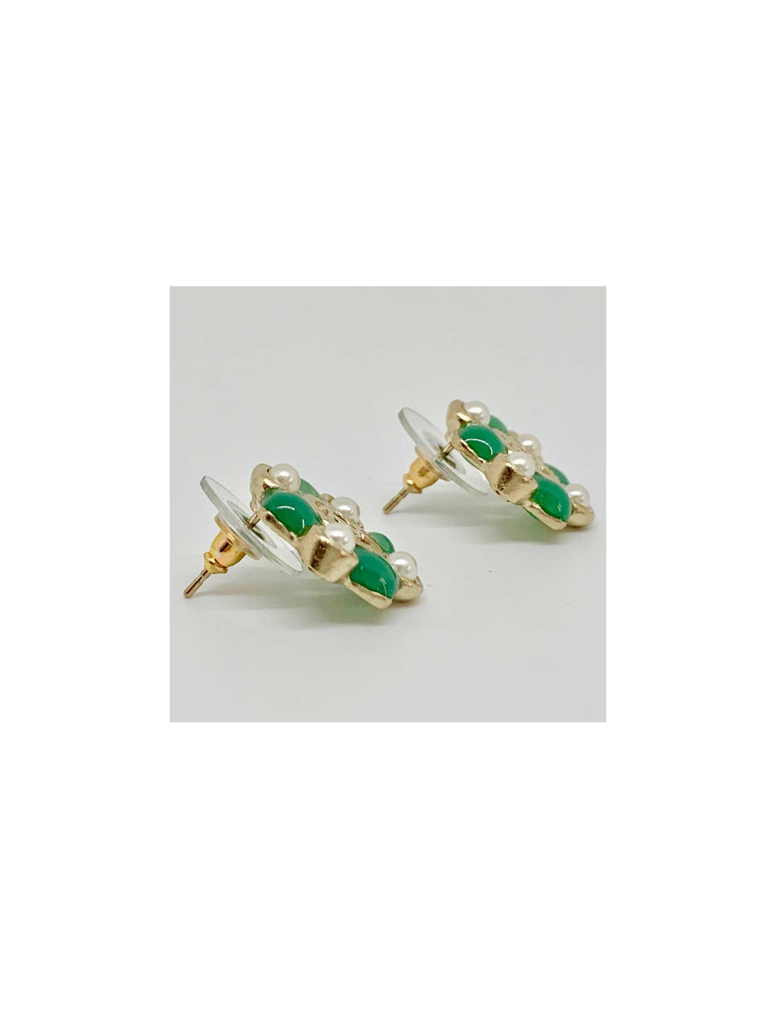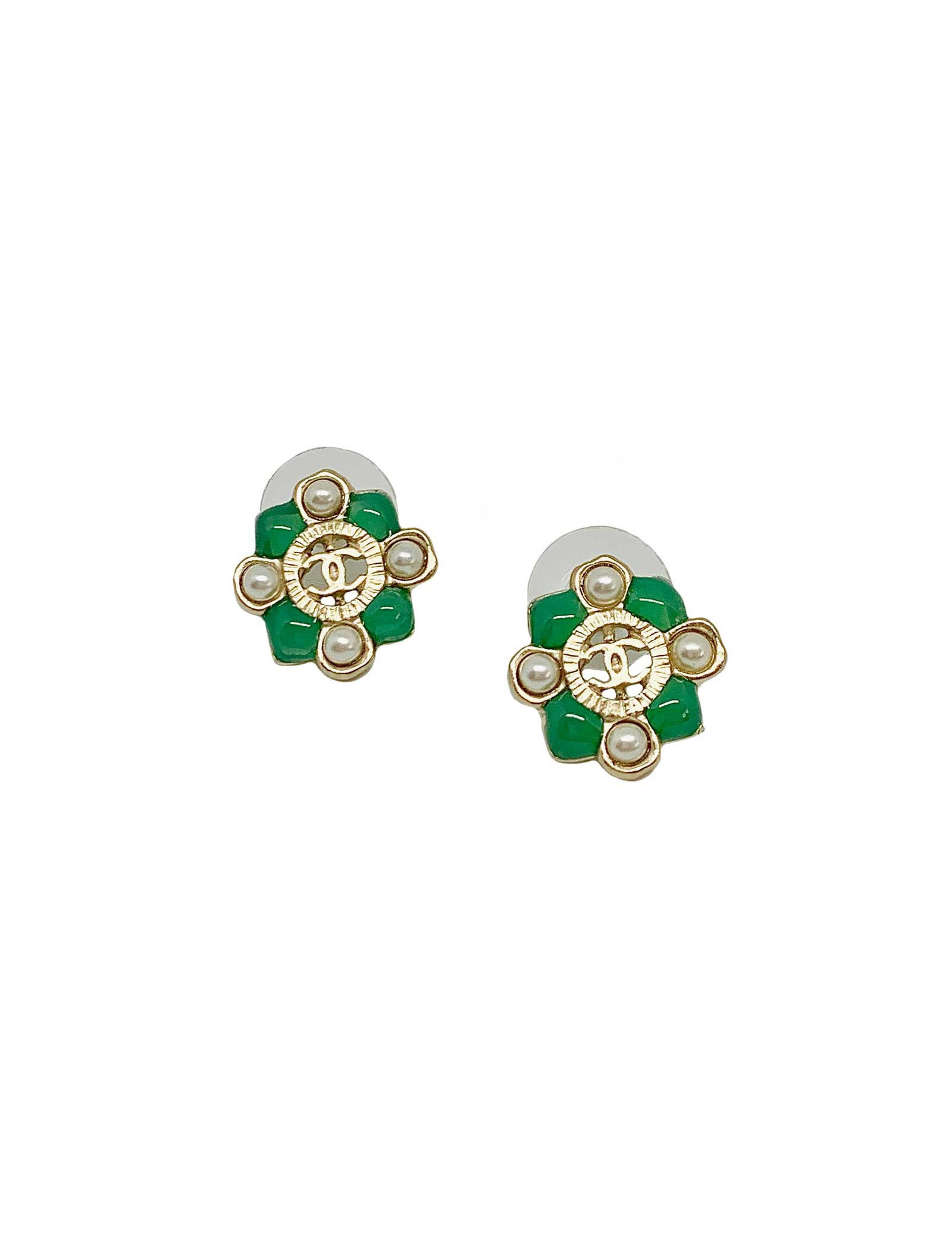 Un joli CC doré agrémente le centre de ces boucles d’oreilles Chanel ensuite parées subtilement de perles nacrées et remplies de pâte de verre de couleur verte (jade).