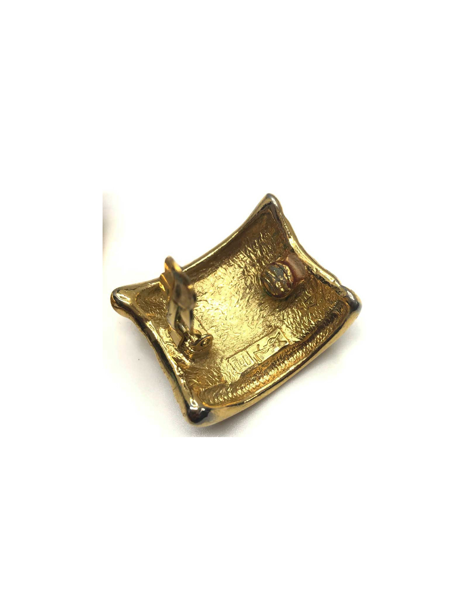 Les clips sont issus de la Maison Saint Laurent au temps de feu son créateur. De forme rectangulaire, ils sont en métal martelé, et doré à l'or fin.