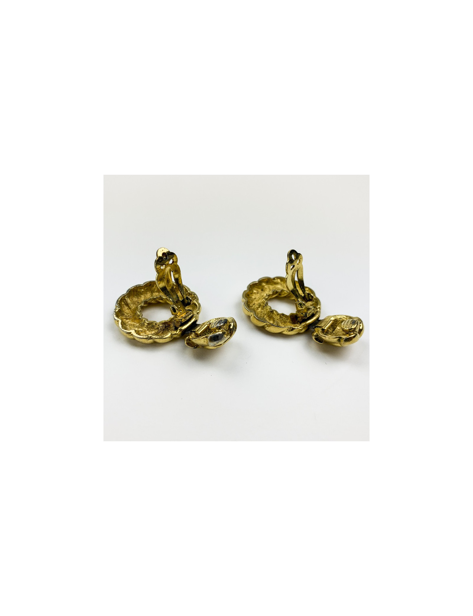 Les clips sont vintage et en bon état. Seules des traces d'oxydation du métal sont présentes à l'intérieur du fermoir ce qui est invisible une fois porté. Les boucles mesurent 4.5 centimètres de longueur. Elles sont Made In France. Présence de la pastille de la marque.