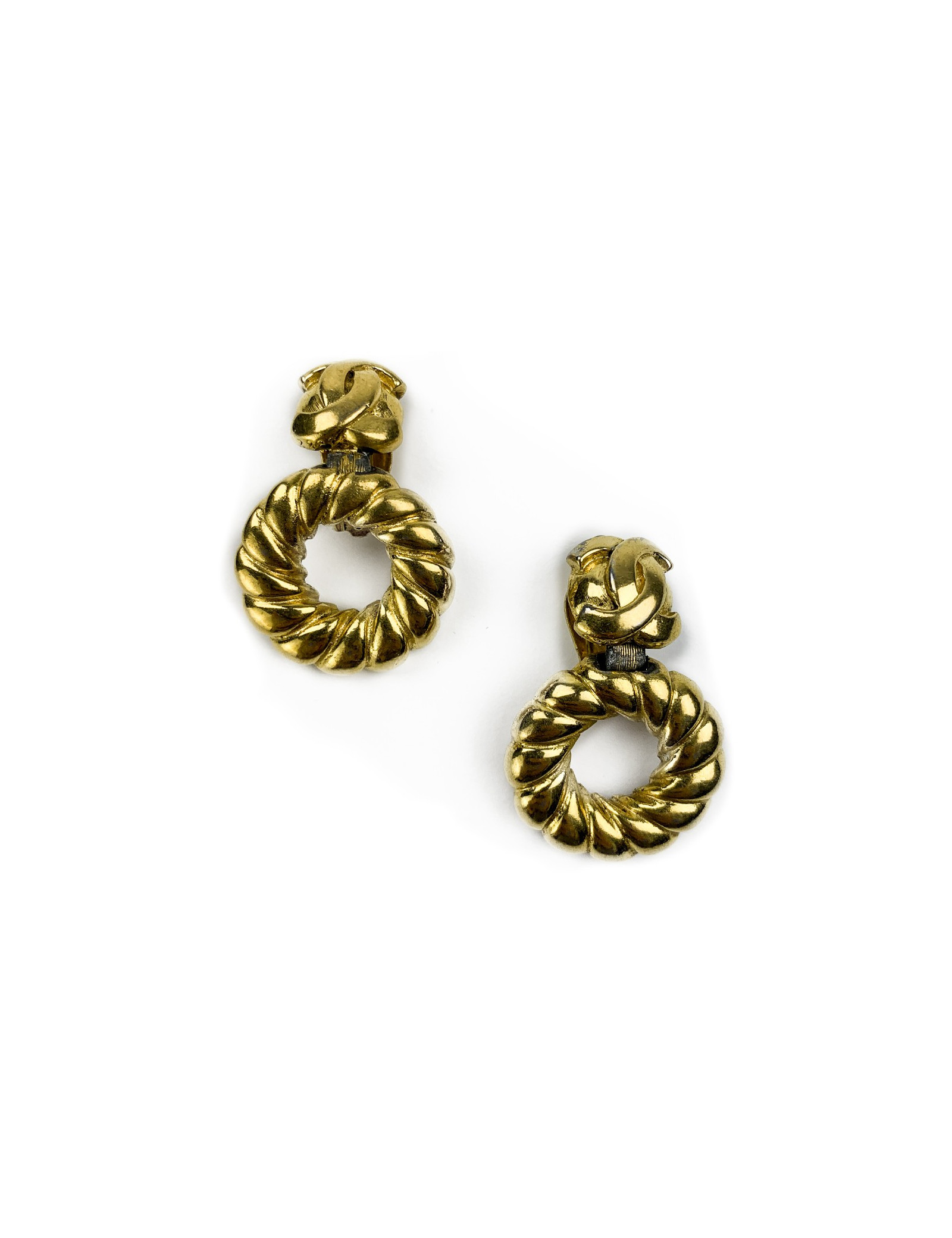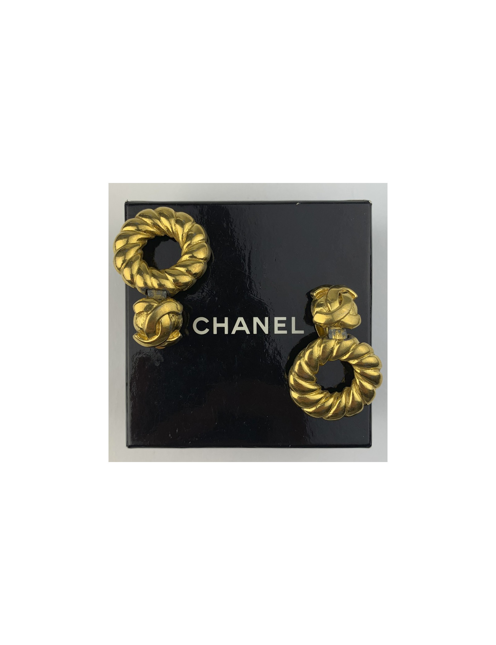 Les boucles d'oreille proviennent de la Maison CHANEL. Elles représentent chacune un rond torsadé en métal doré qui se ferme à l'aide d'un clip sur lequel nous trouvons le logo CC de la marque.