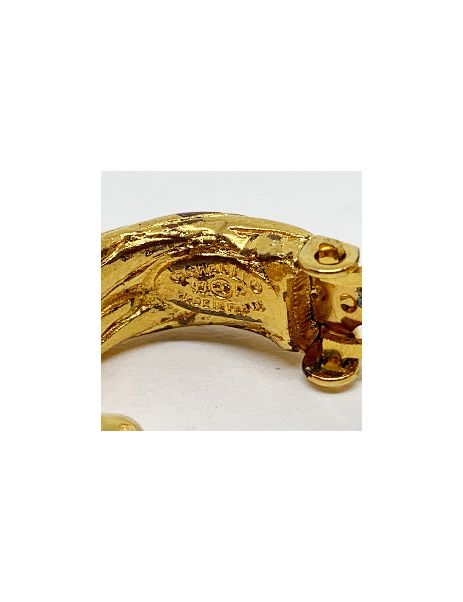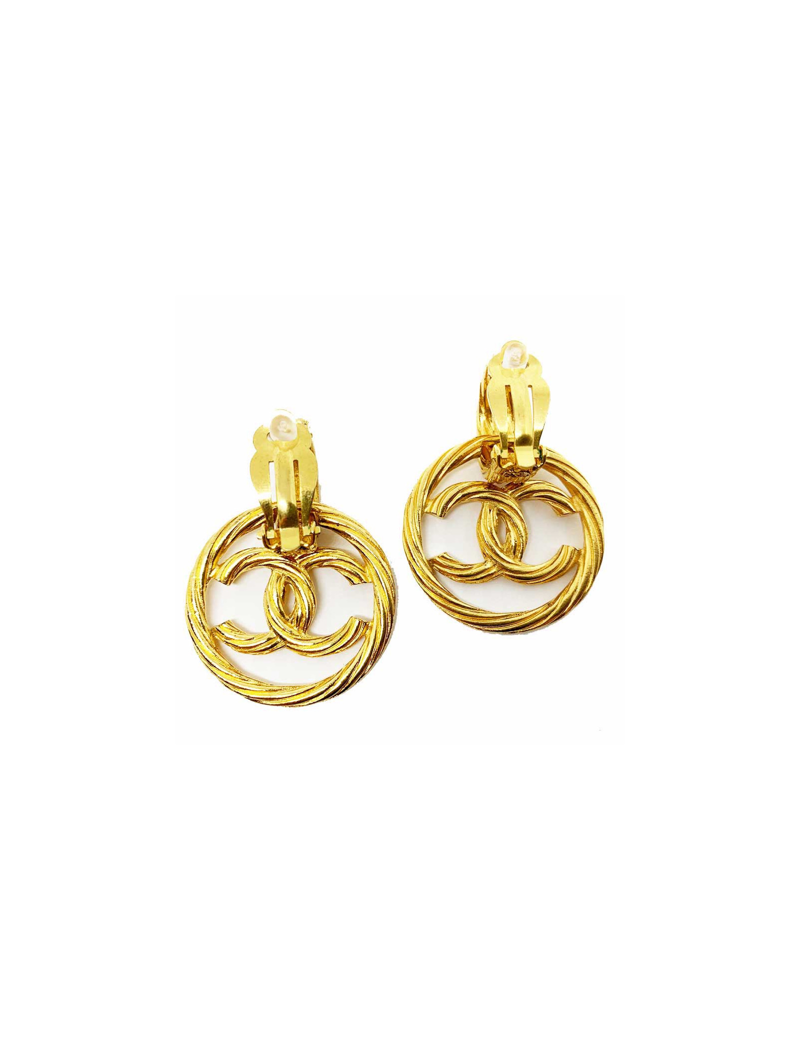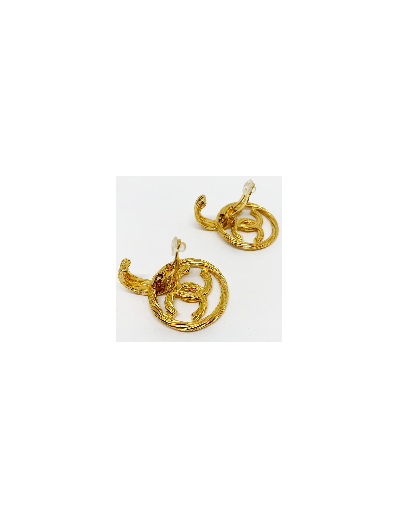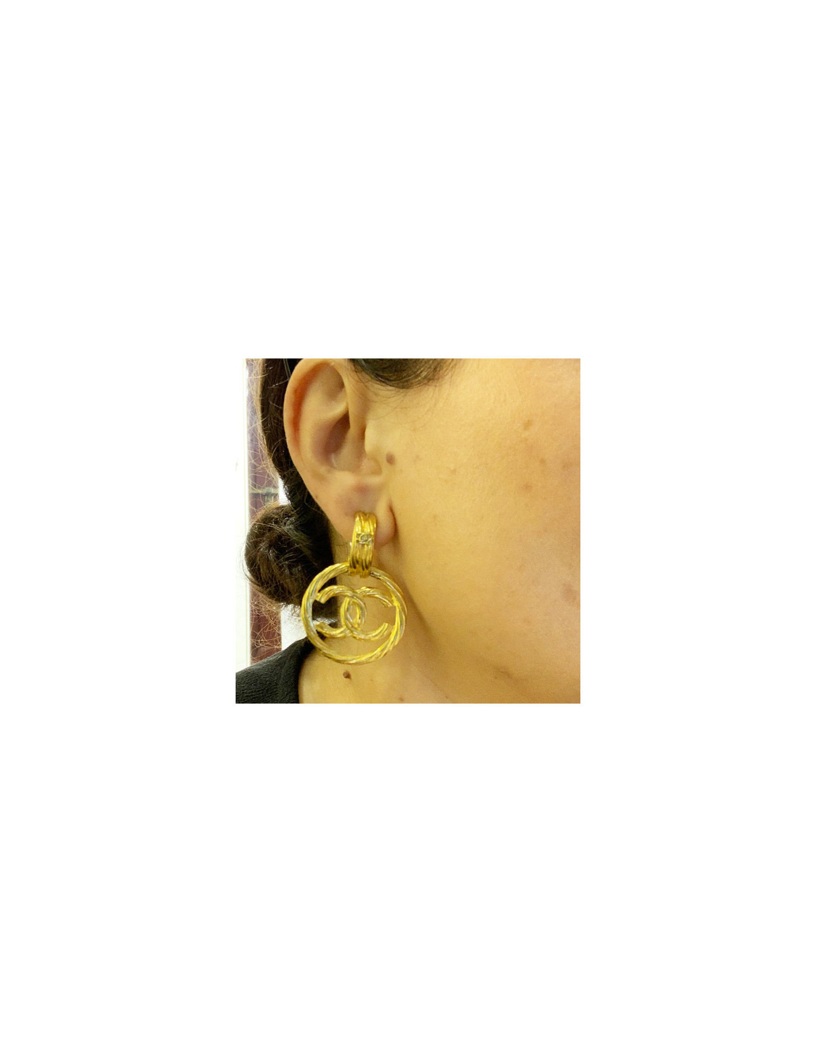 Les boucles d'oreille sont signées CHANEL. Chacune se compose de deux anneaux qui s'emboîtent, et qui peuvent donc aussi se porter séparément. Un grand anneau encercle le CC CHANEL, lequel est tenu par un autre plus petit au niveau du fermoir. Les boucles d'oreille sont en métal torsadé et doré à l'or fin.