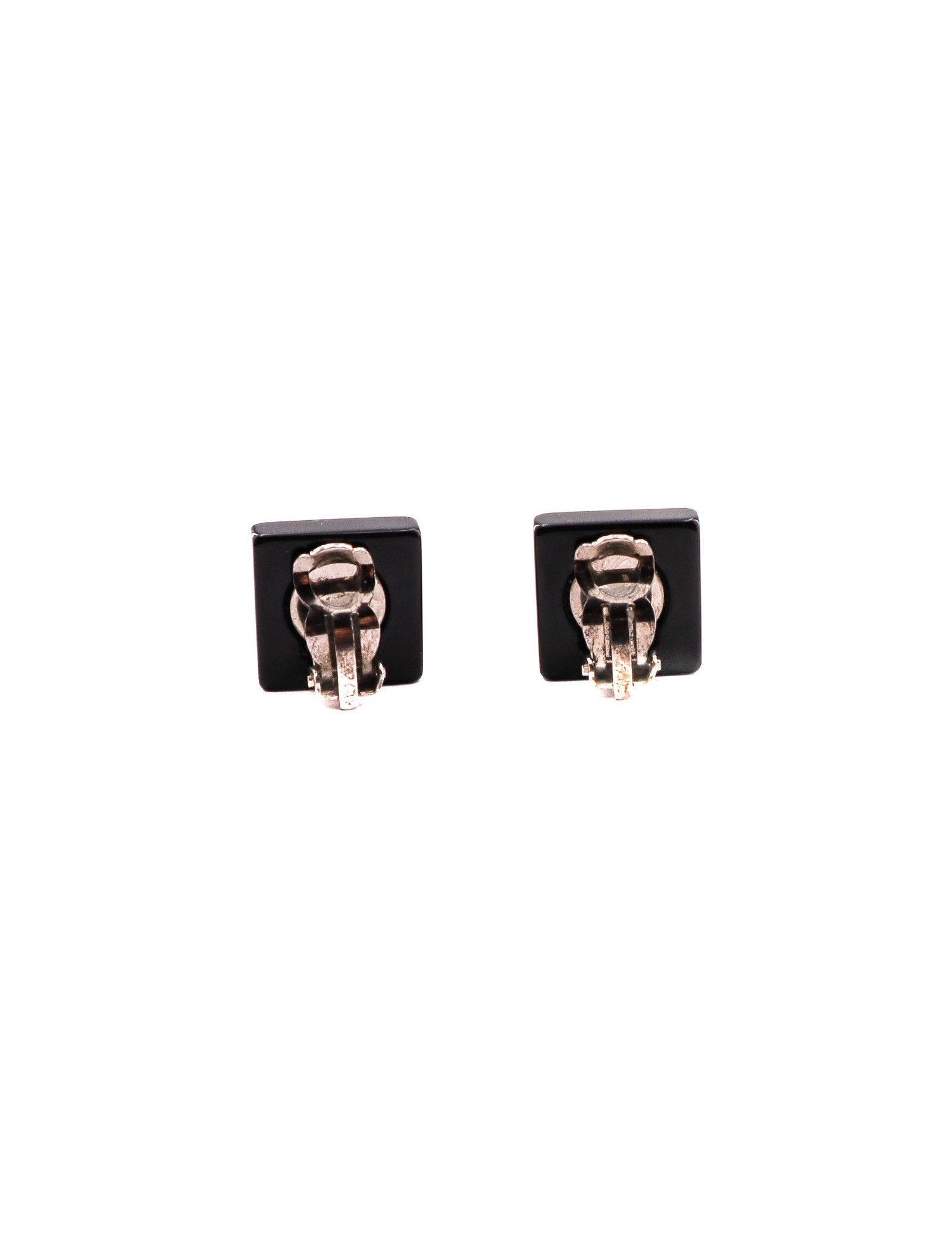 Les clips sont dans un bon état. Nous notons un éclat sur un des coins d'une boucle, ce qui ne se voit pas étant donné qu'ils sont noirs. Ce sont des carrés aux côtés mesurant 1.5 centimètre.