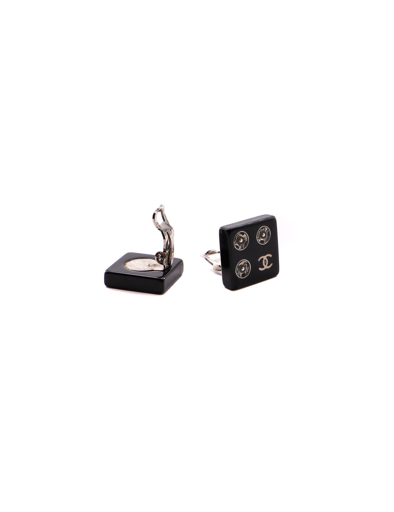 Boucles d'oreille de la Maison CHANEL. De forme moderne et carrée, elles sont de couleur noire et se trouvent incrustées de CC, emblème de la marque, et de ce qui semble être des roues de réglage de mécanisme horloger.