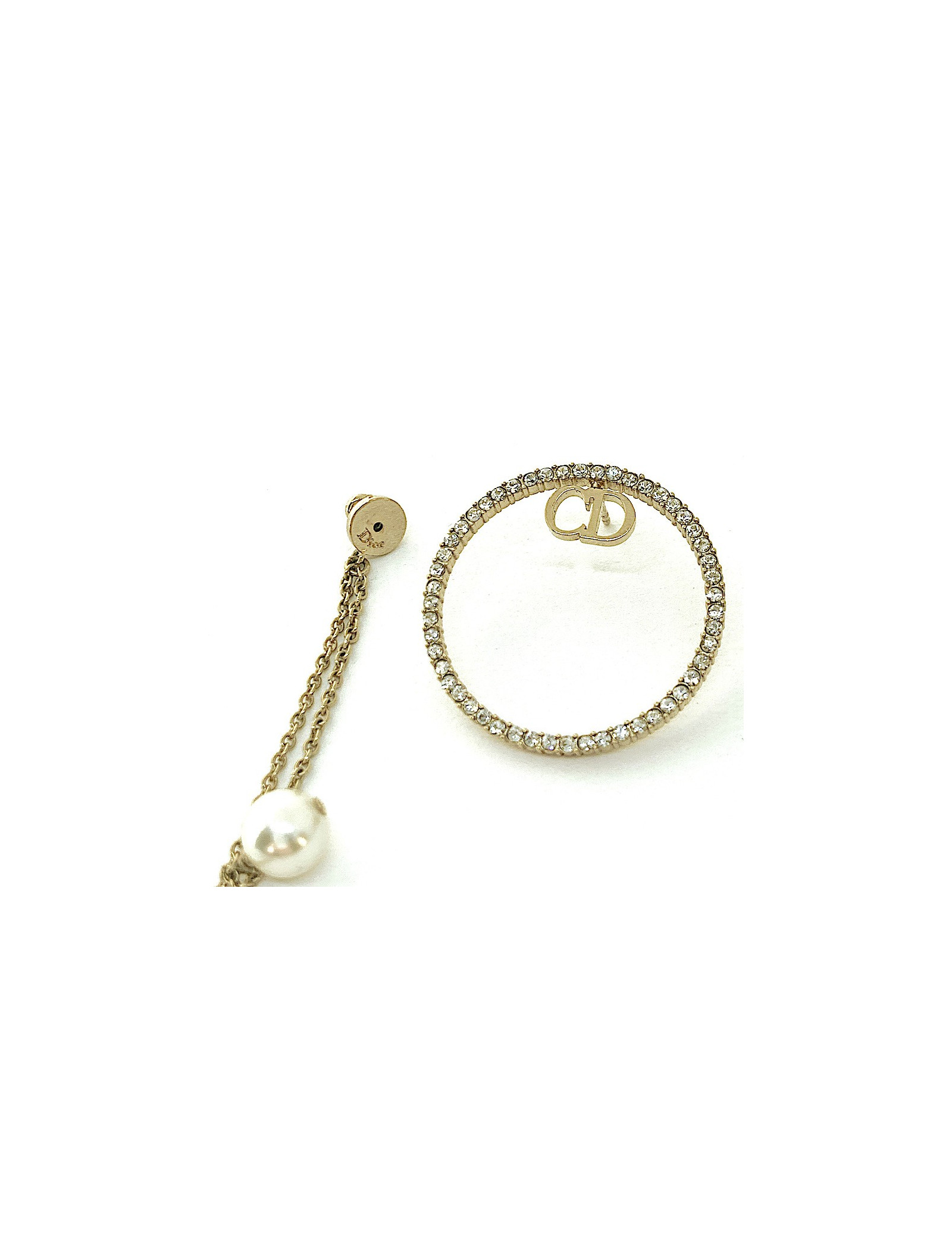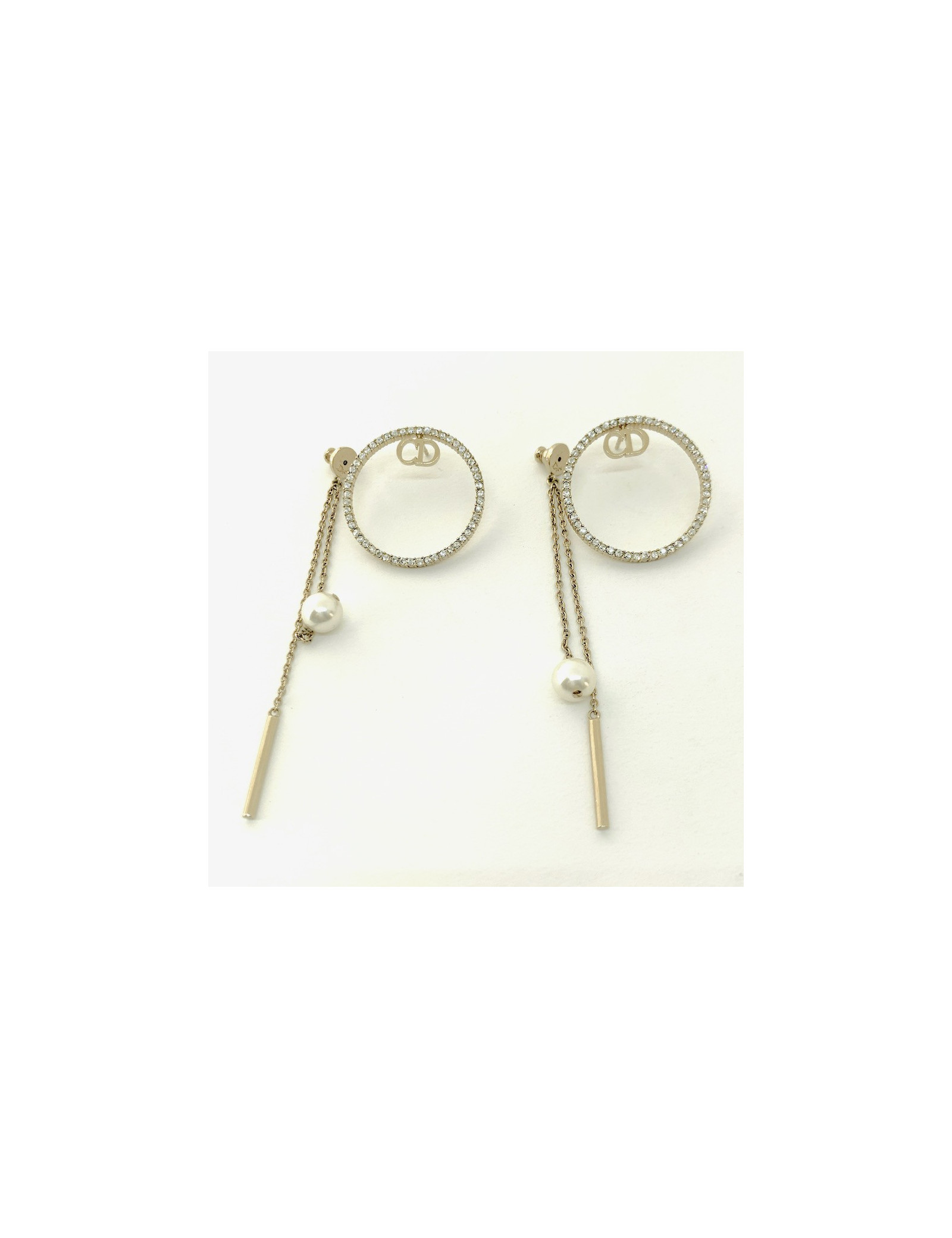 Boucles d'oreille DIOR anneau entièrement serti de strass. Le fermoir pressoir est agrémenté de 2 pendants se terminant par une perle et une tige en métal doré. Le logo CD se situe en haut de chaque anneau.
