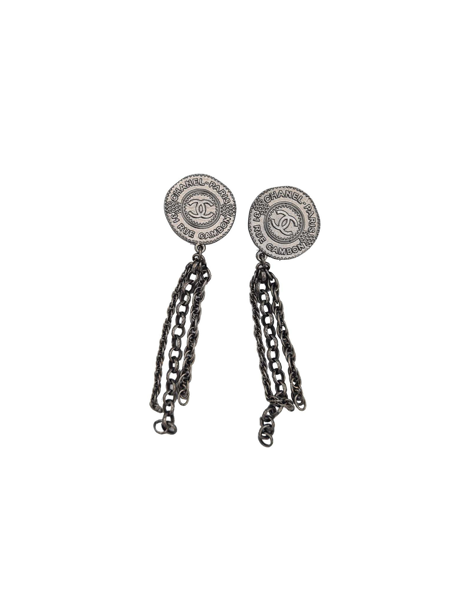 Ces clips CHANEL sont issus de la Collecton Métiers d'Art Paris-Dubaï, ils sont en métal argent foncé. Présence de la pastille de la marque à l'arrière de chaque boucle.