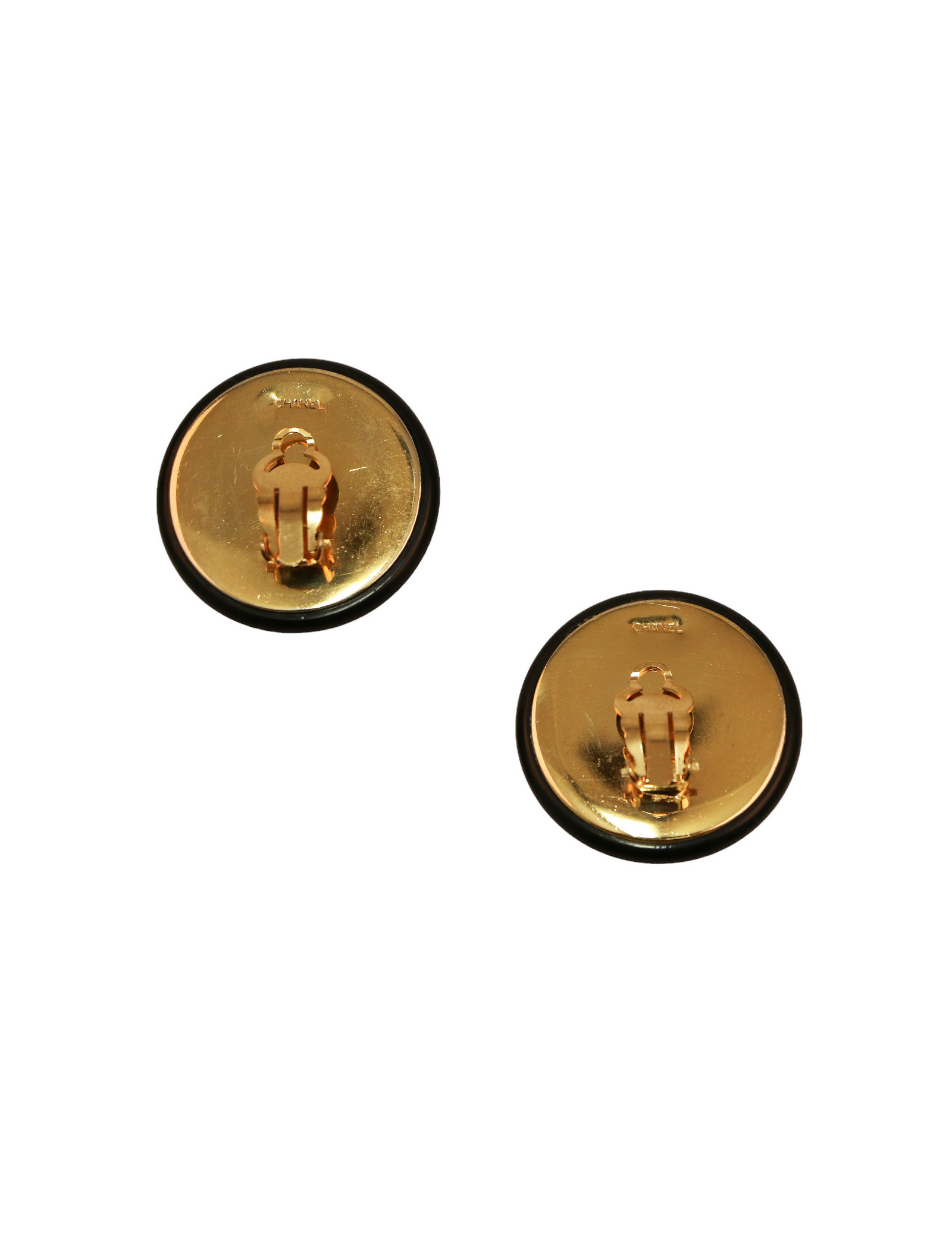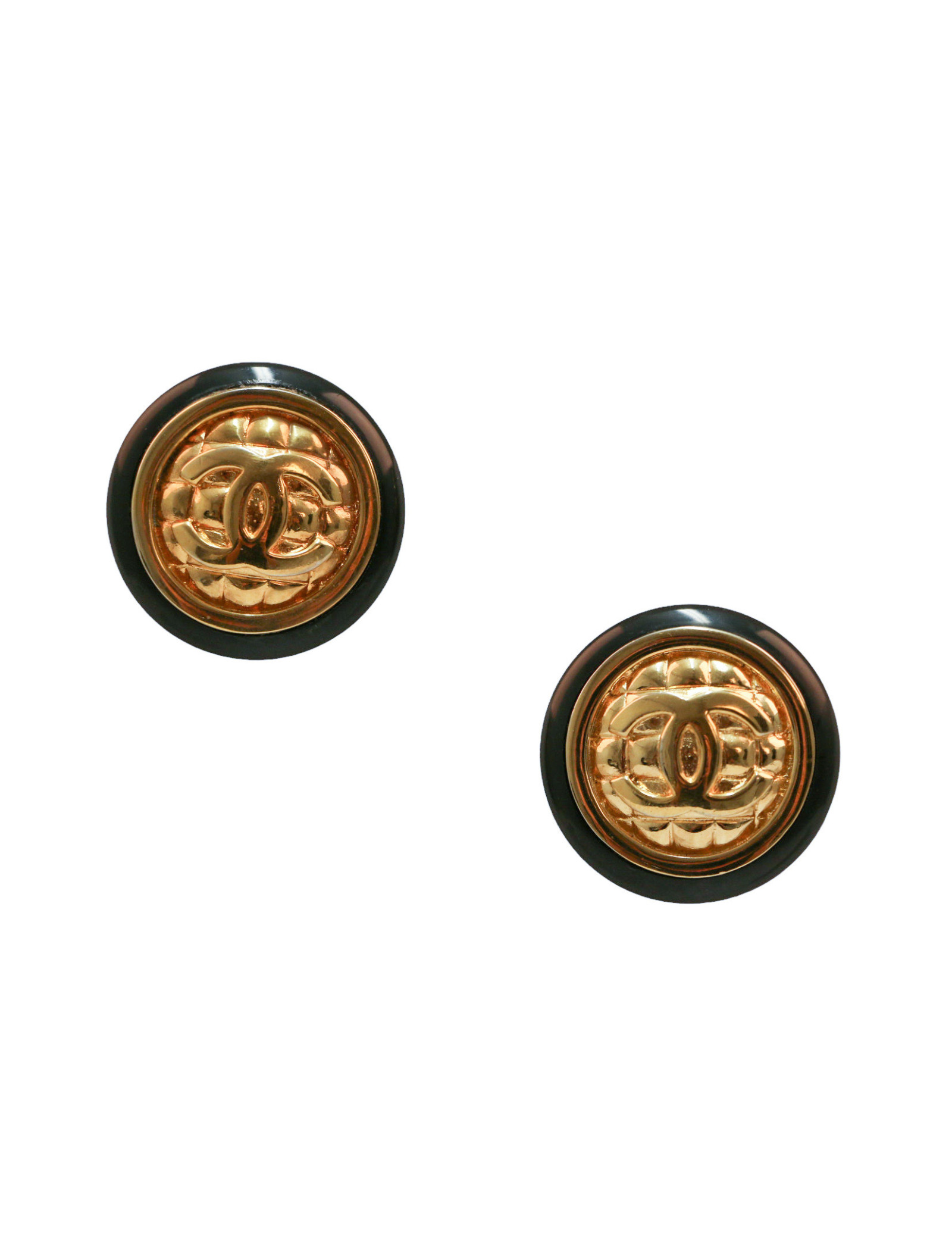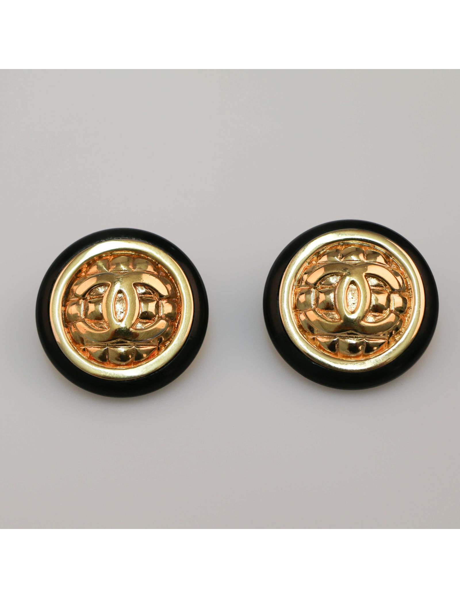 Détails : clips vintage ronds gansé de résine noire. Le coeur de chaque boucle nous rappelle le matelassage d'un sac et gros CC.