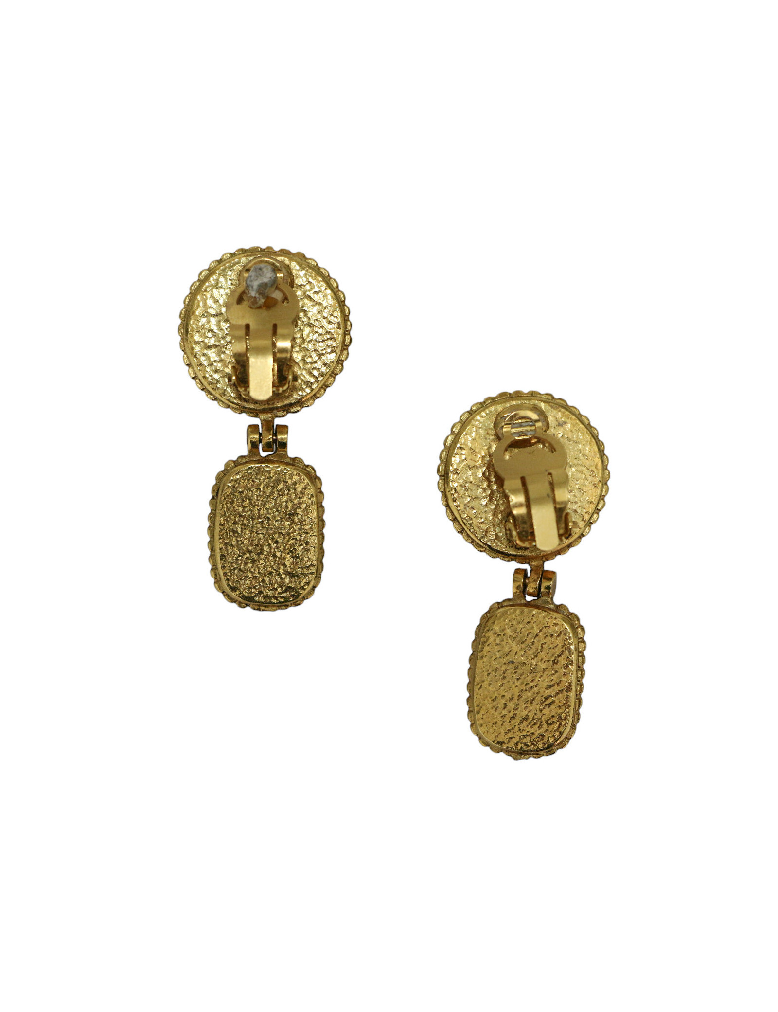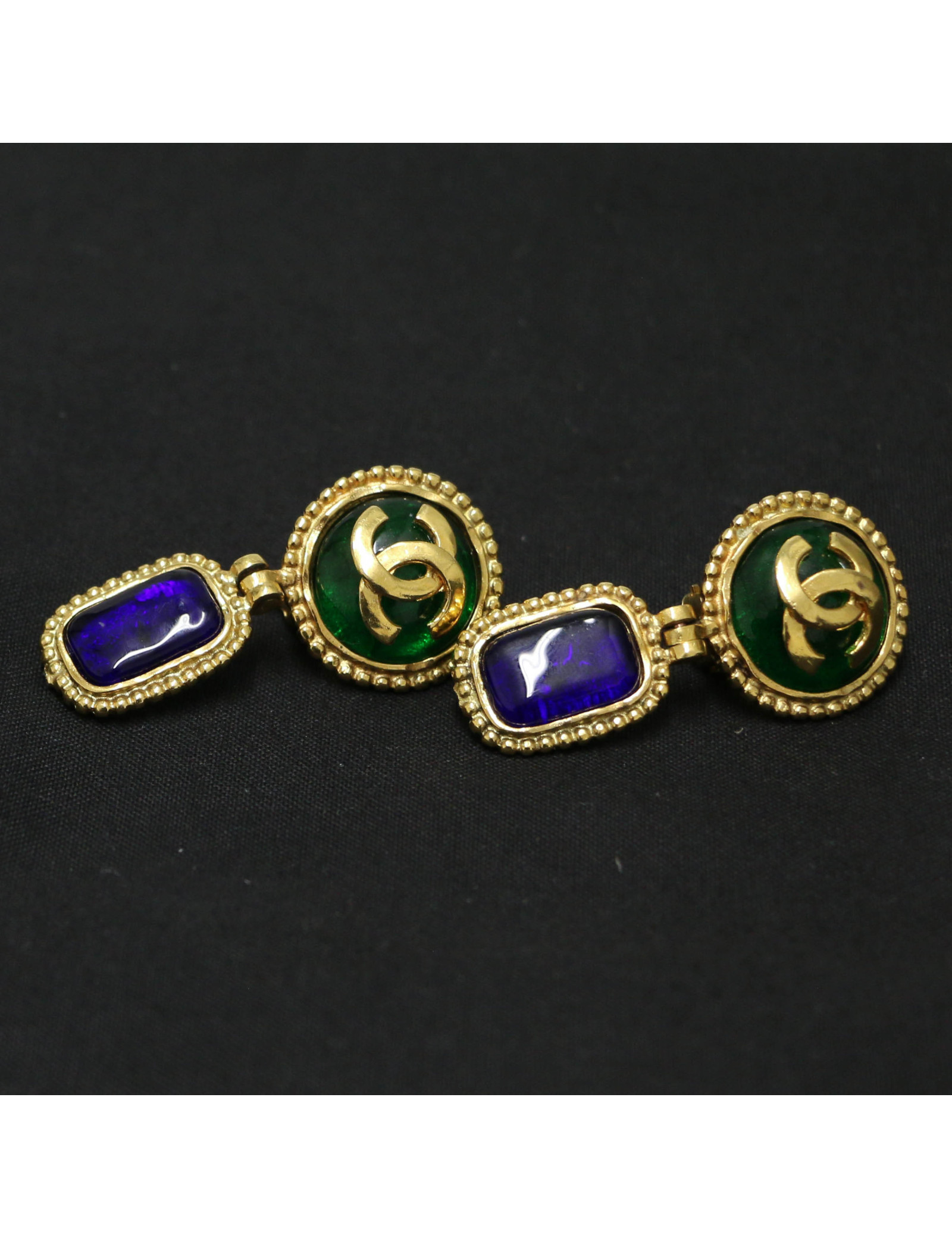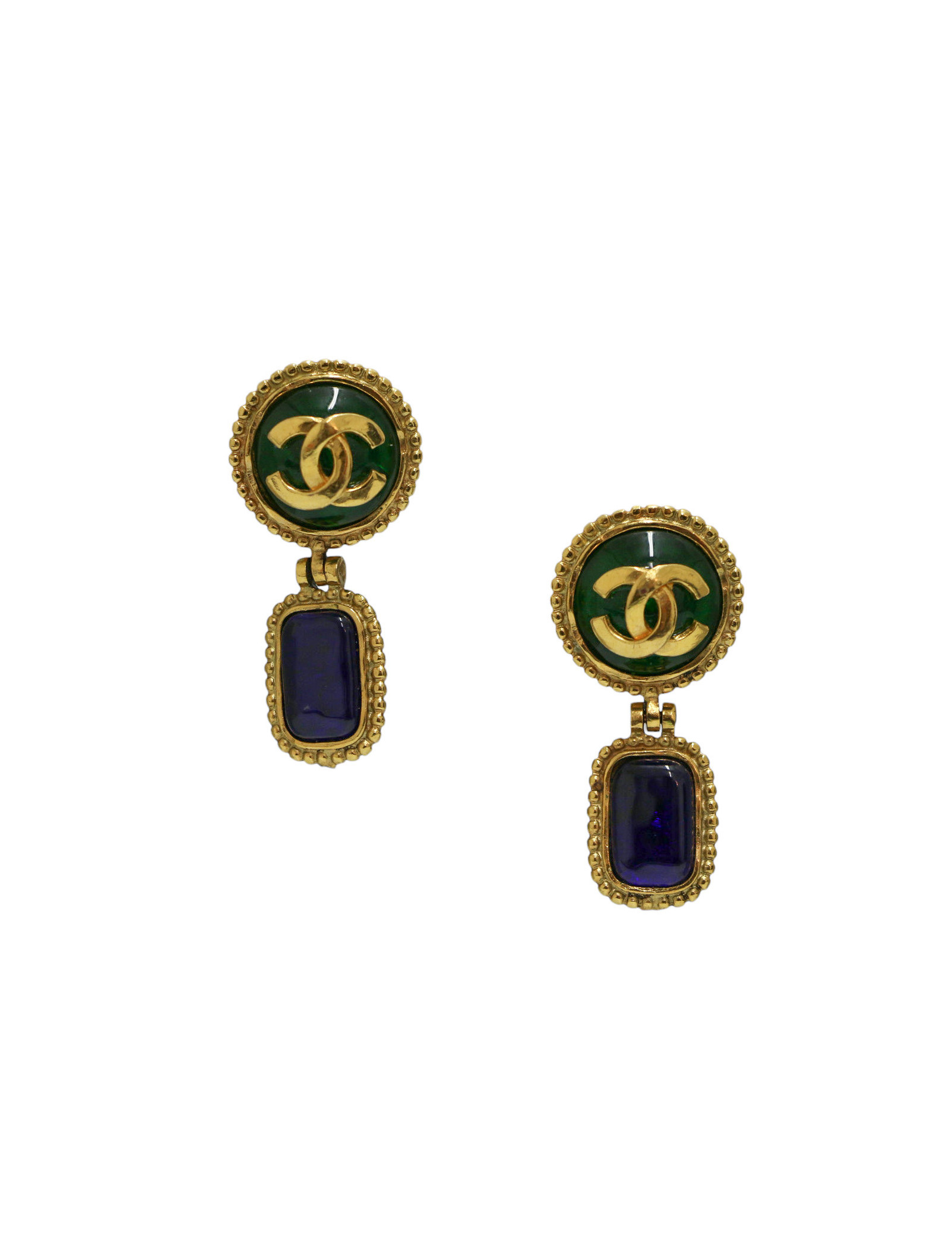Détails : clips ronds en pâte de verre verte ornée d'un logo CC doré et pendant en pâte de verre bleue