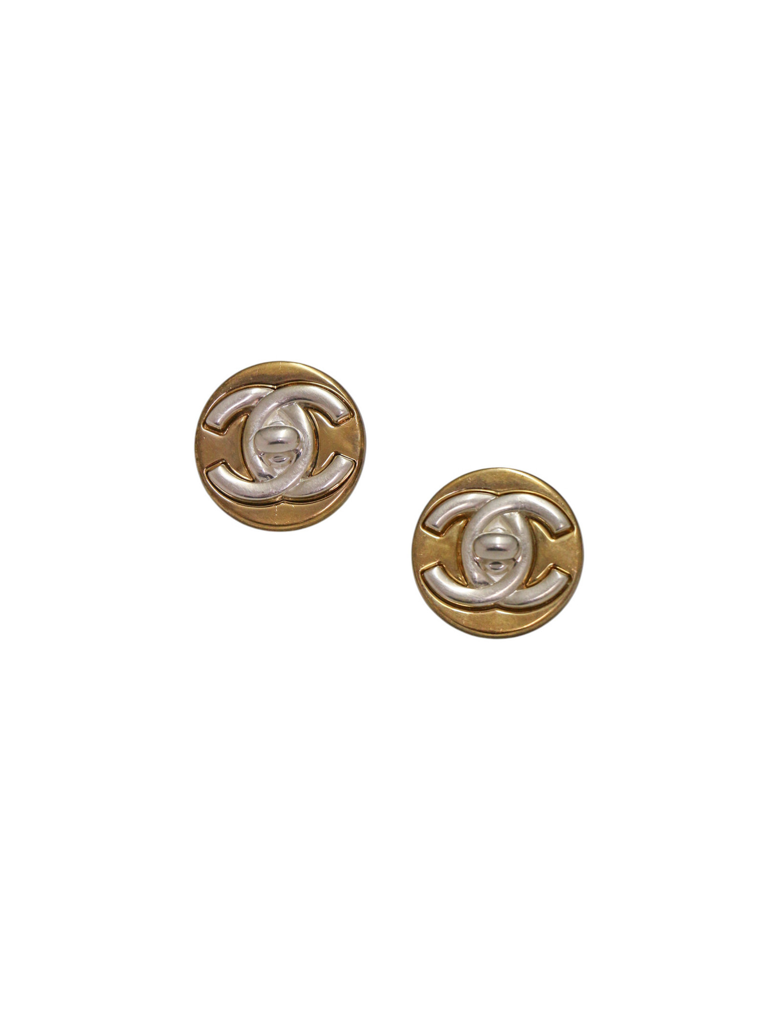 Ces boucles d’oreilles clips Chanel vintage de 1997 présentent un design rond bicolore. Elles associent un contour en métal doré au logo CC entrelacé en finition argentée au centre.