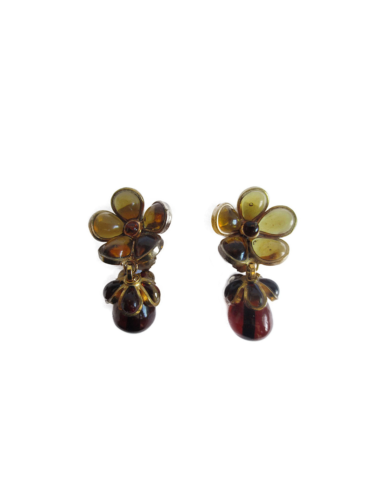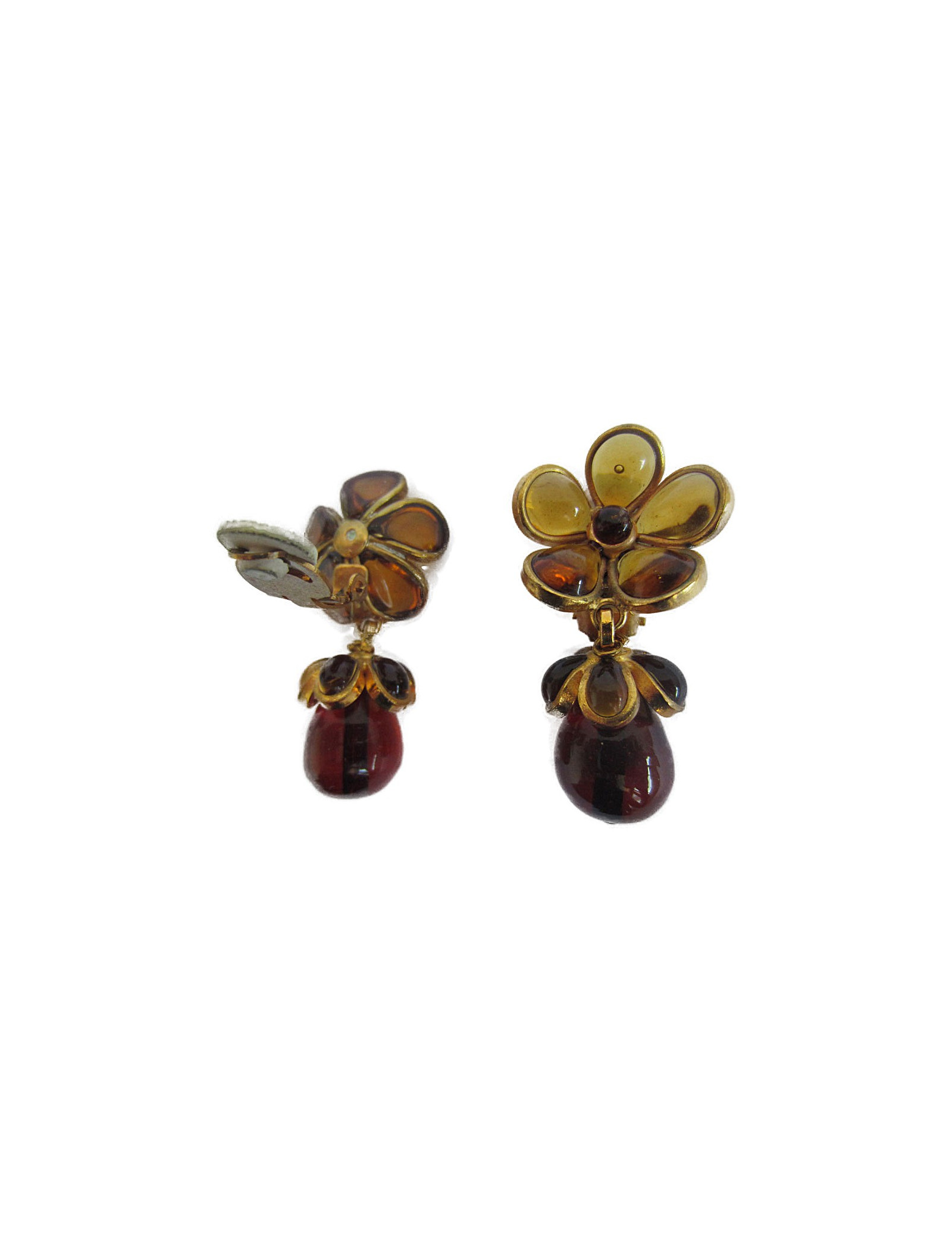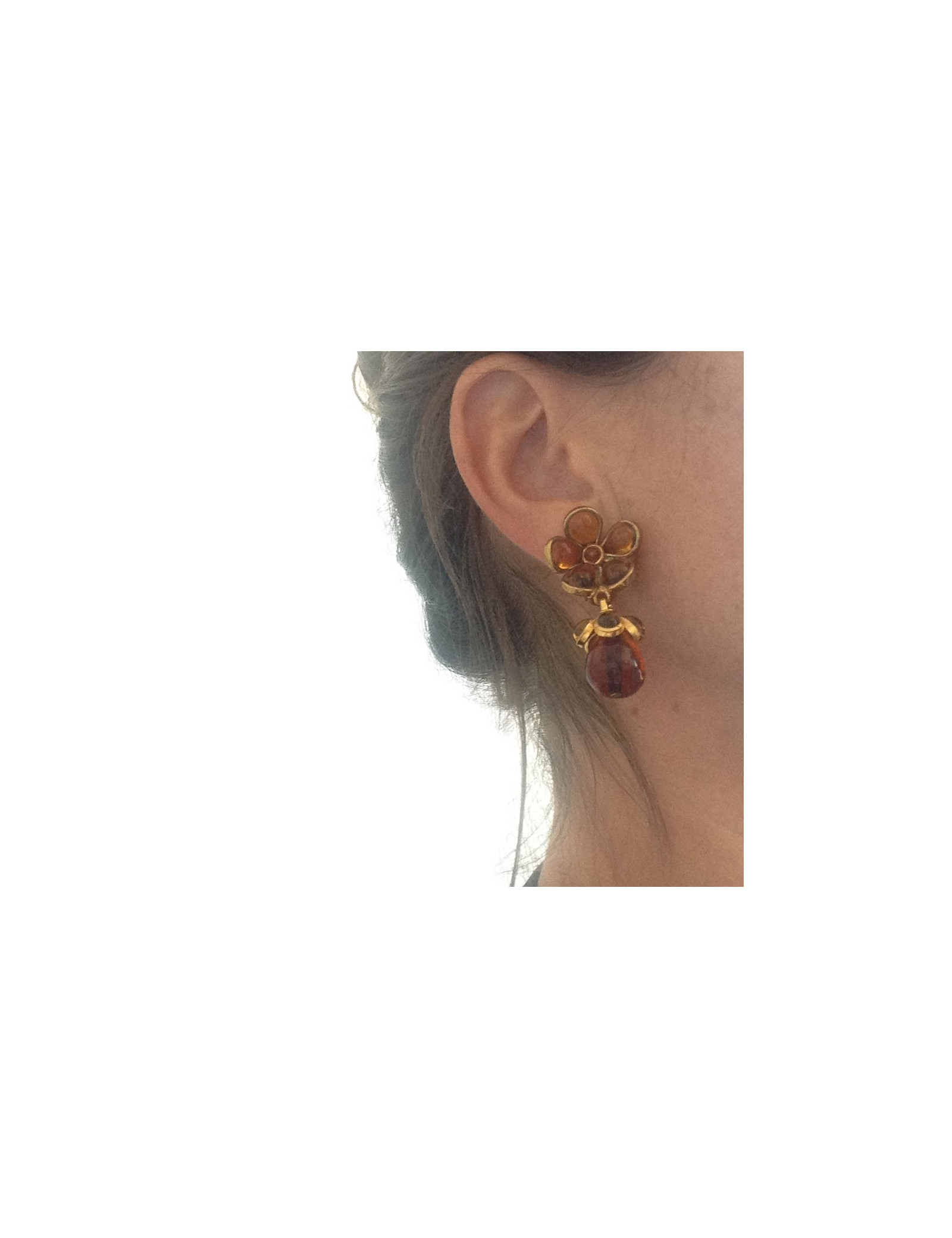 Clips d'oreilles Marguerite de Valois en pâte de verre ambre et métal doré à l'or fin. Fleurette et perle goutte en pâte de verre. Bijou Couture vintage.