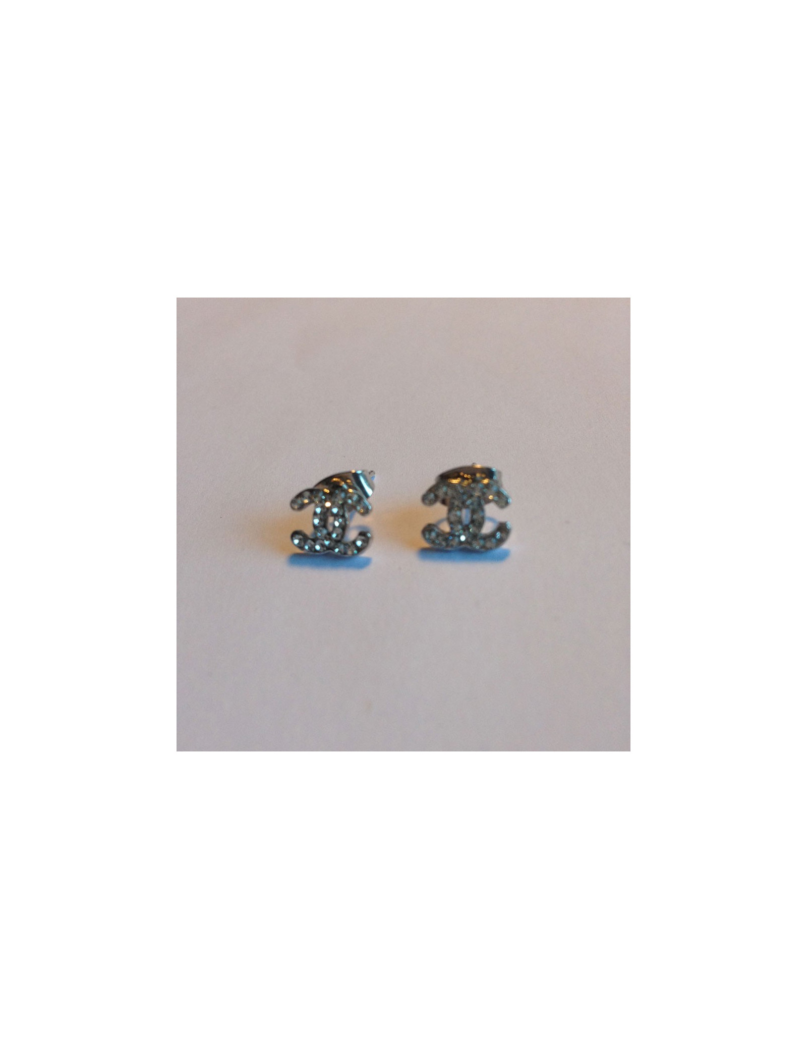 Charmants mini clous d'oreilles CC Chanel en strass et métal argenté. Jamais portés.