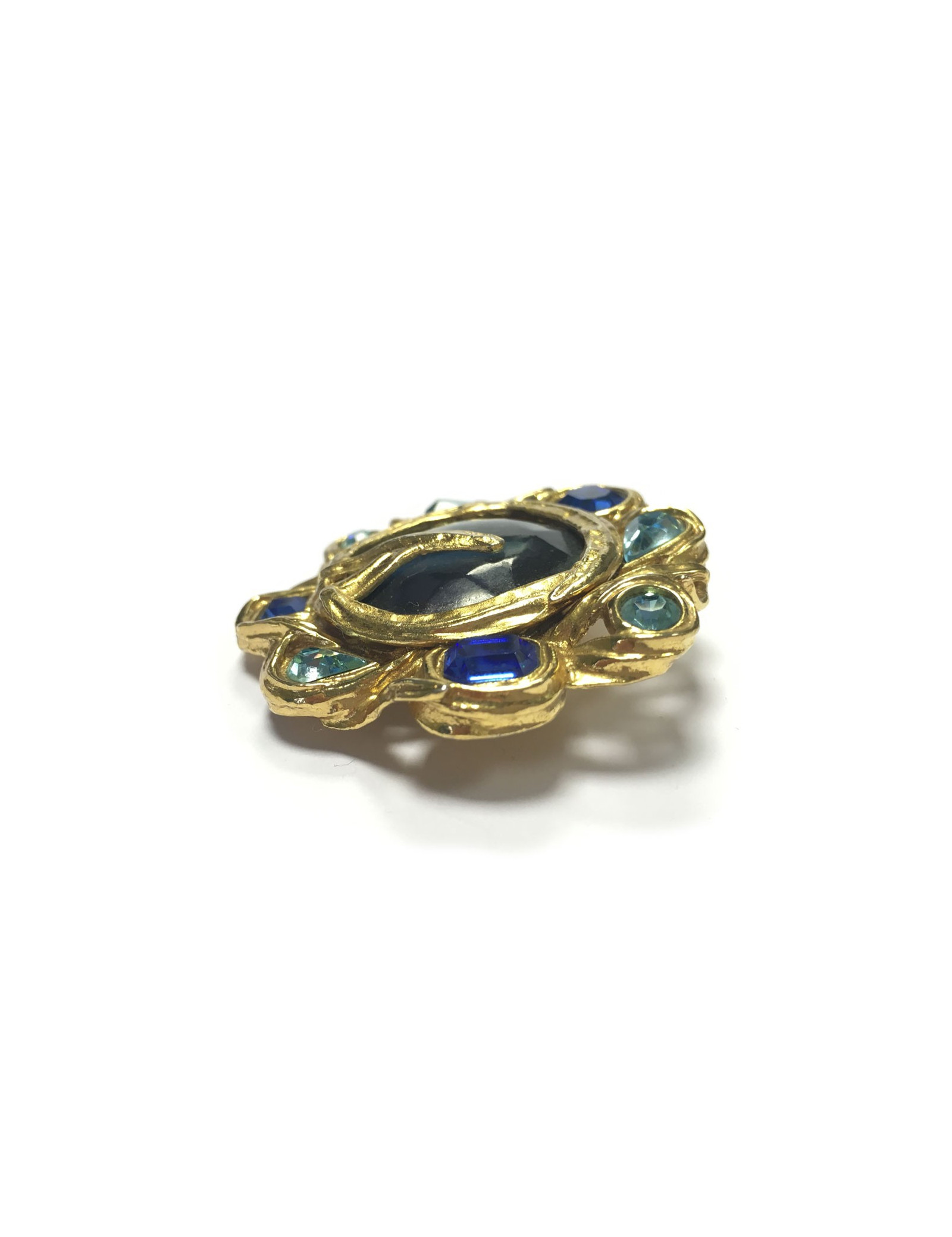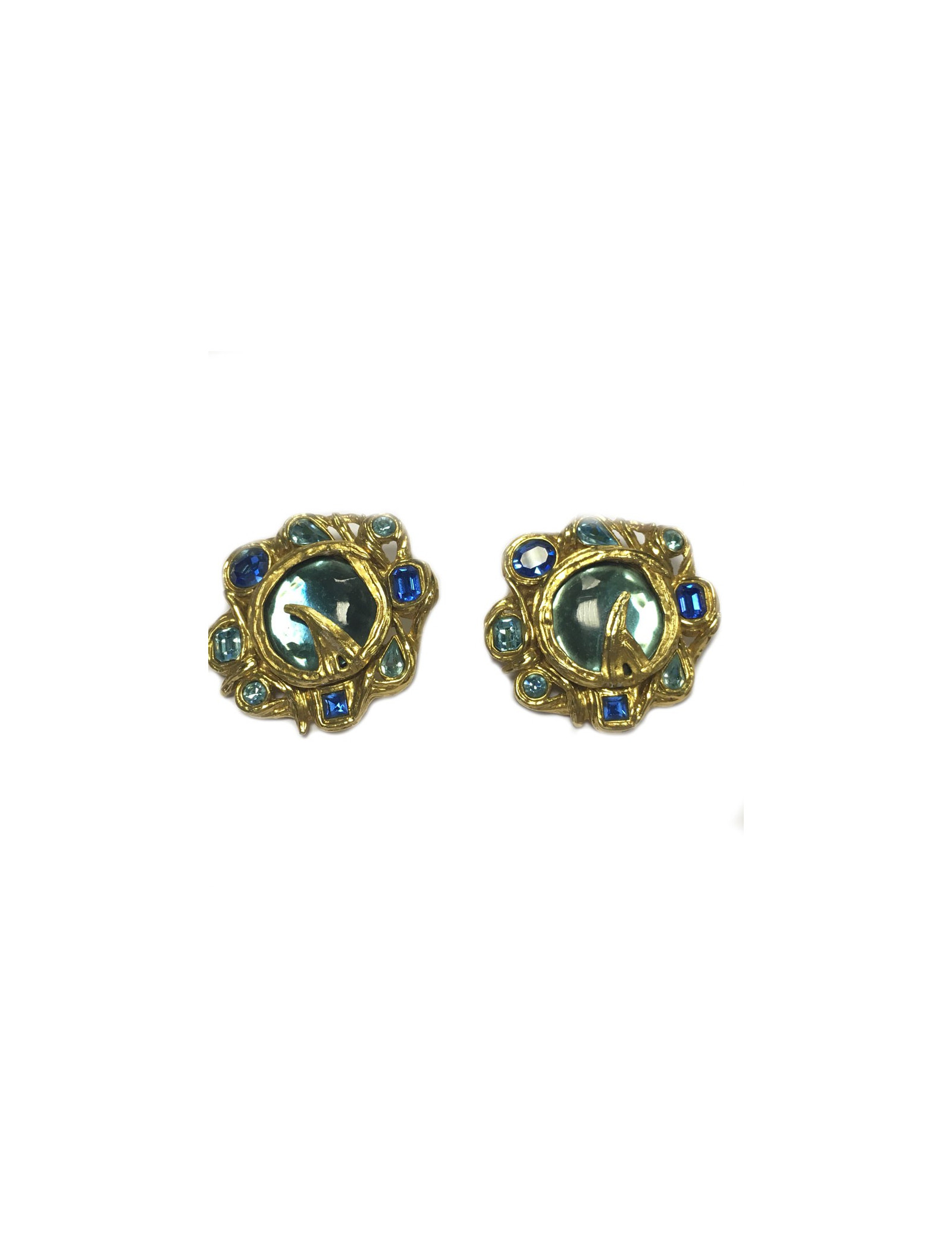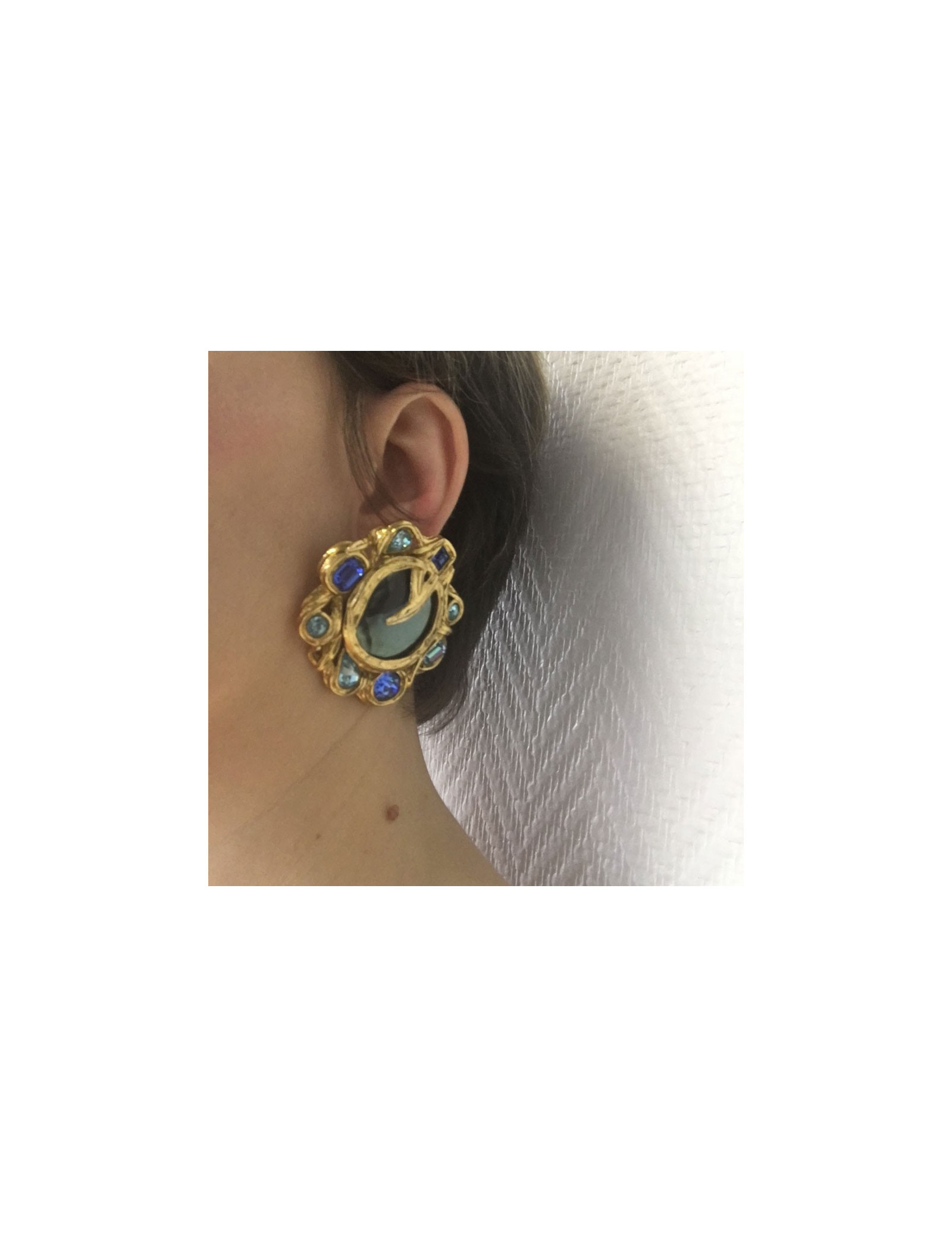 Grand clips d'oreille Collector Yves Saint Laurent en métal doré avec des pierres facettées vert et bleu et un 'Y" en métal doré. En très bon état.