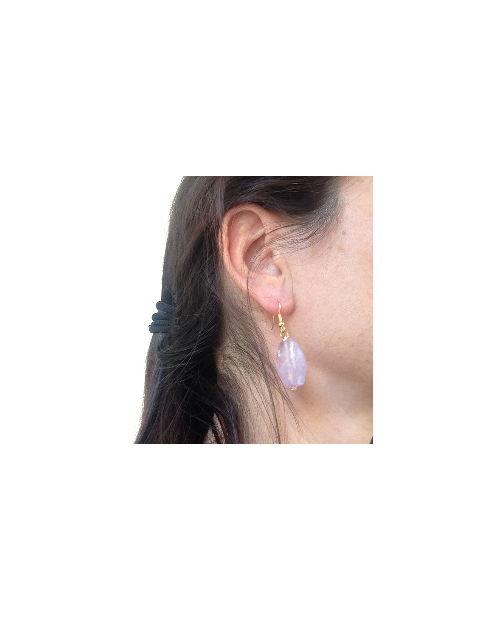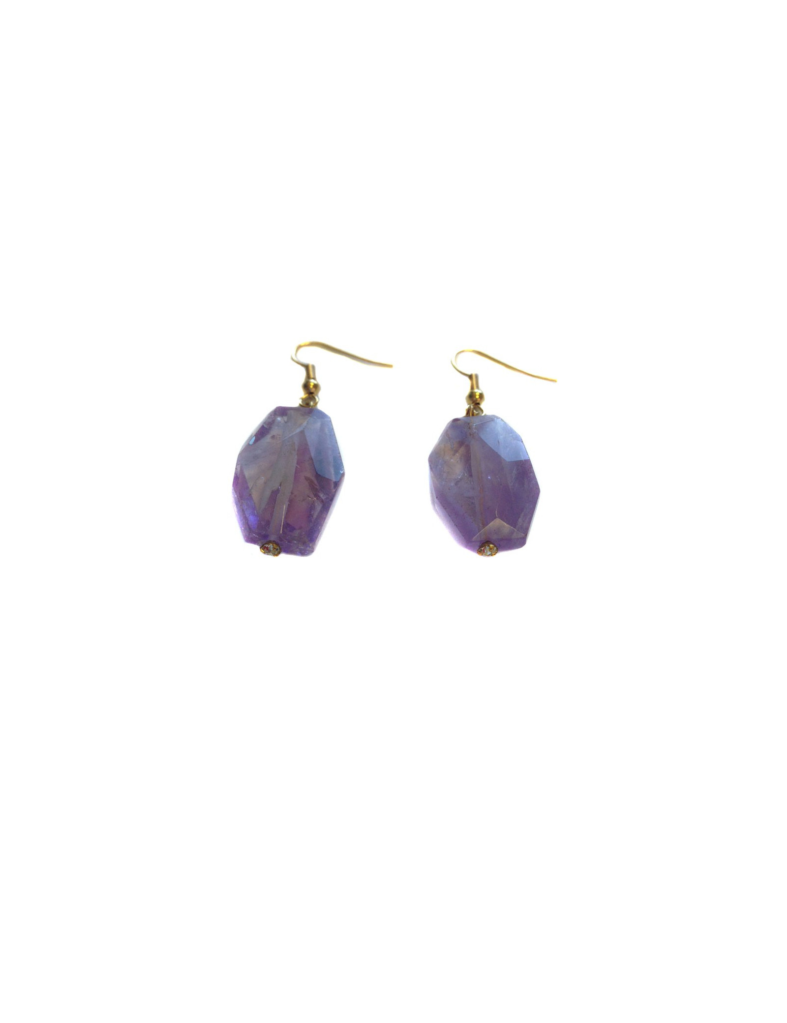 Clous pendants en améthyste clair, présentant quelques défauts naturels à l'intérieur de ces magnifiques pierres taillées. Montés sur métal doré à l'or fin.