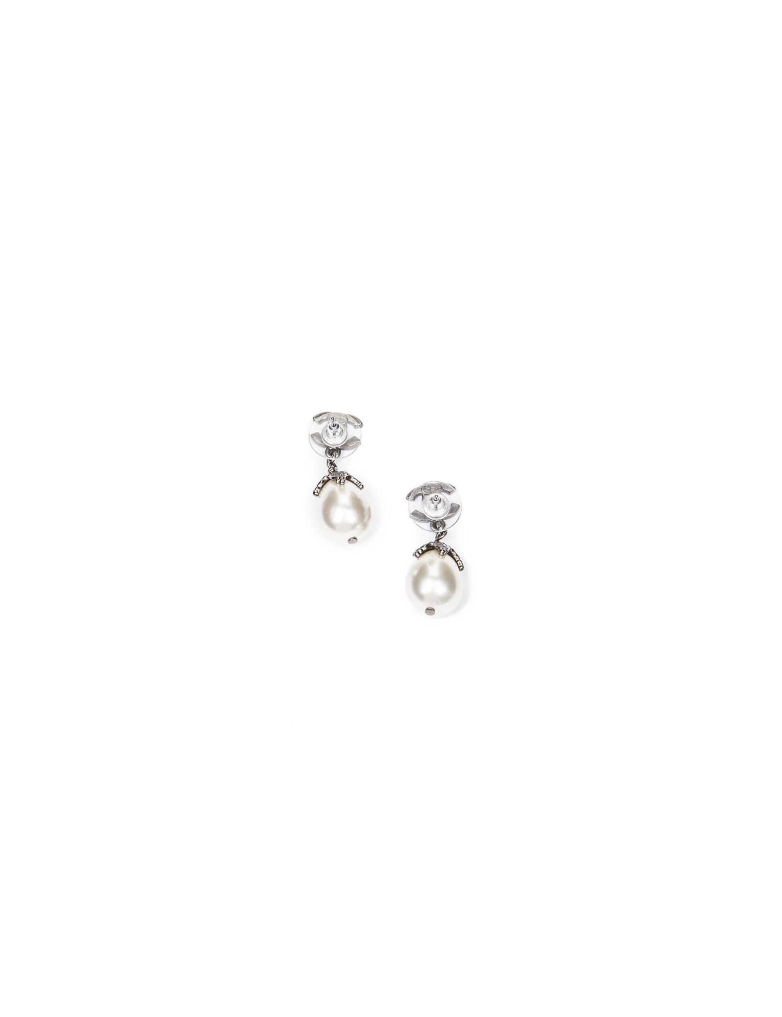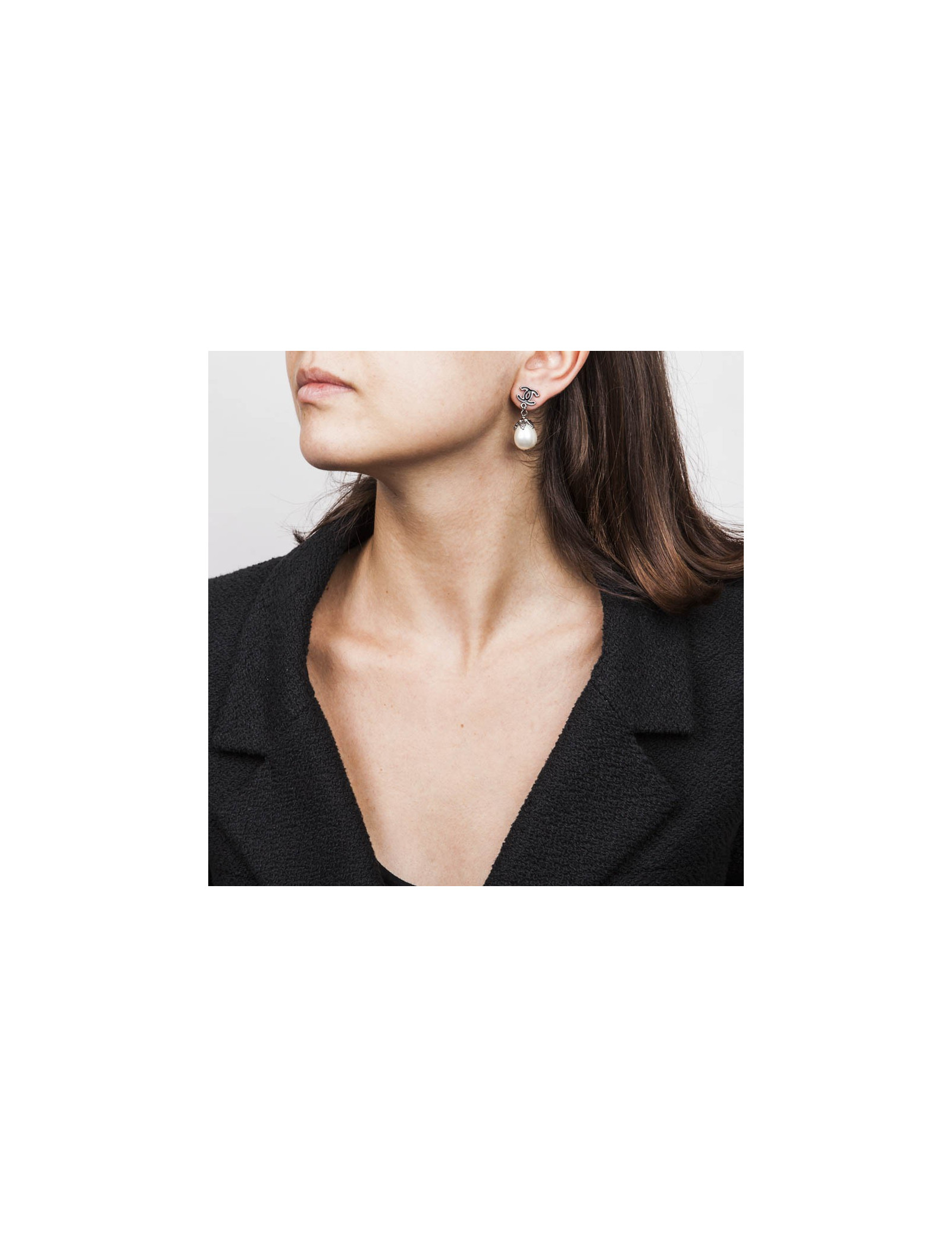 Boucles d'oreille Chanel de la collection Printemps 2011. Double "C" émaillé noir et perle nacrée ovale.