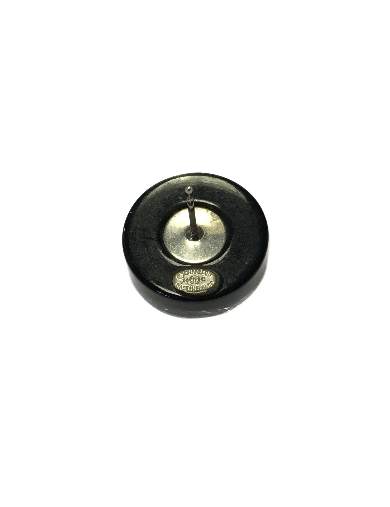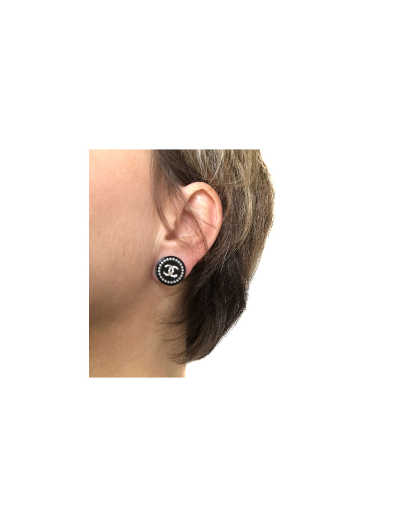 Boucles d'oreille clous CHANEL rondes en plexi noir, CC en strass petites perles. En très bon état. Au dos d'un clou la pastille CHANEL a été recollée à la glue, le plexi a été un peu altéré (voir photo).
