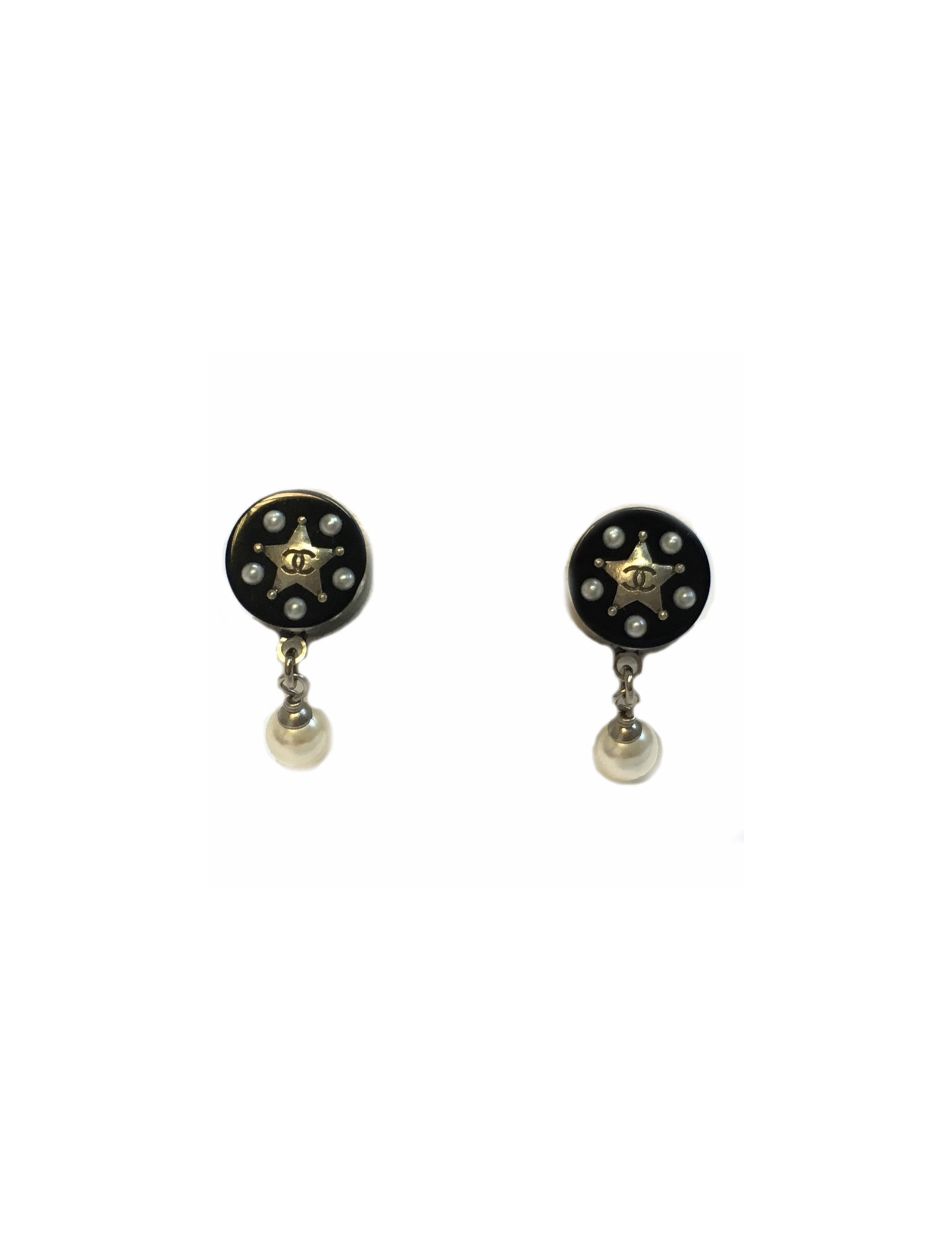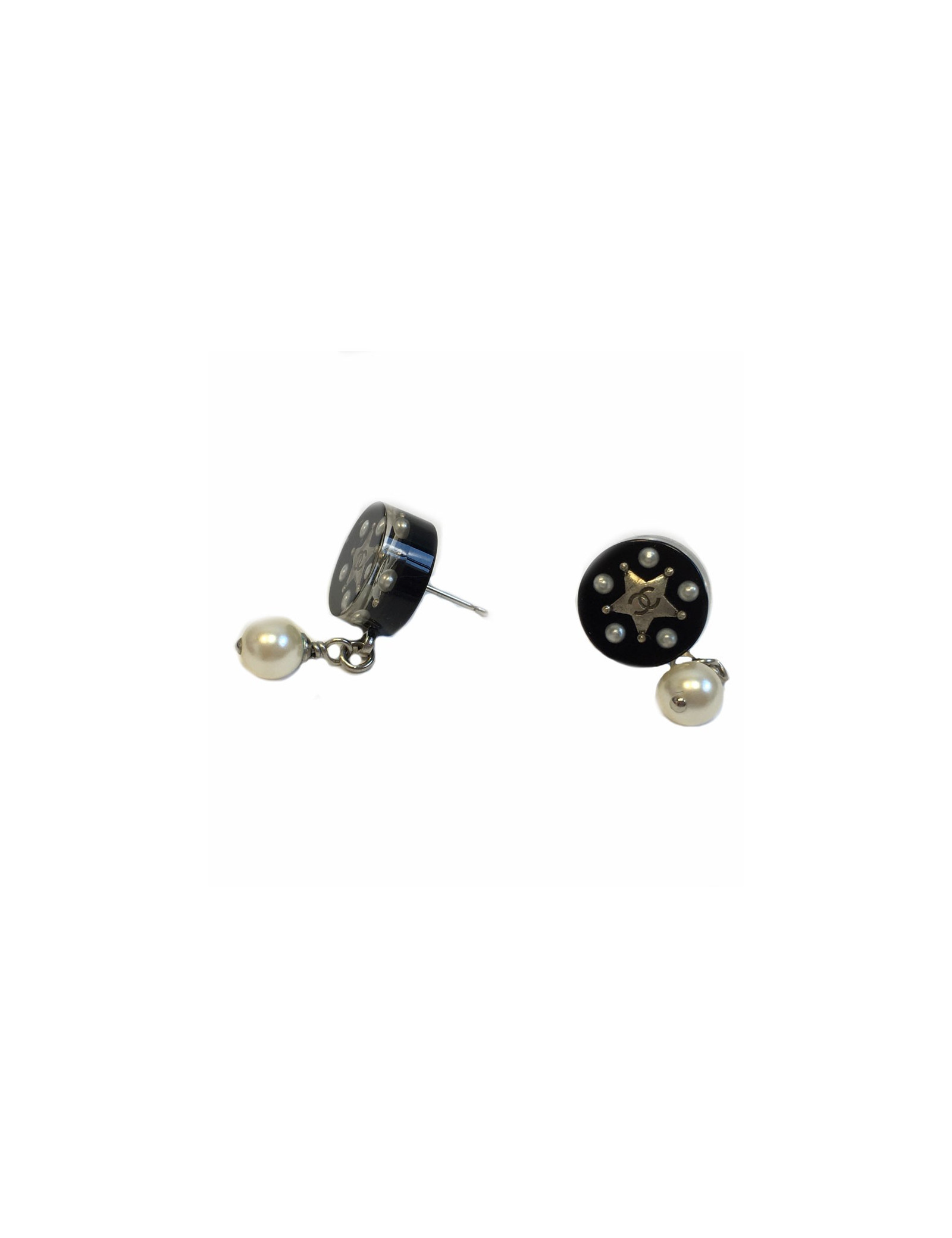 Boucles d'oreille clous ronds CHANEL en plexi transparent et noir, petite perle nacrée de la collection Paris Dallas. A l'intérieur du clou une étoile de shérif avec un CC incrusté et 5 petites perles nacrées. Une Collection 2014.