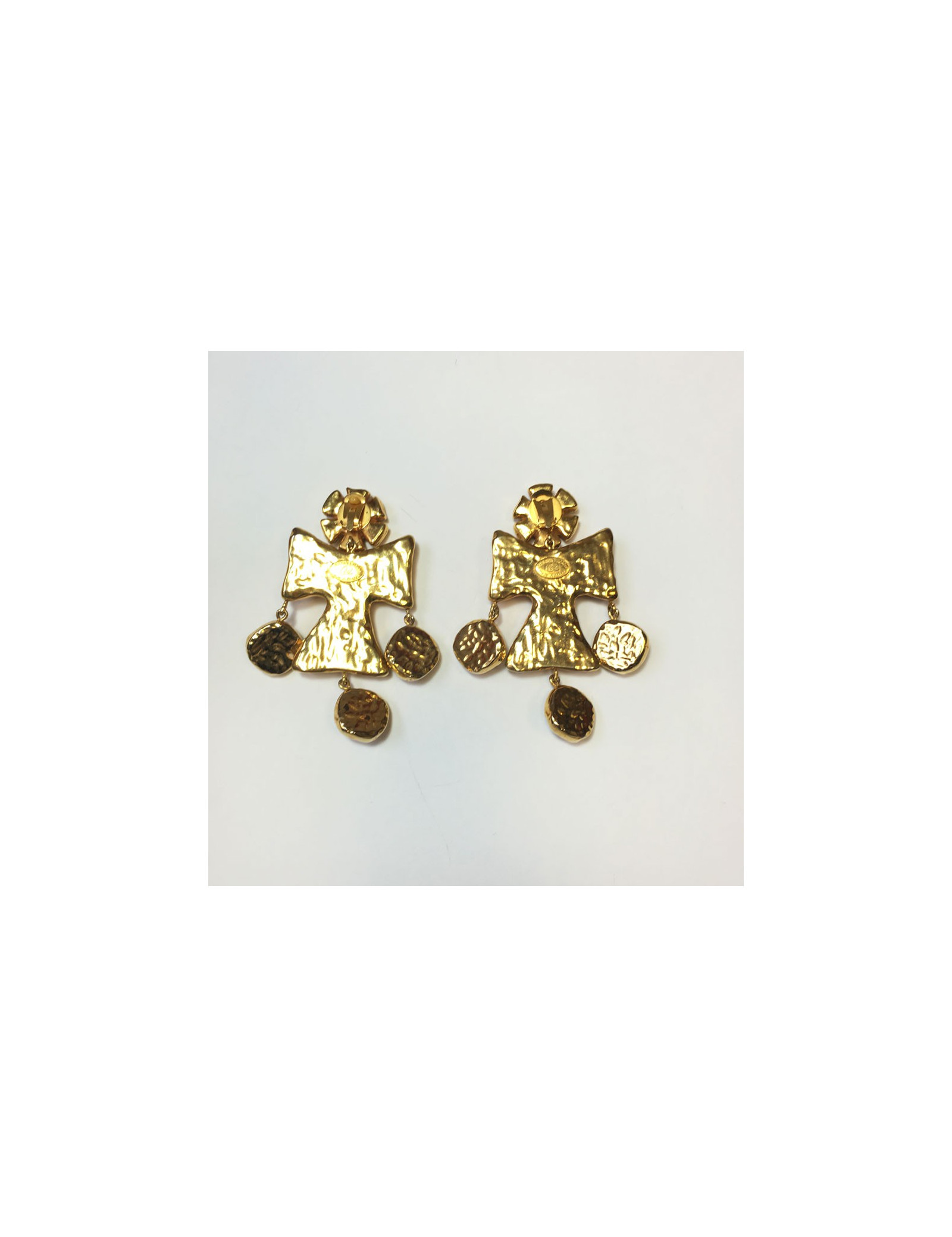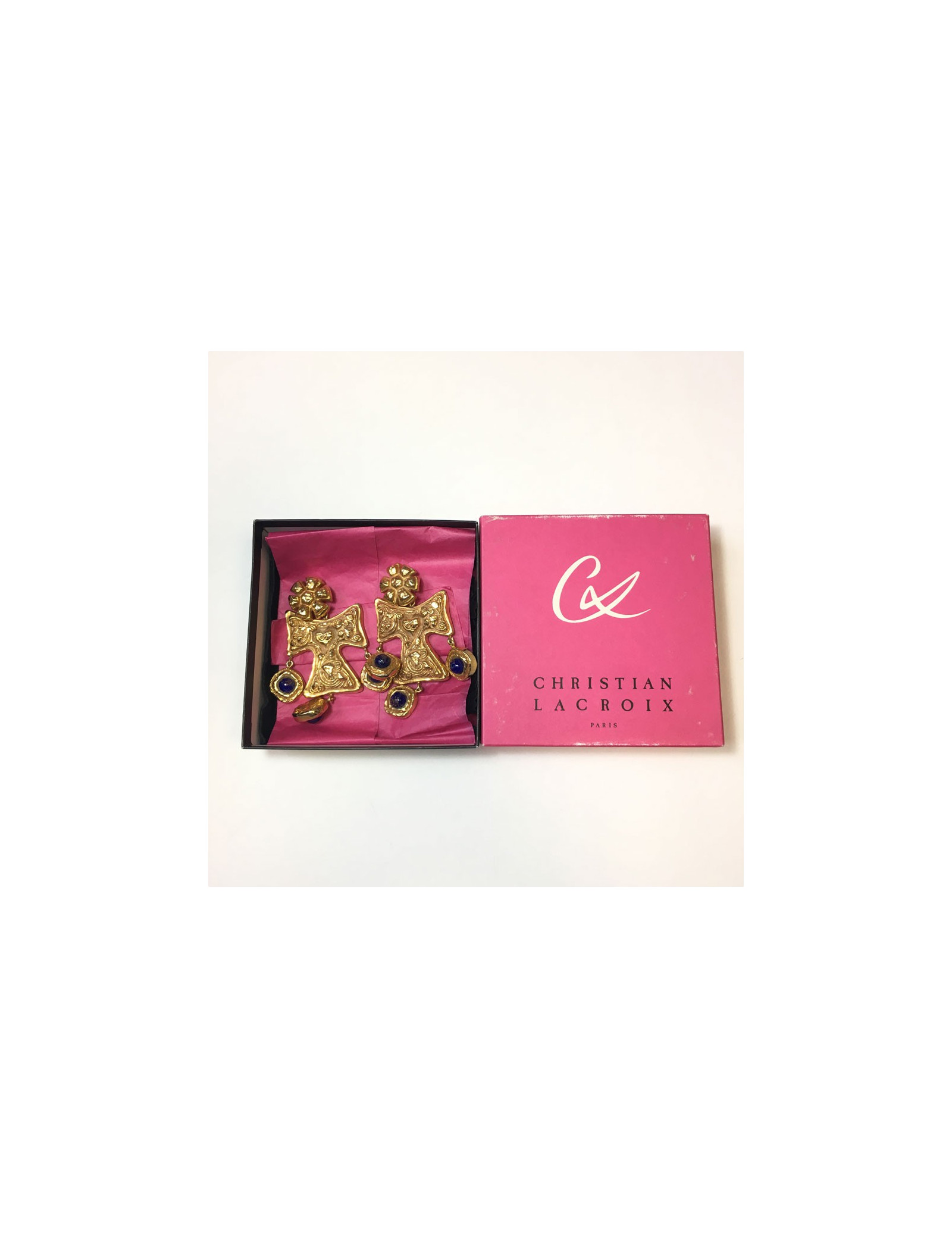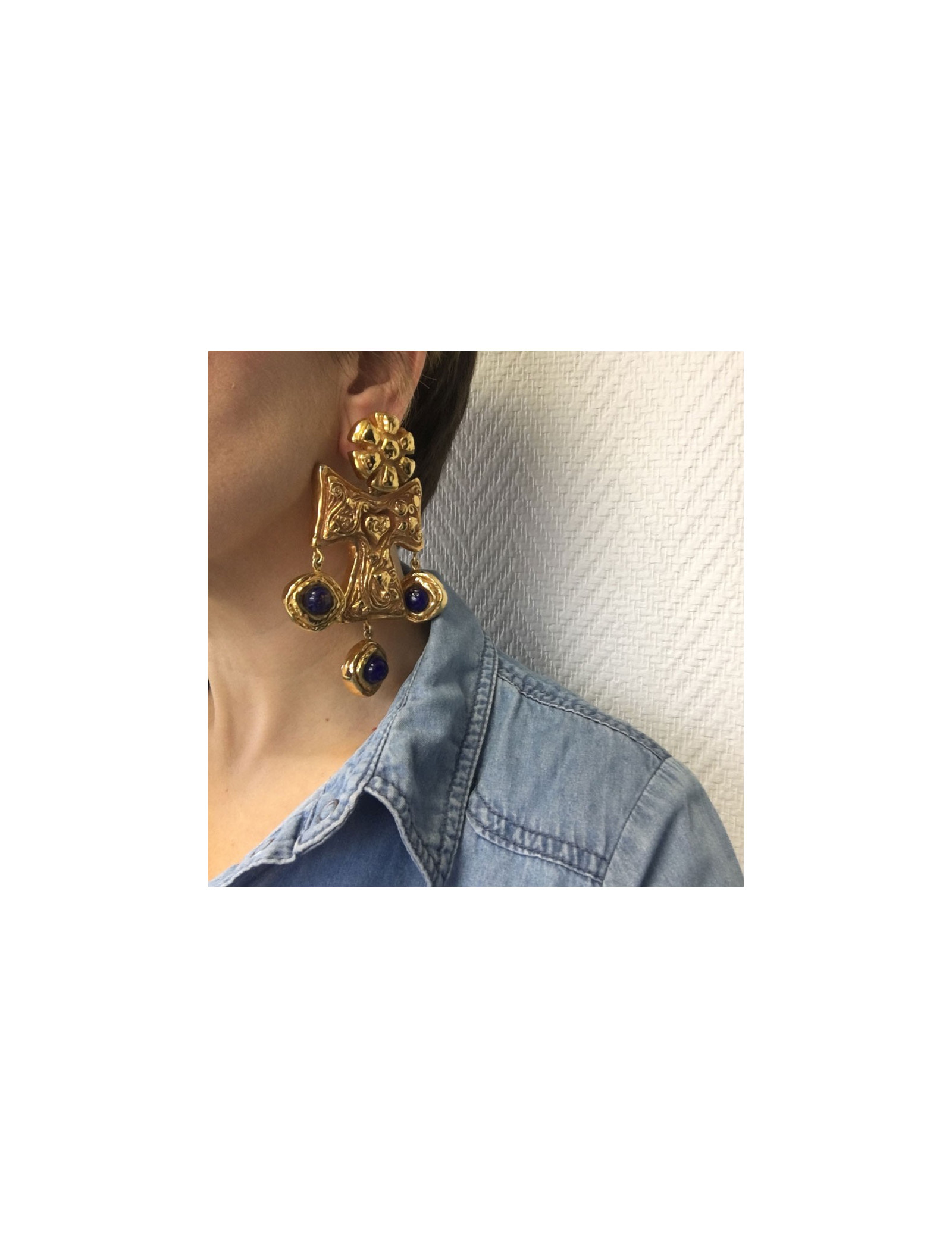 Imposantes boucles d'oreille clips CHRISTIAN LACROIX couture. En métal doré et pierre bleue pailletée or sur le dessus. En très bon état. Pastille de la marque présente au dos.
