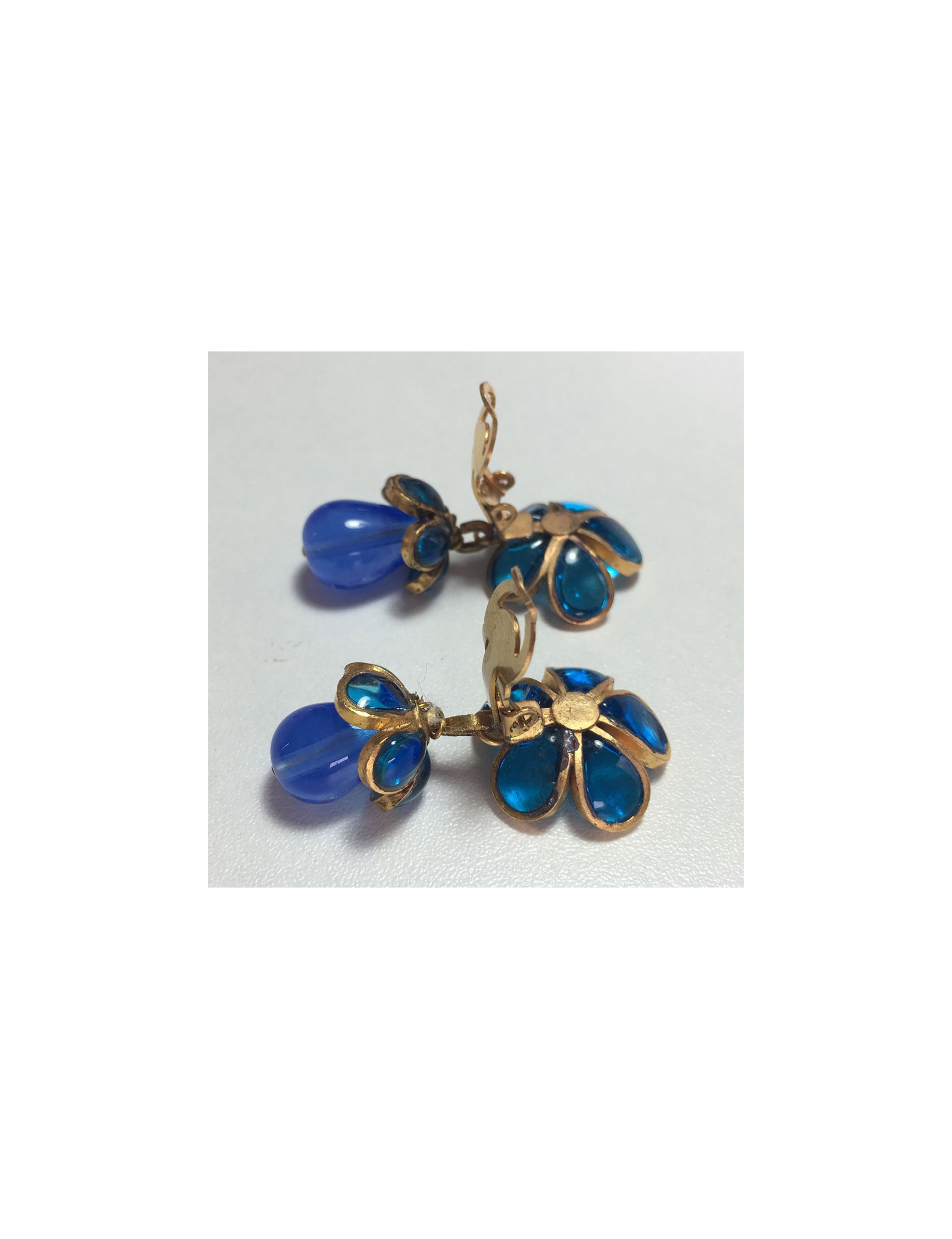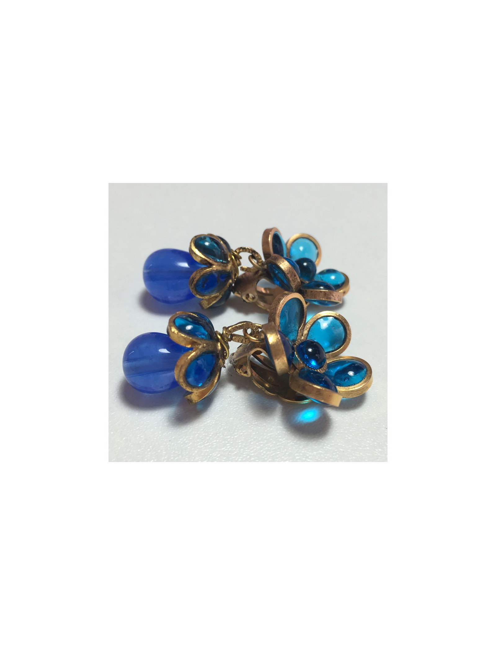 Boucles d'oreille clips d'oreilles Marguerite de Valois en pâte de verre bleue et métal doré à l'or fin. Fleurette et perle goutte en pâte de verre. Bijou Couture vintage.