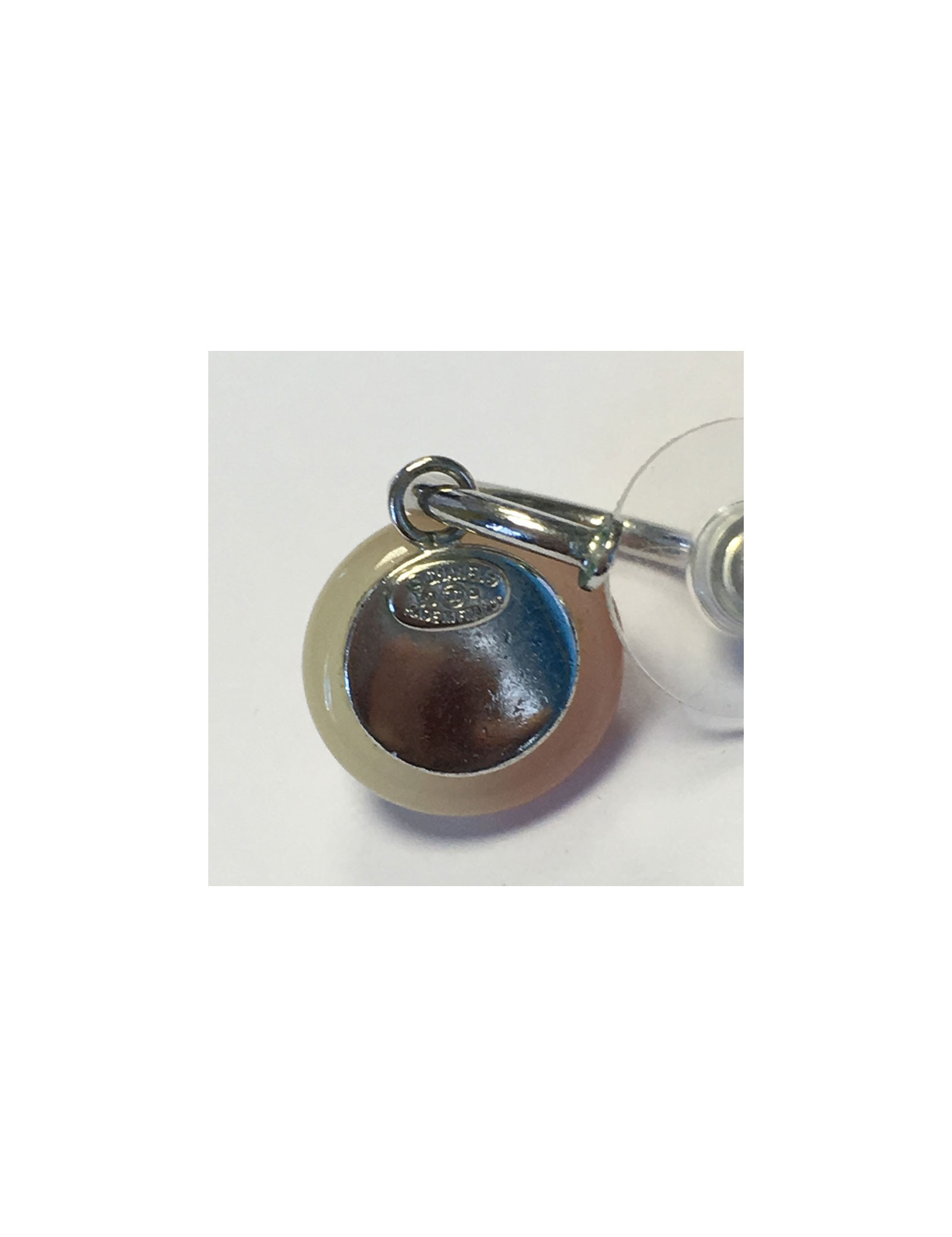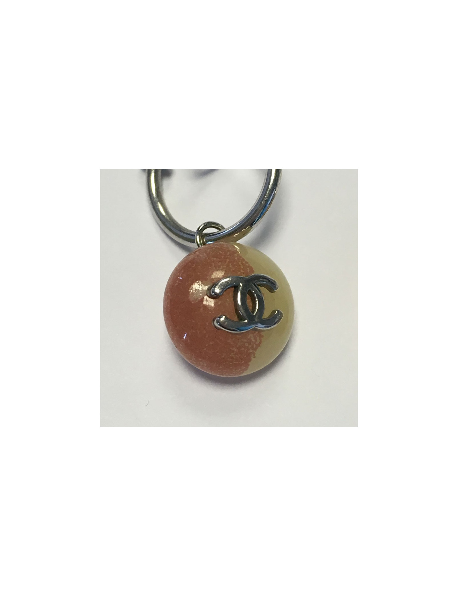 Boucles d'oreille clous CHANEL en métal argenté et demi sphère beige et rose. CC argenté sur le dessus. Un petit éclat sur un des clous (voir photo).