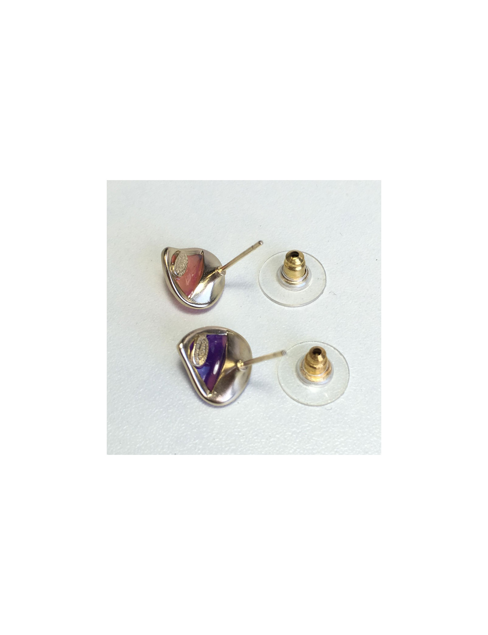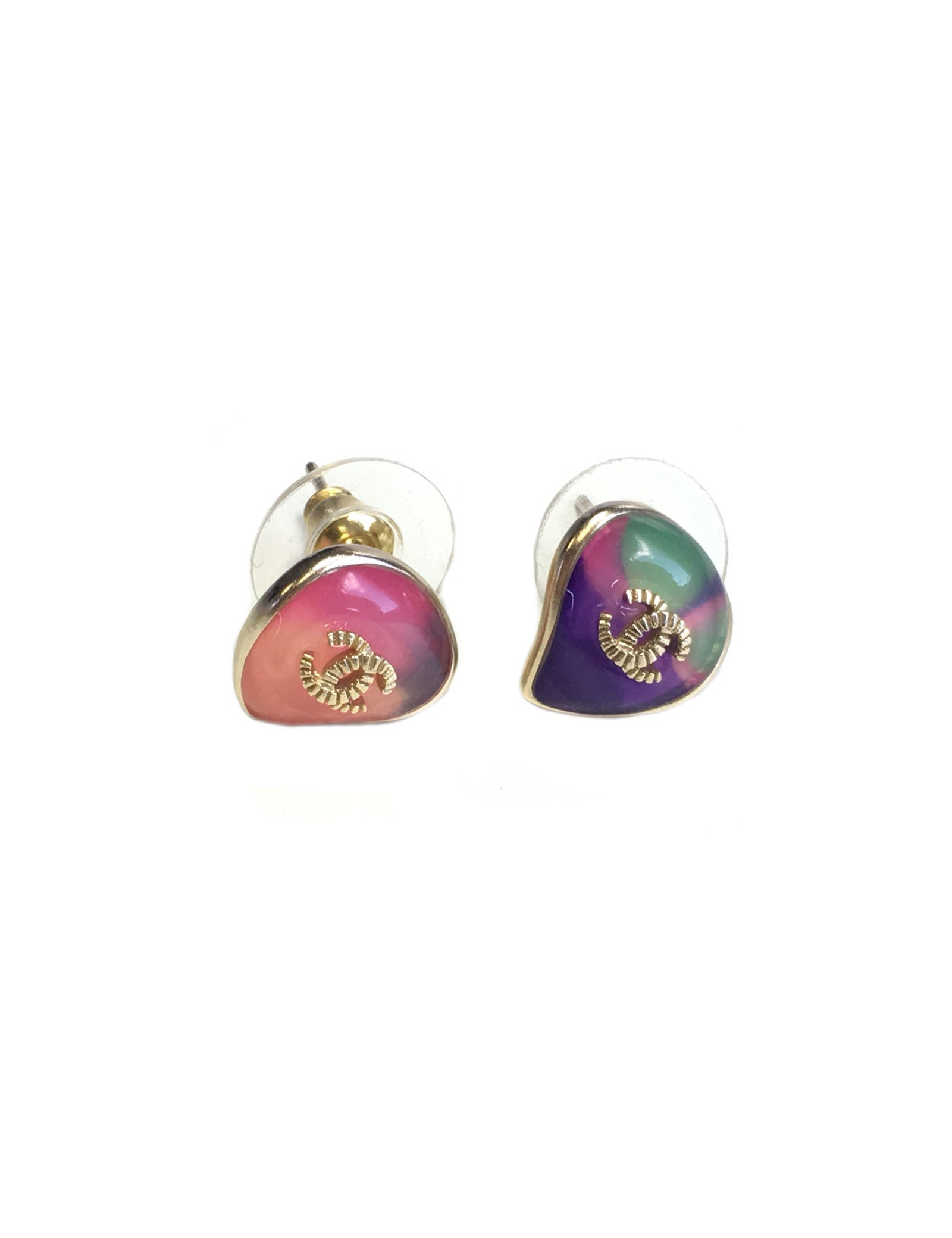 Belle paire de boucles d'oreille clous CHANEL en métal doré et résine multicolore. Petit CC doré au centre de la boucle.