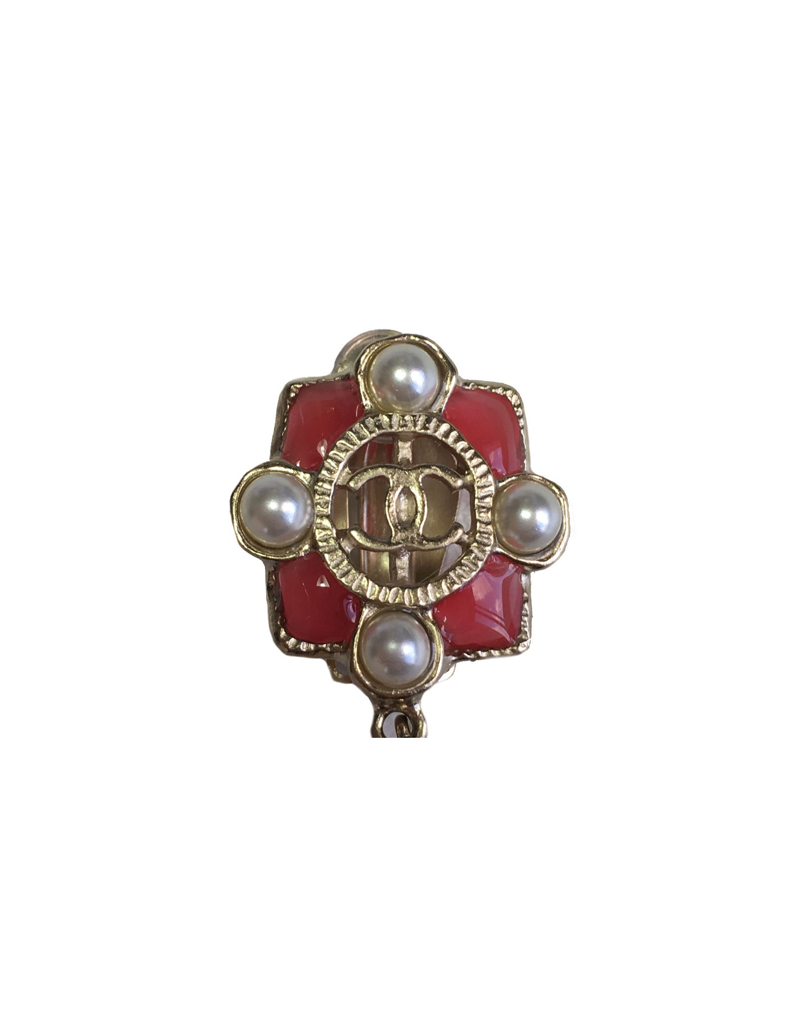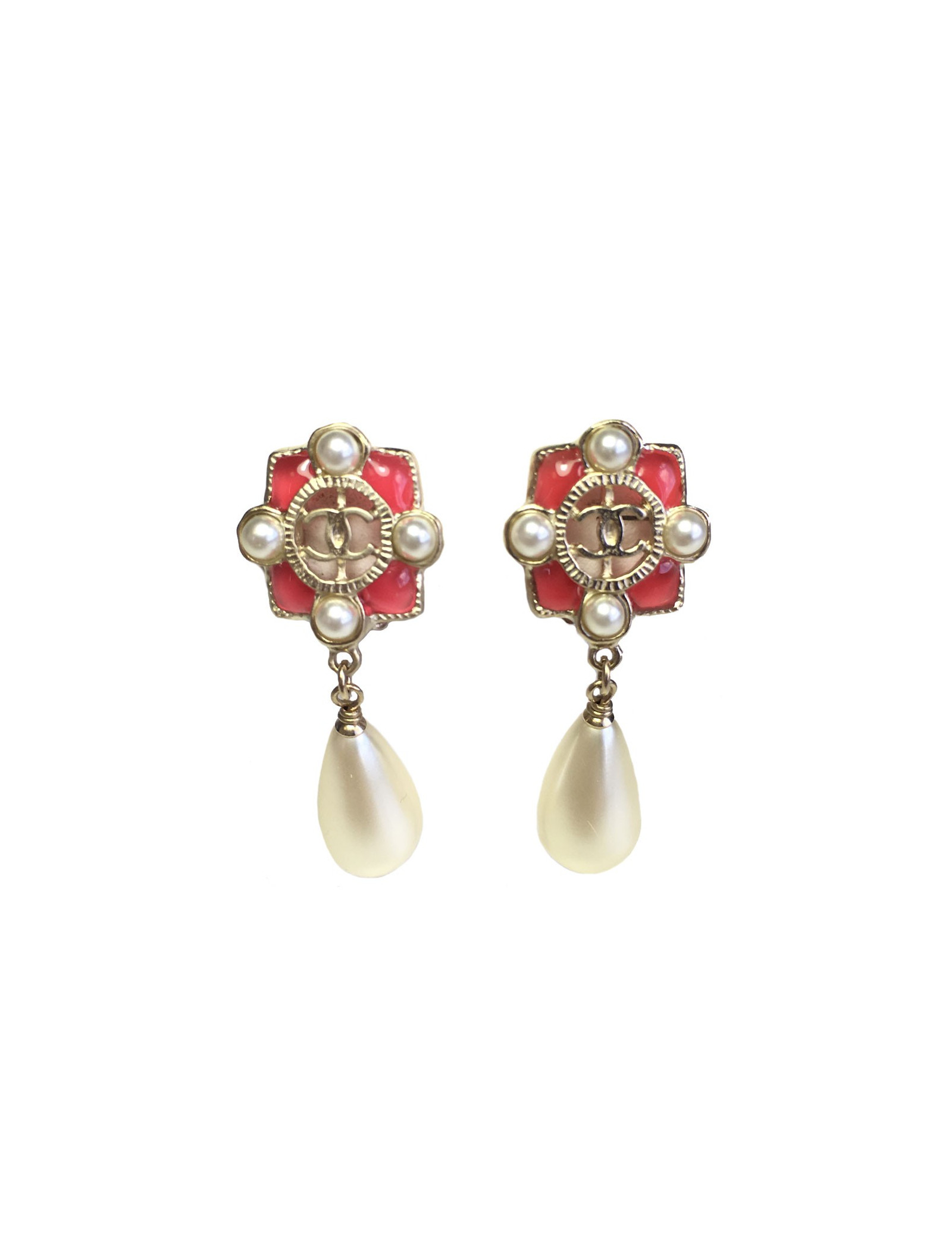 Boucles d'oreille clips CHANEL pendants. En résine rose, perle nacrée en forme de goutte, 4 petites perles nacrées, un CC doré.