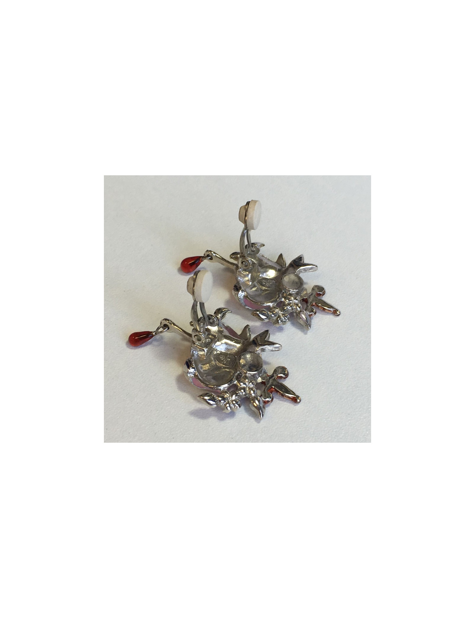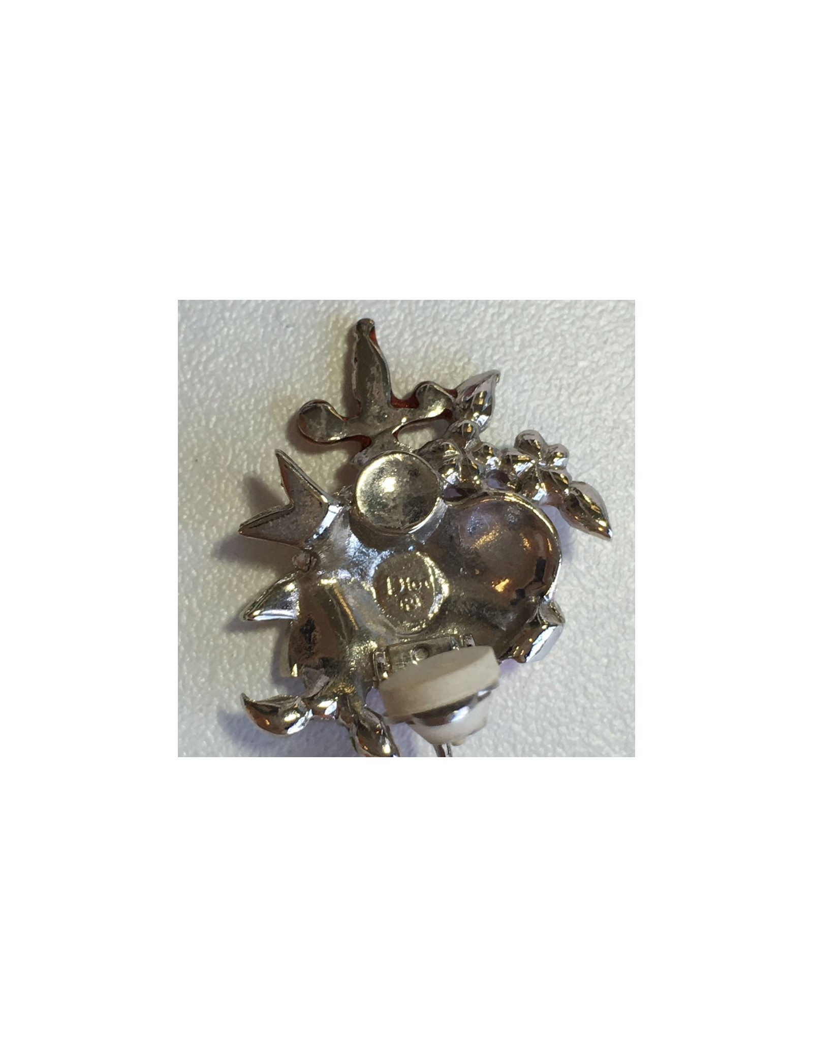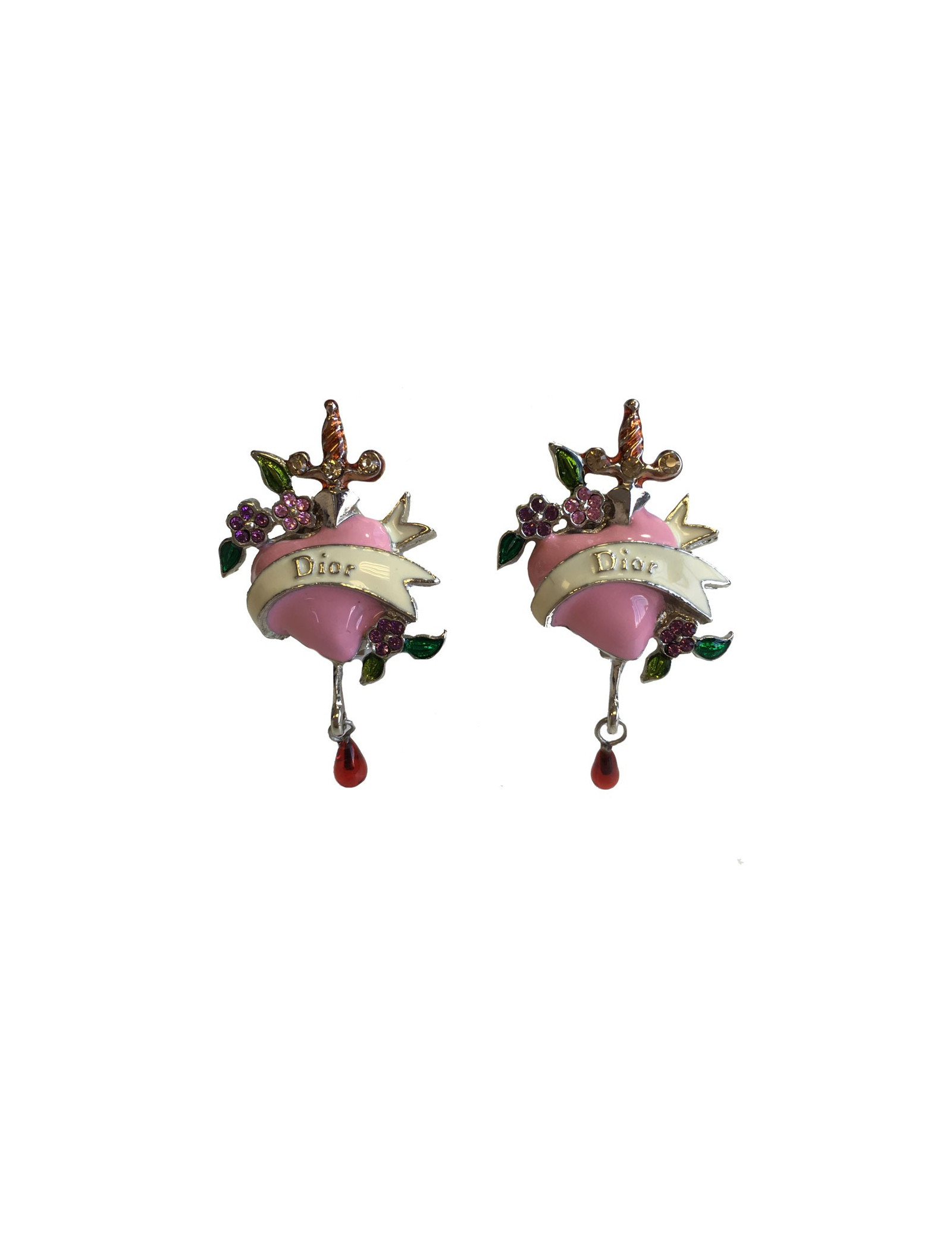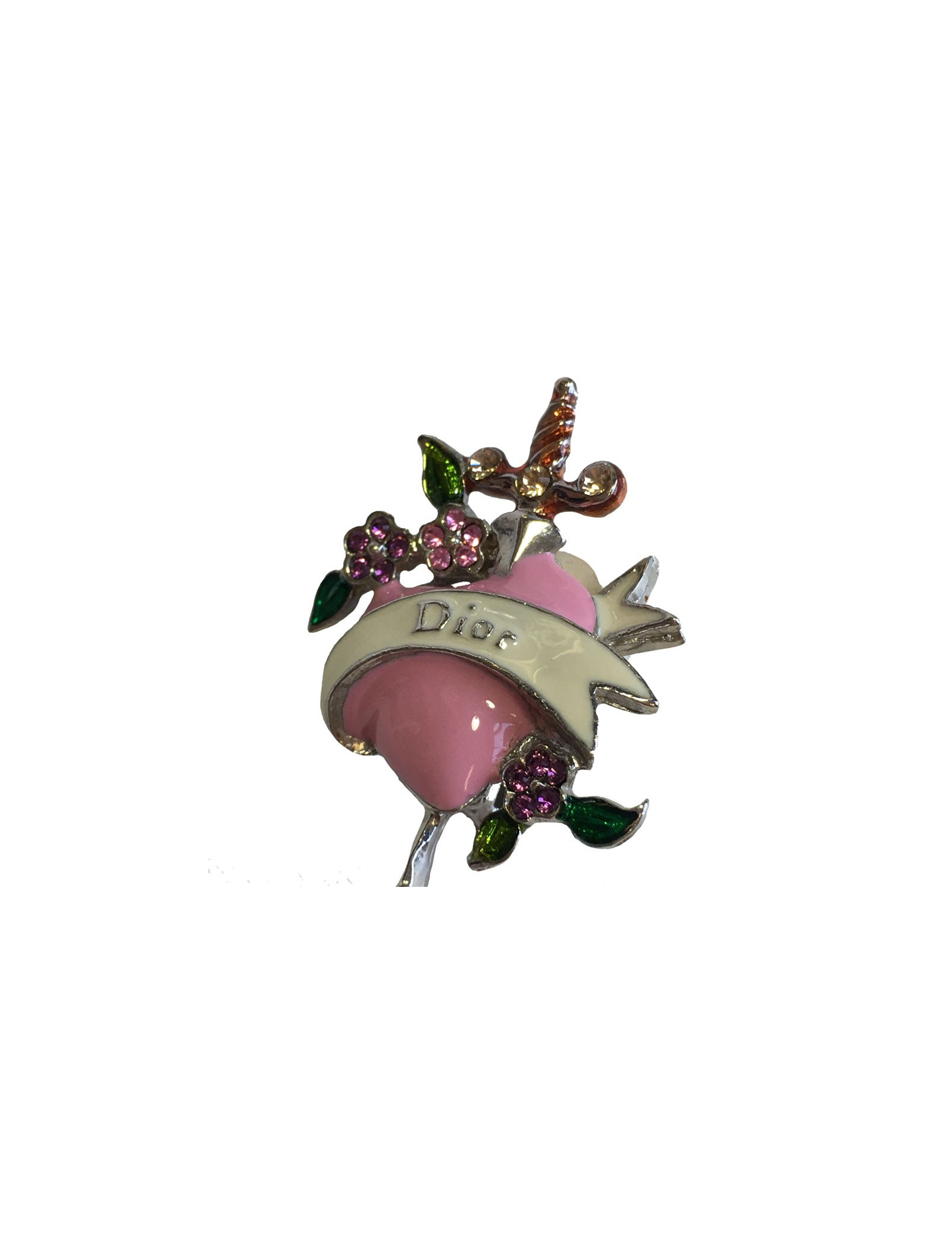 Très jolie paire de boucles d'oreille clips DIOR. En métal argenté, coeur rose serti de petites fleurs en strass rose, feuilles en strass vert, petite perle rouge et une petite épée.
