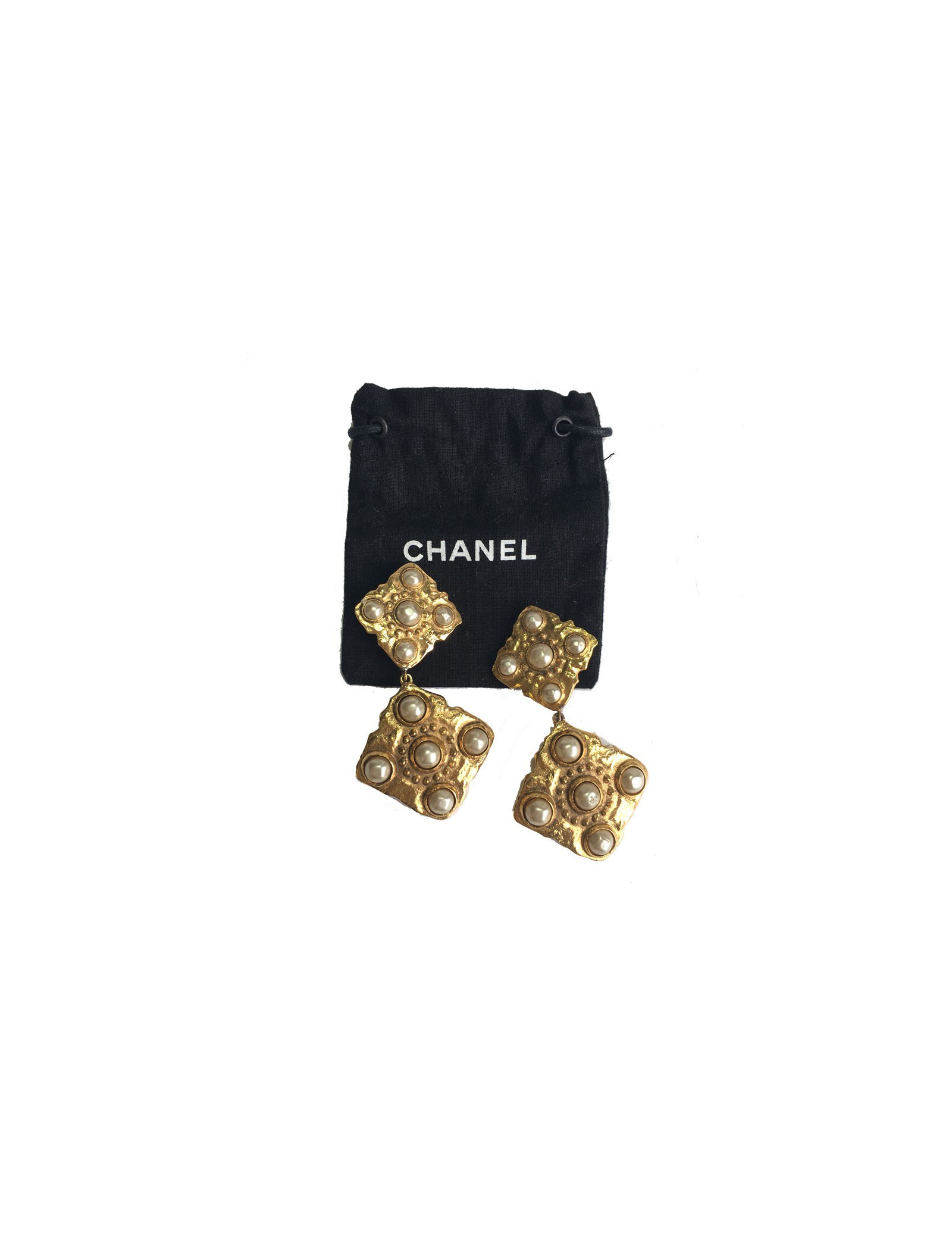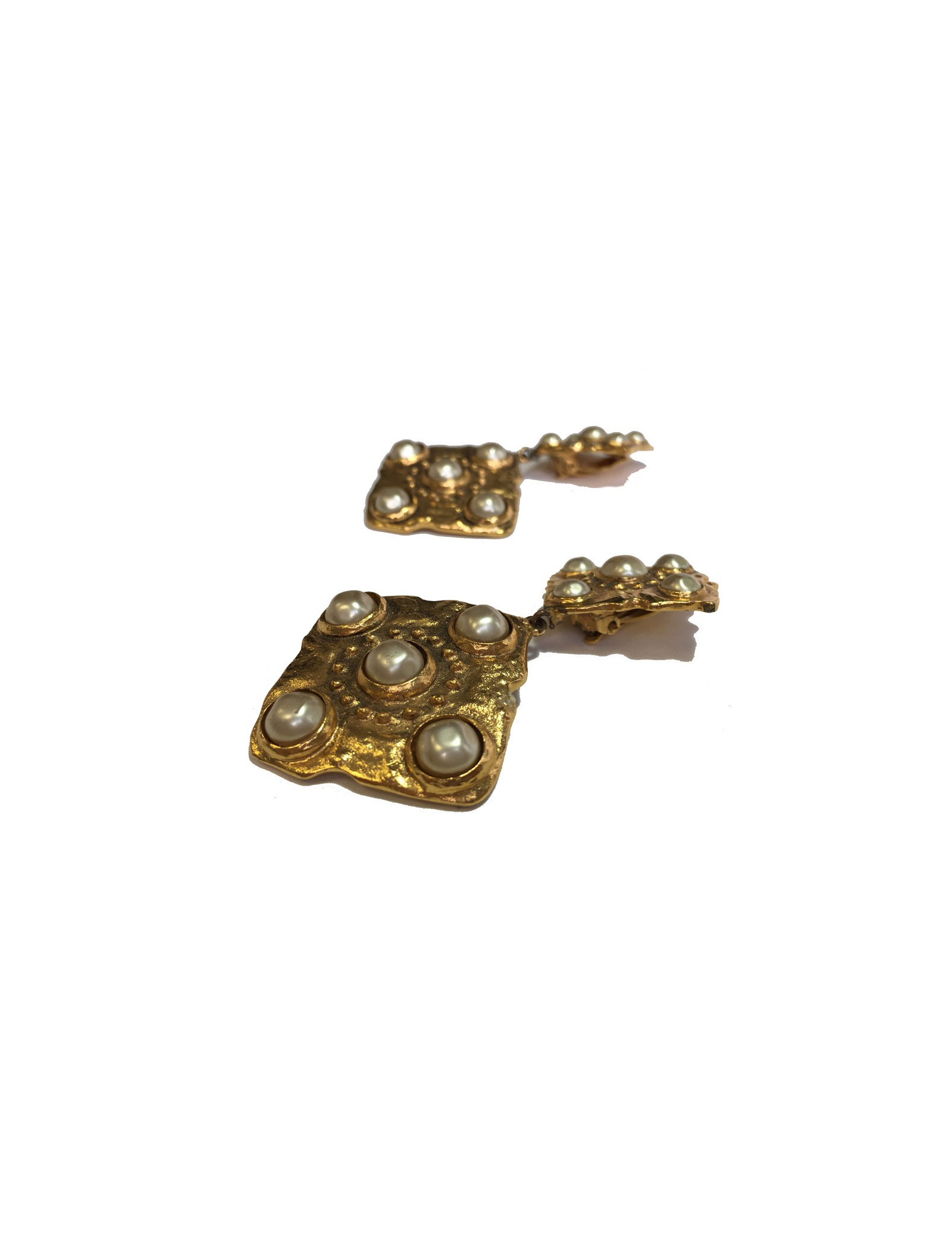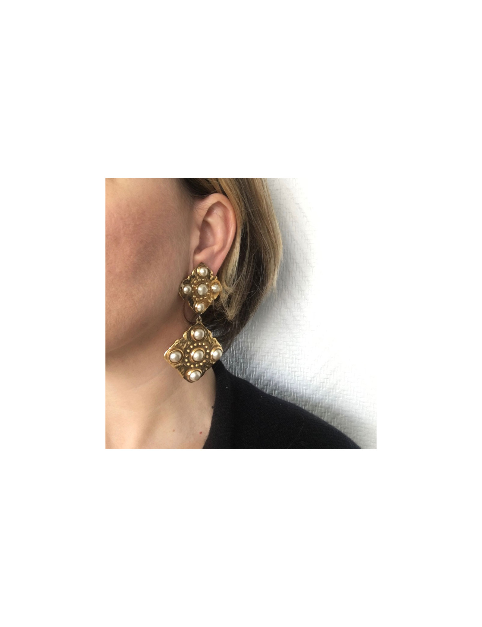 Boucles d'oreille clips Chanel pendants, en métal martelé doré et perles nacrées. Bijou vintage.