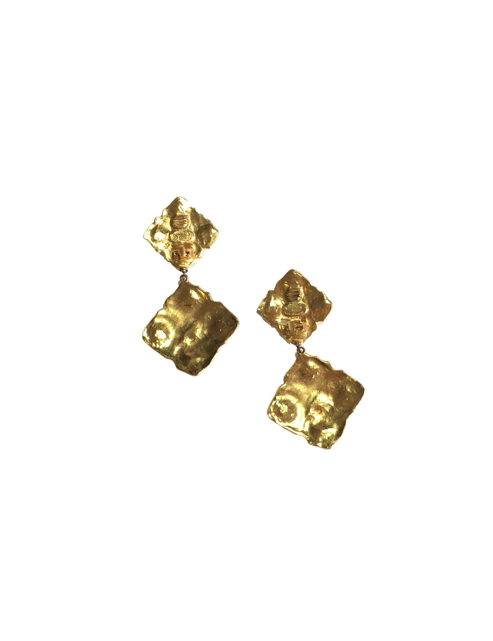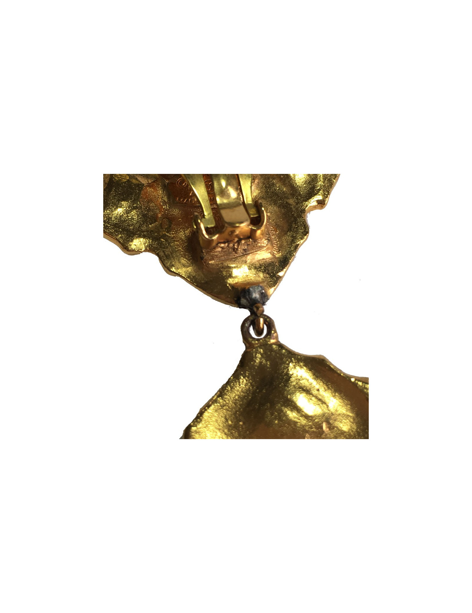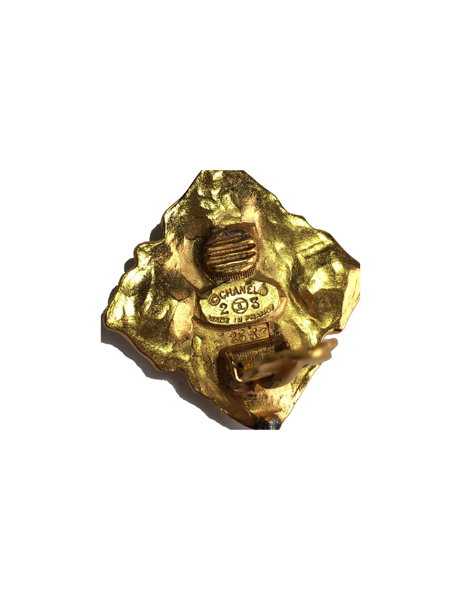 Boucles d'oreille clips Chanel pendants, en métal martelé doré et perles nacrées. Bijou vintage.