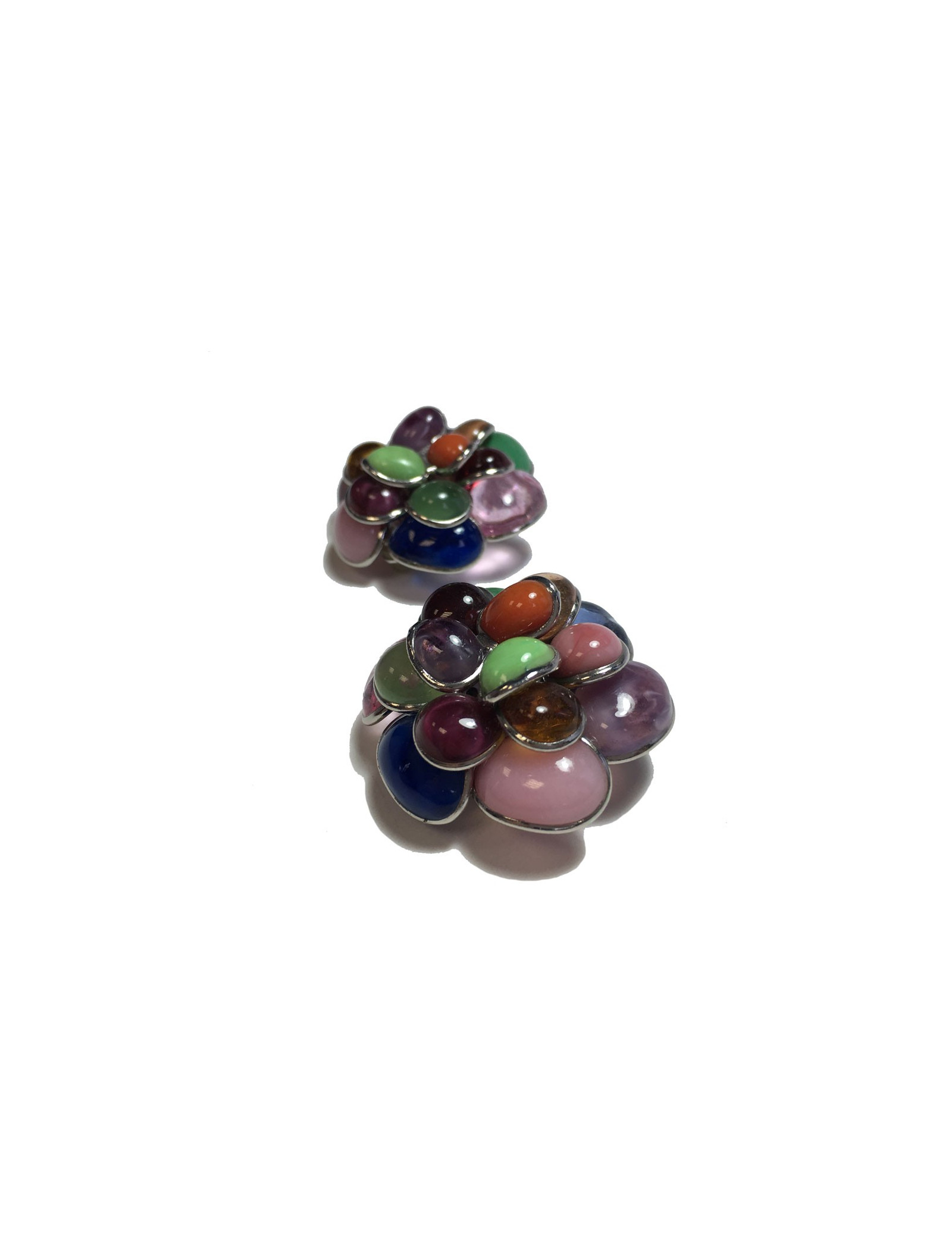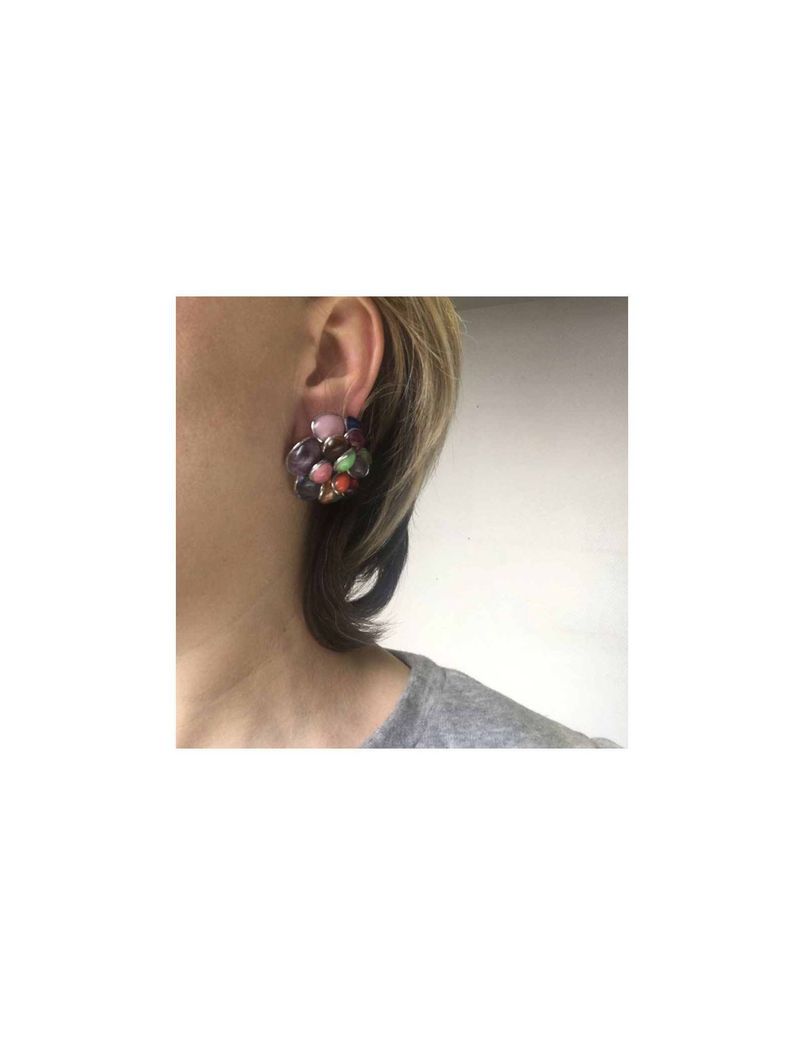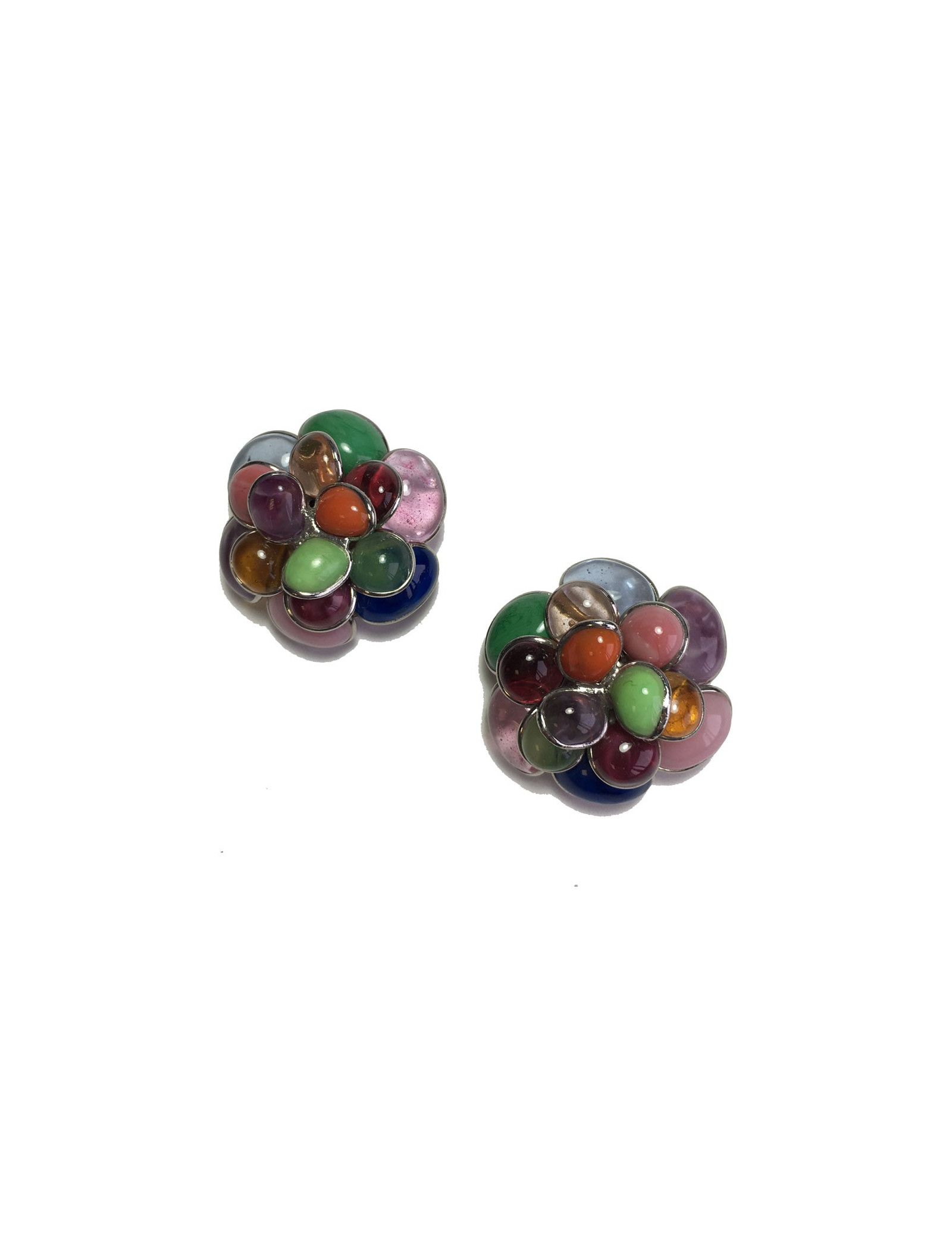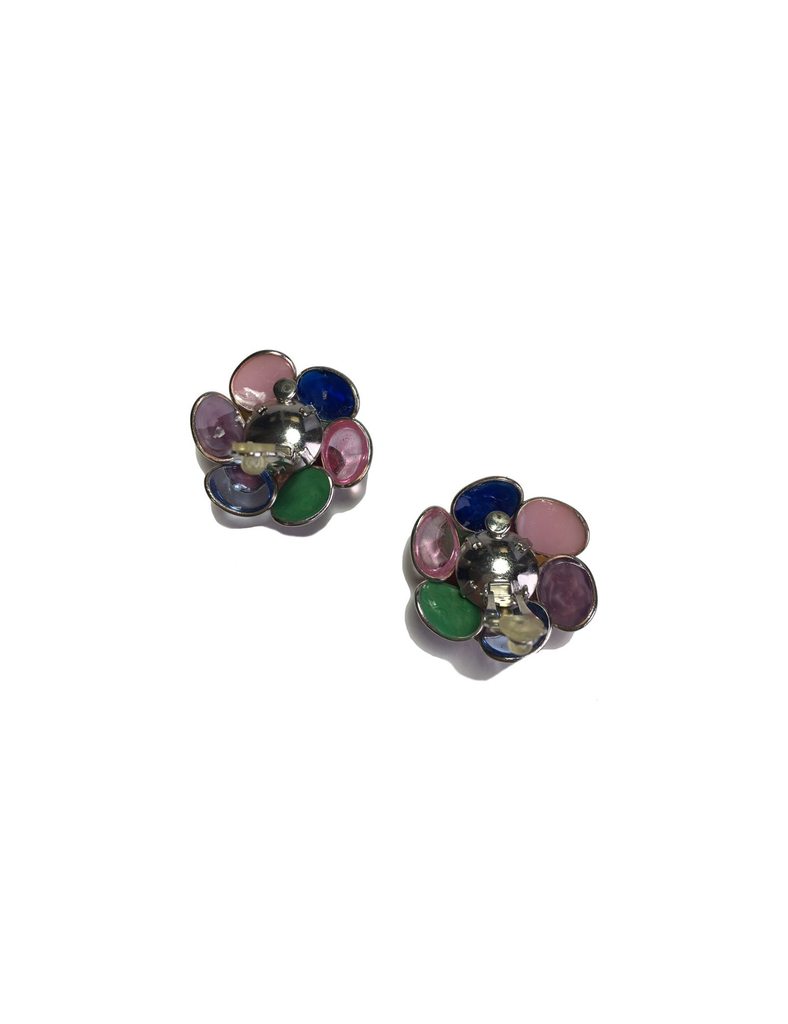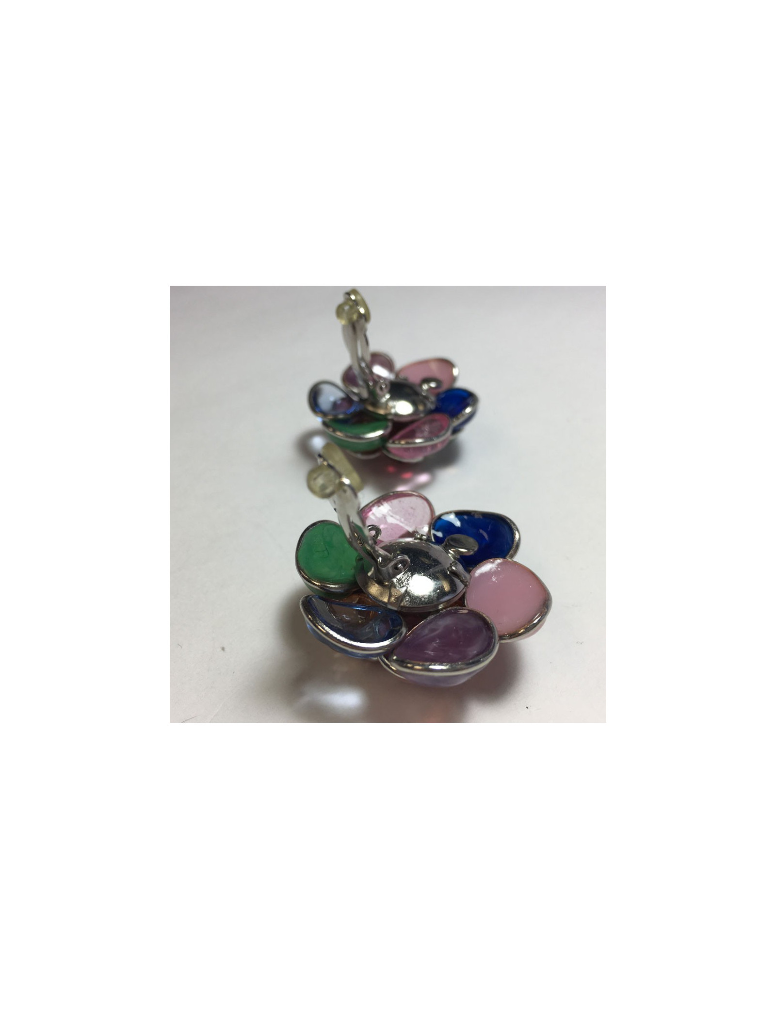 Superbes boucles d'oreille clips MARGUERITE DE VALOIS fleur en métal argenté et pétales en pâte de verre de multiples couleurs: rose, corail, ambre, vert.