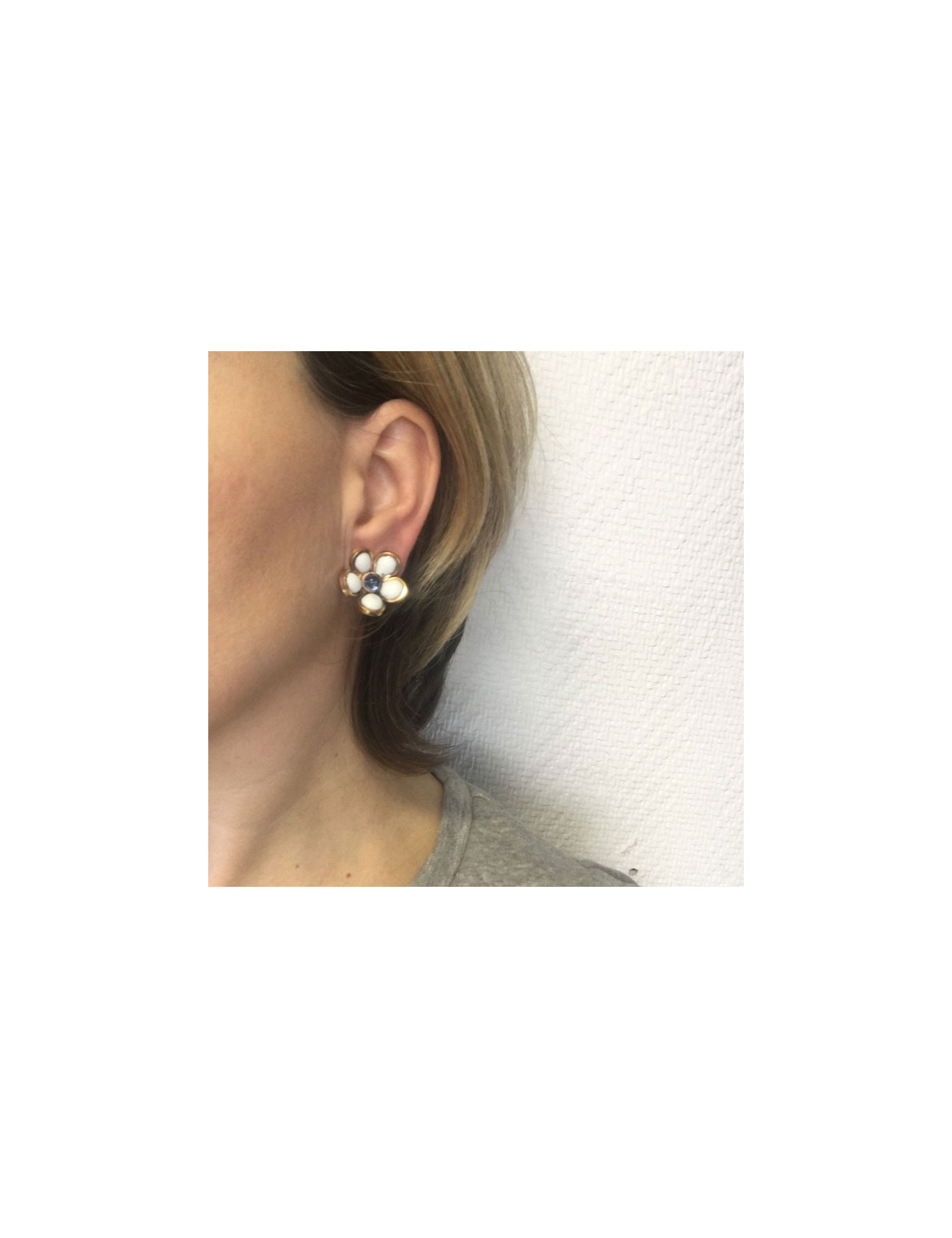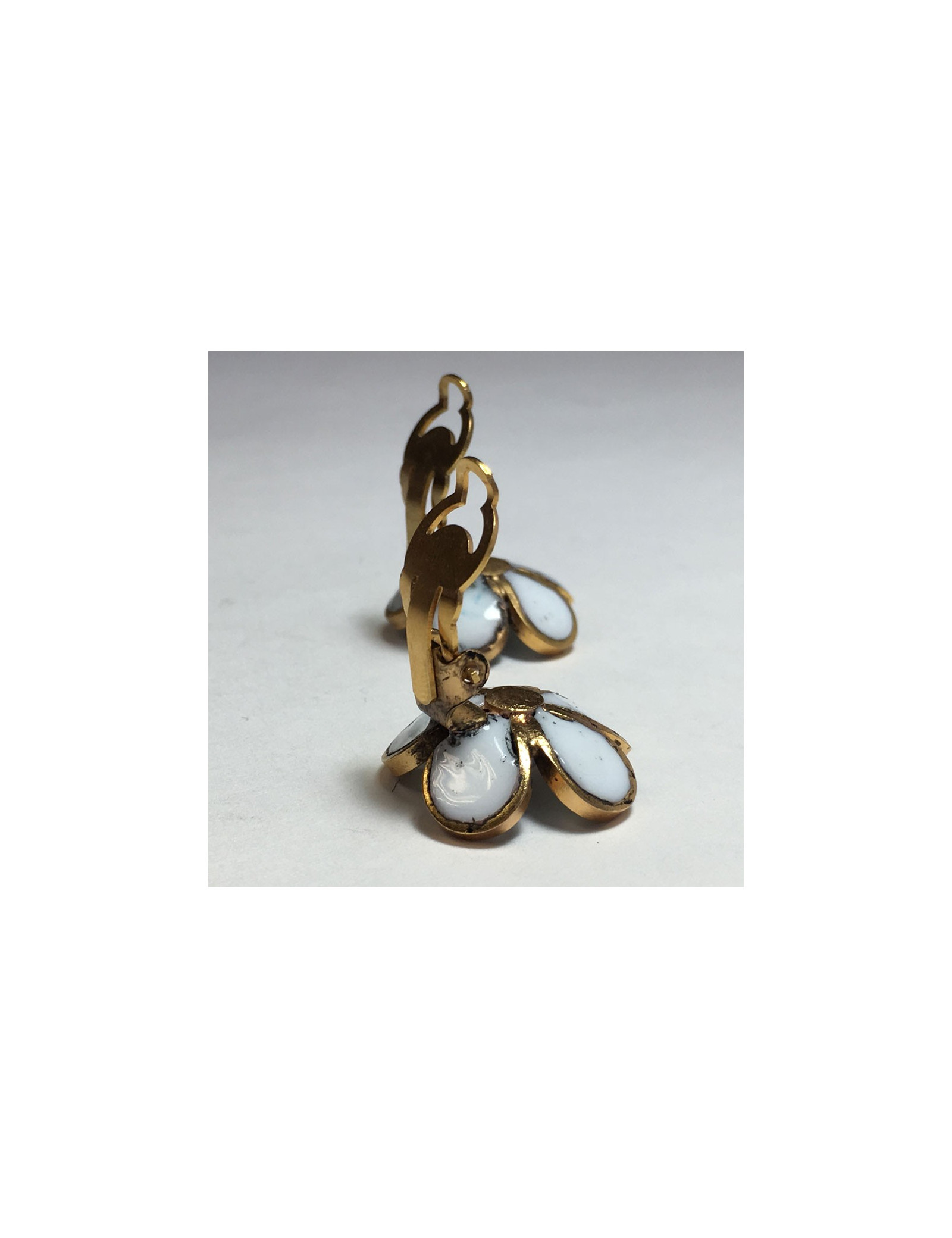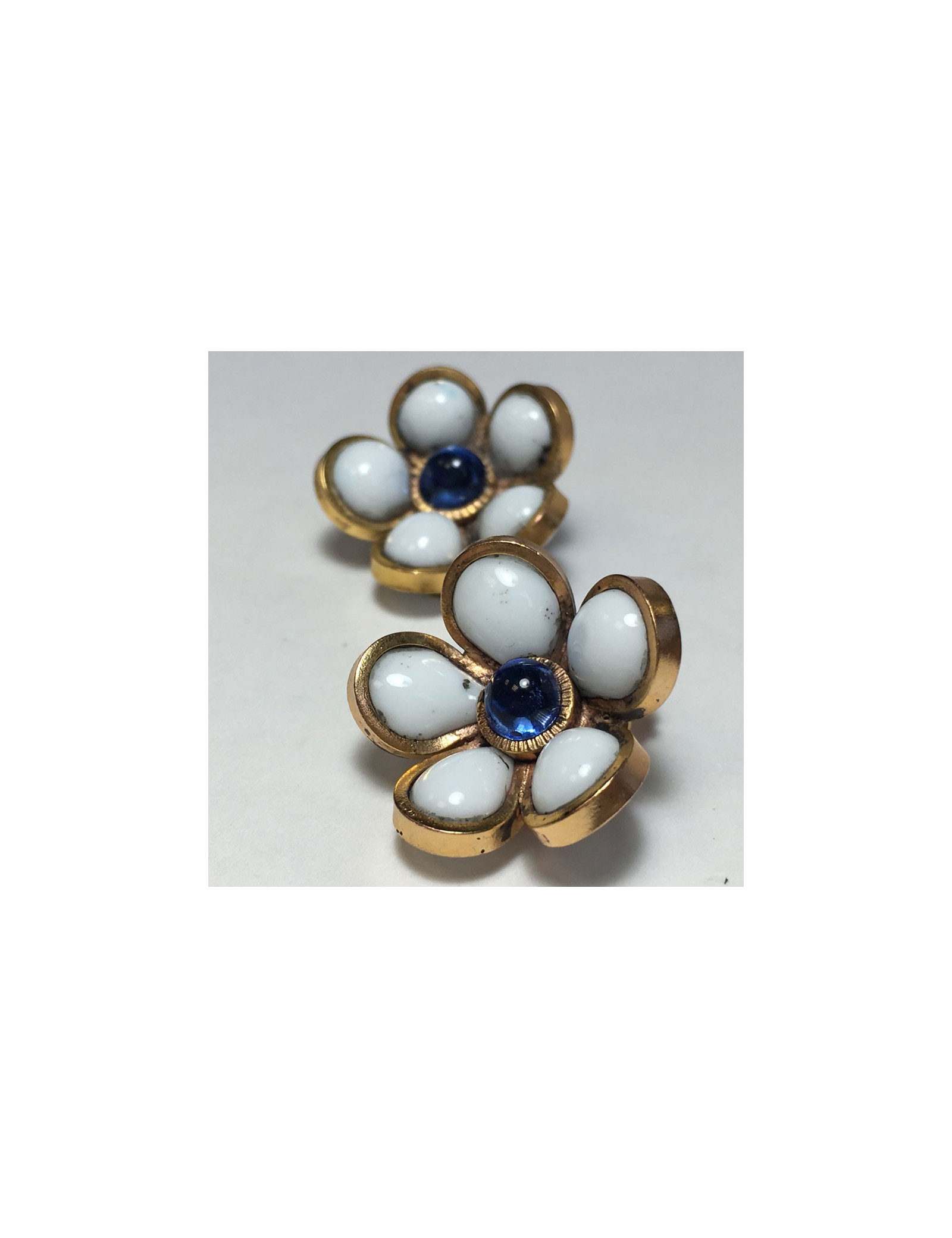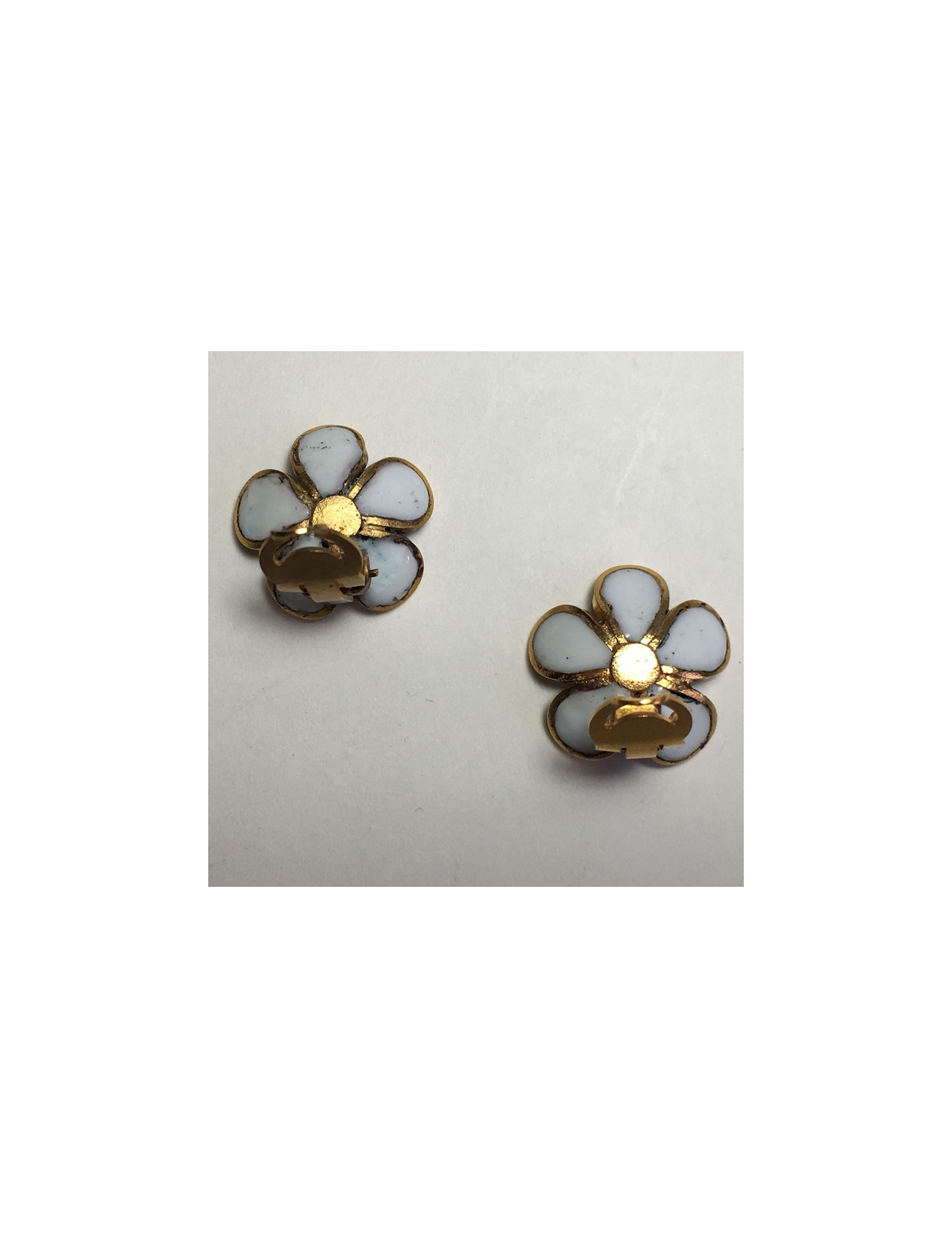 Boucles d'oreille clips d'oreilles Marguerite de Valois fleurette en pâte de verre blanche, le centre en pâte de verre bleue. Métal doré à l'or fin.