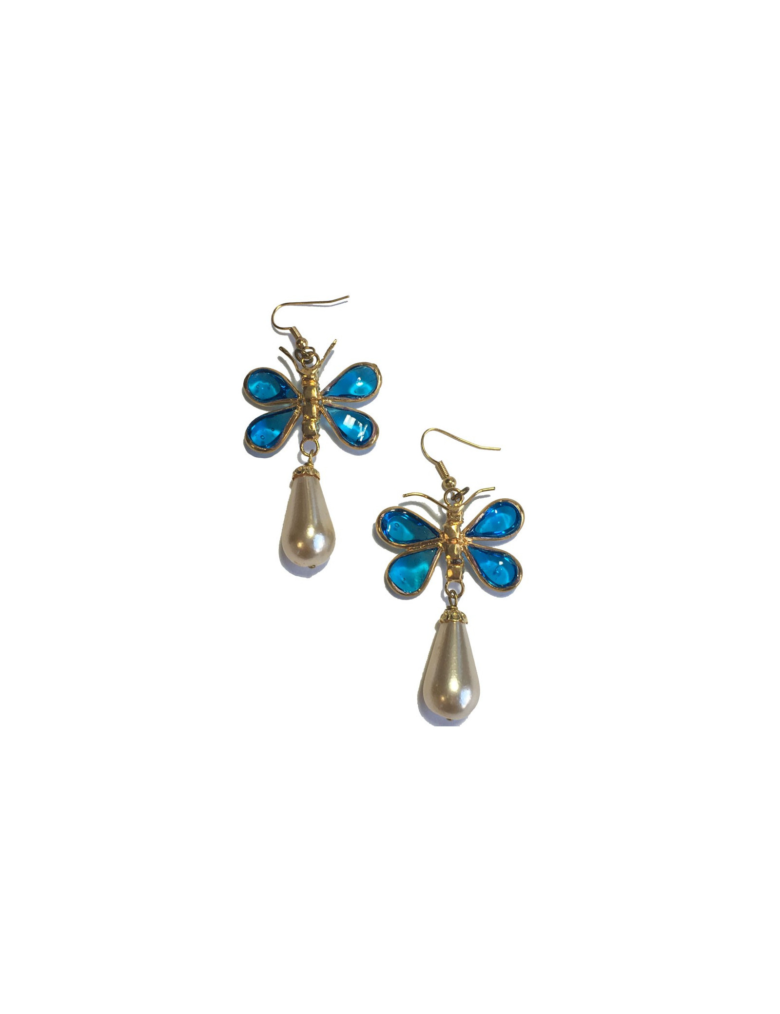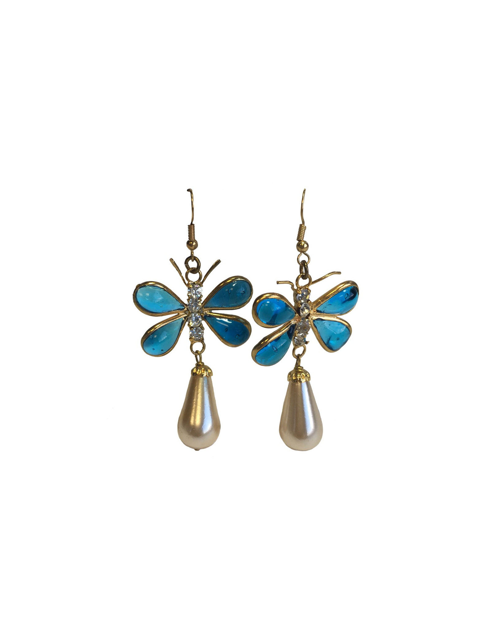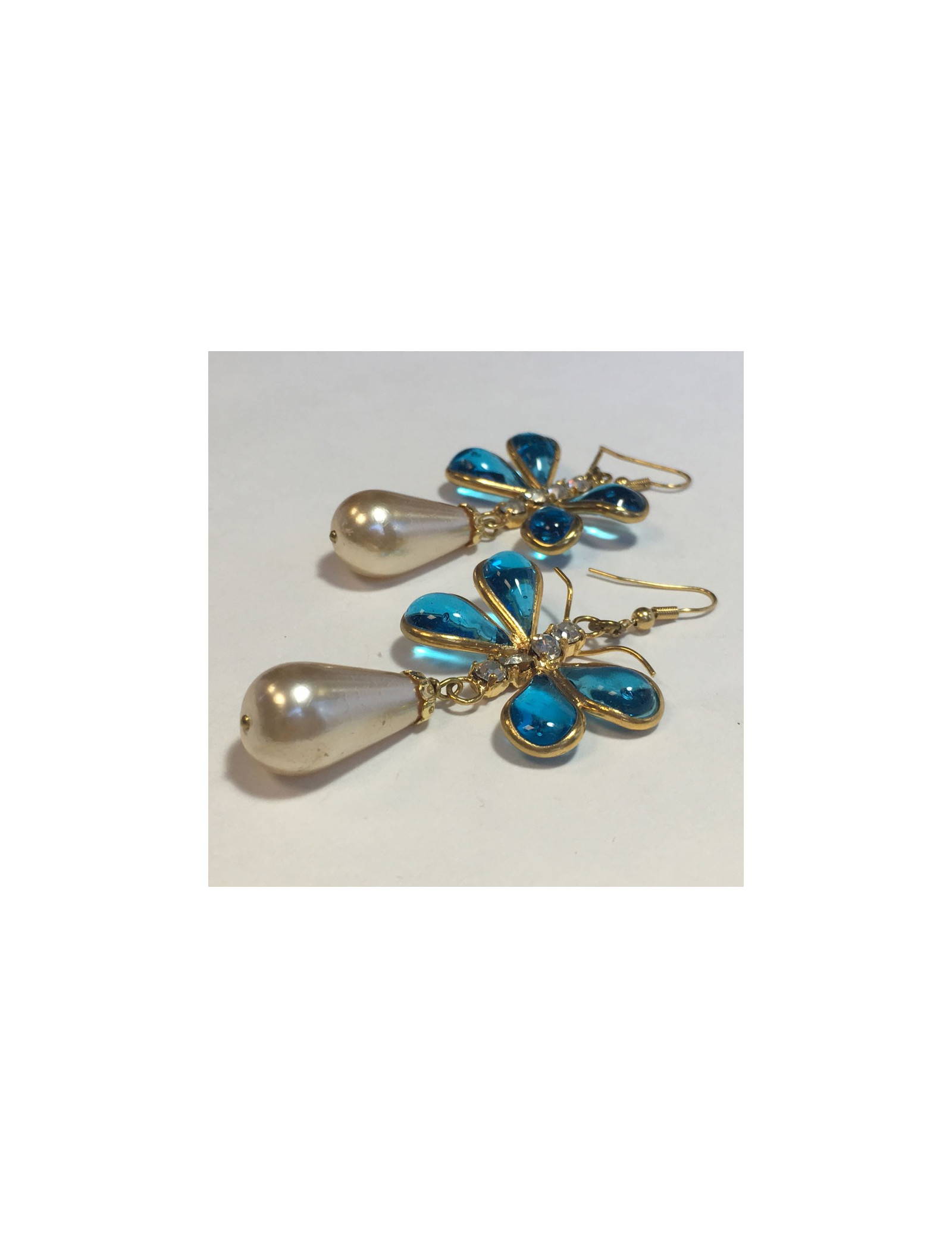 Détails : le corps du papillon est fait de 4 strass. La perle en forme goutte est en pâte de verre nacrée. Elles sont en très bon état mais une des perles a de petites traces à peine visible