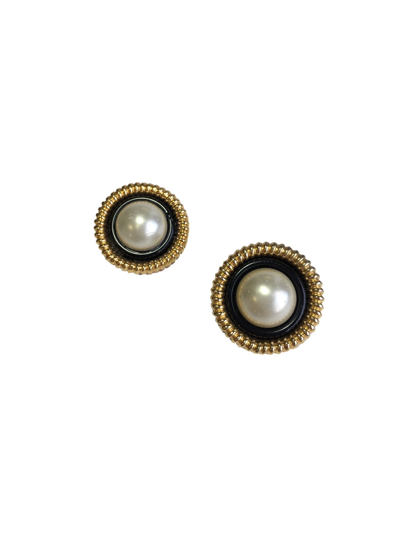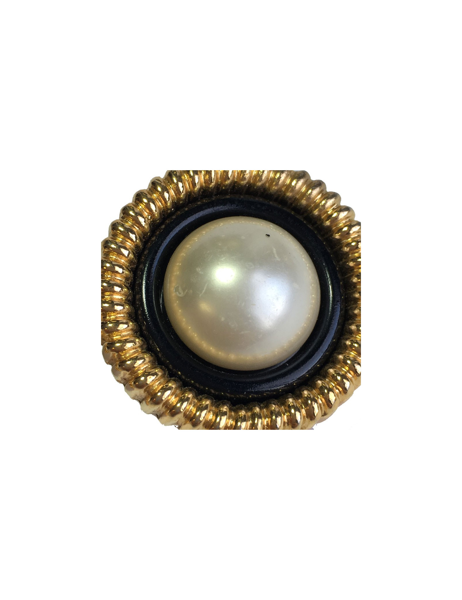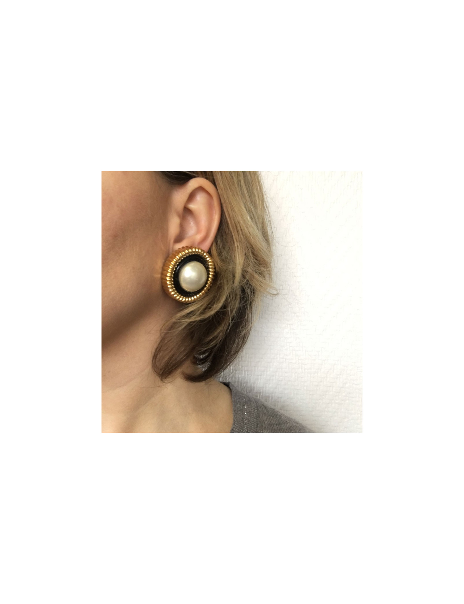 Boucles d'oreille clips Chanel Couture, en métal doré, perle nacrée au centre.
