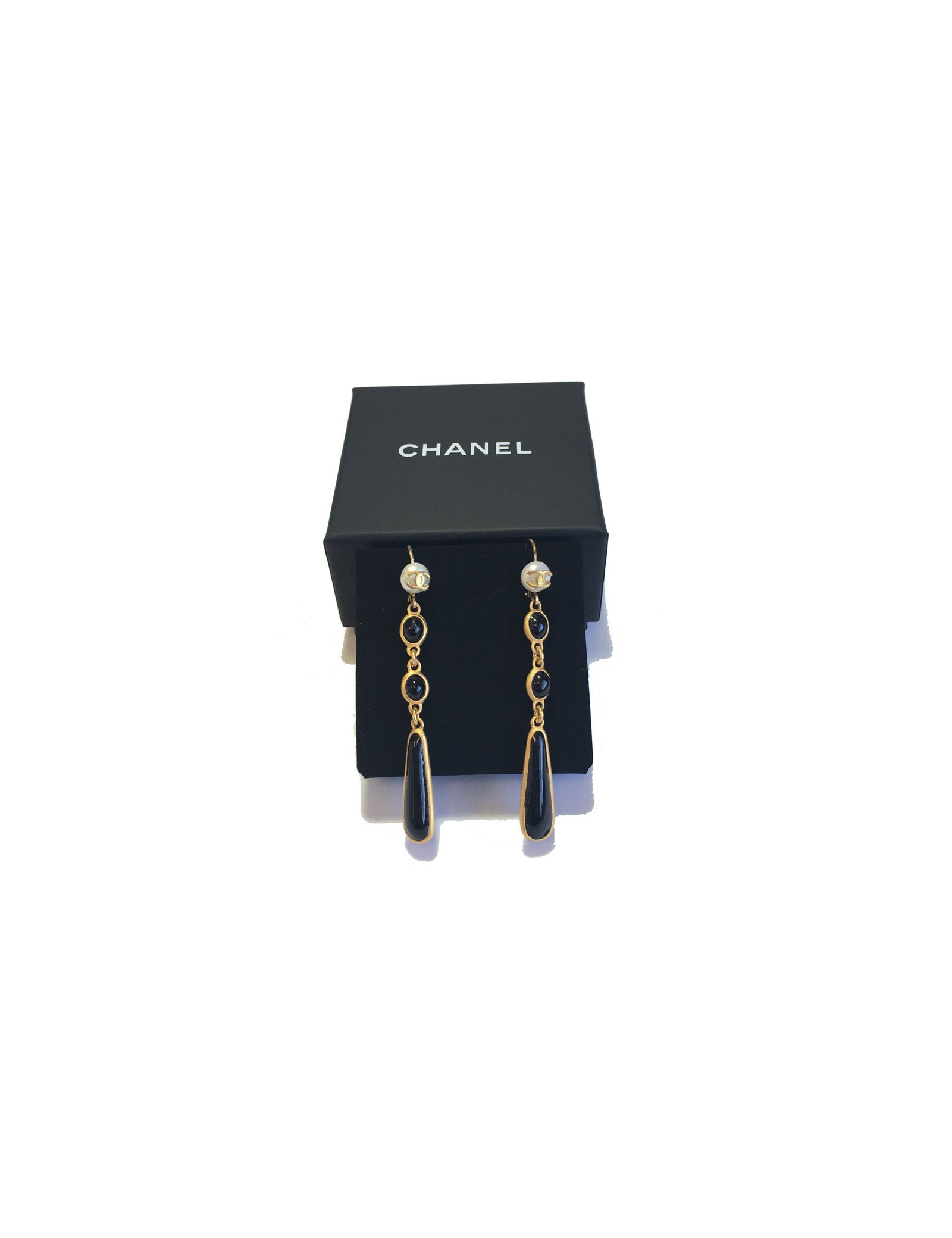 En métal couleur or mat, petite perle nacrée sur laquelle est apposé un double C doré et de la pâte de verre noire.