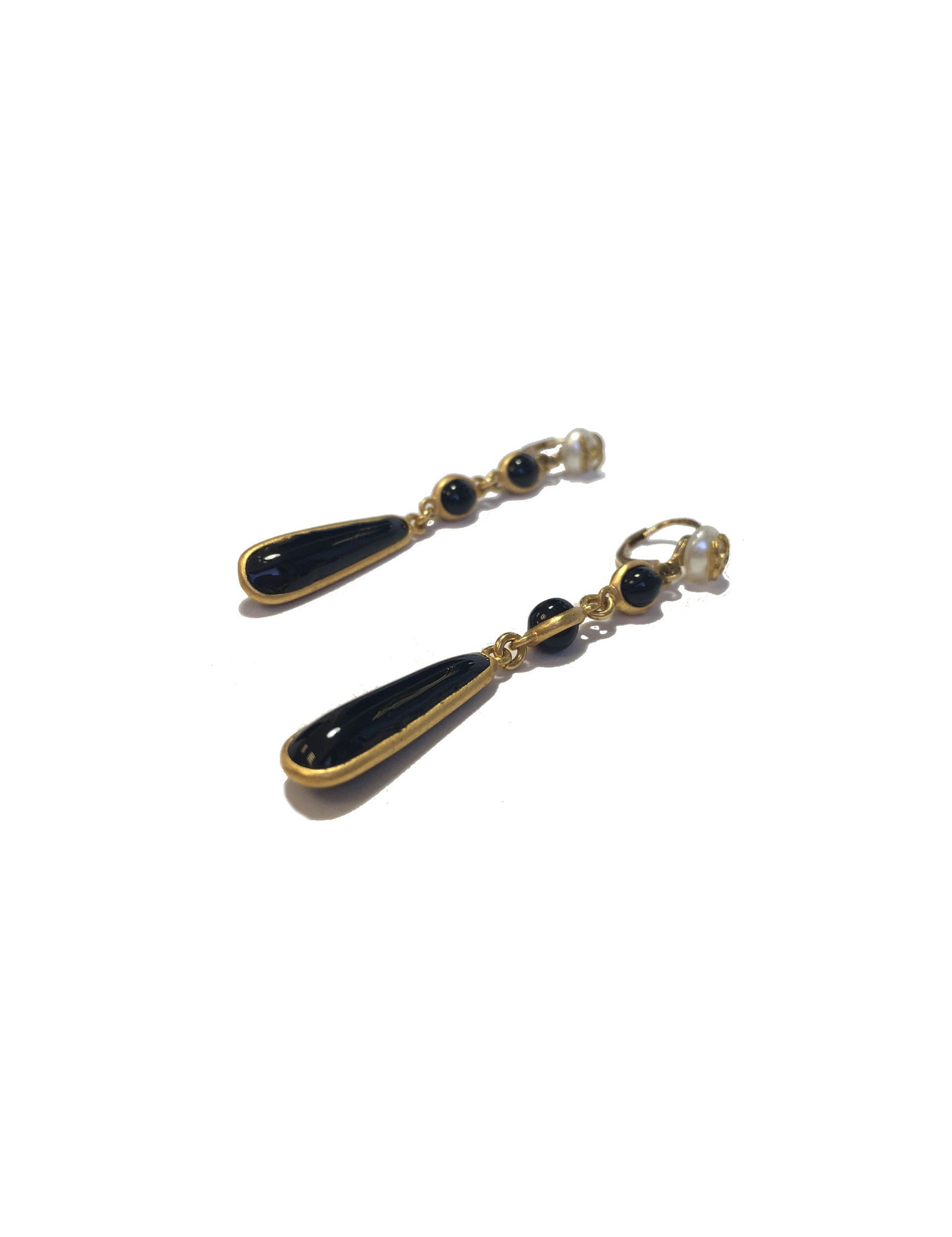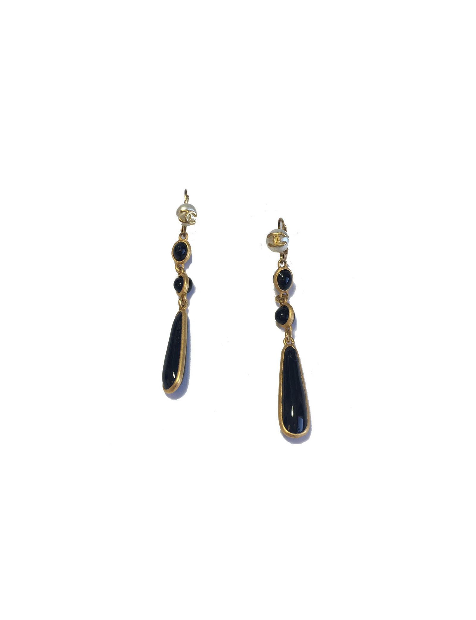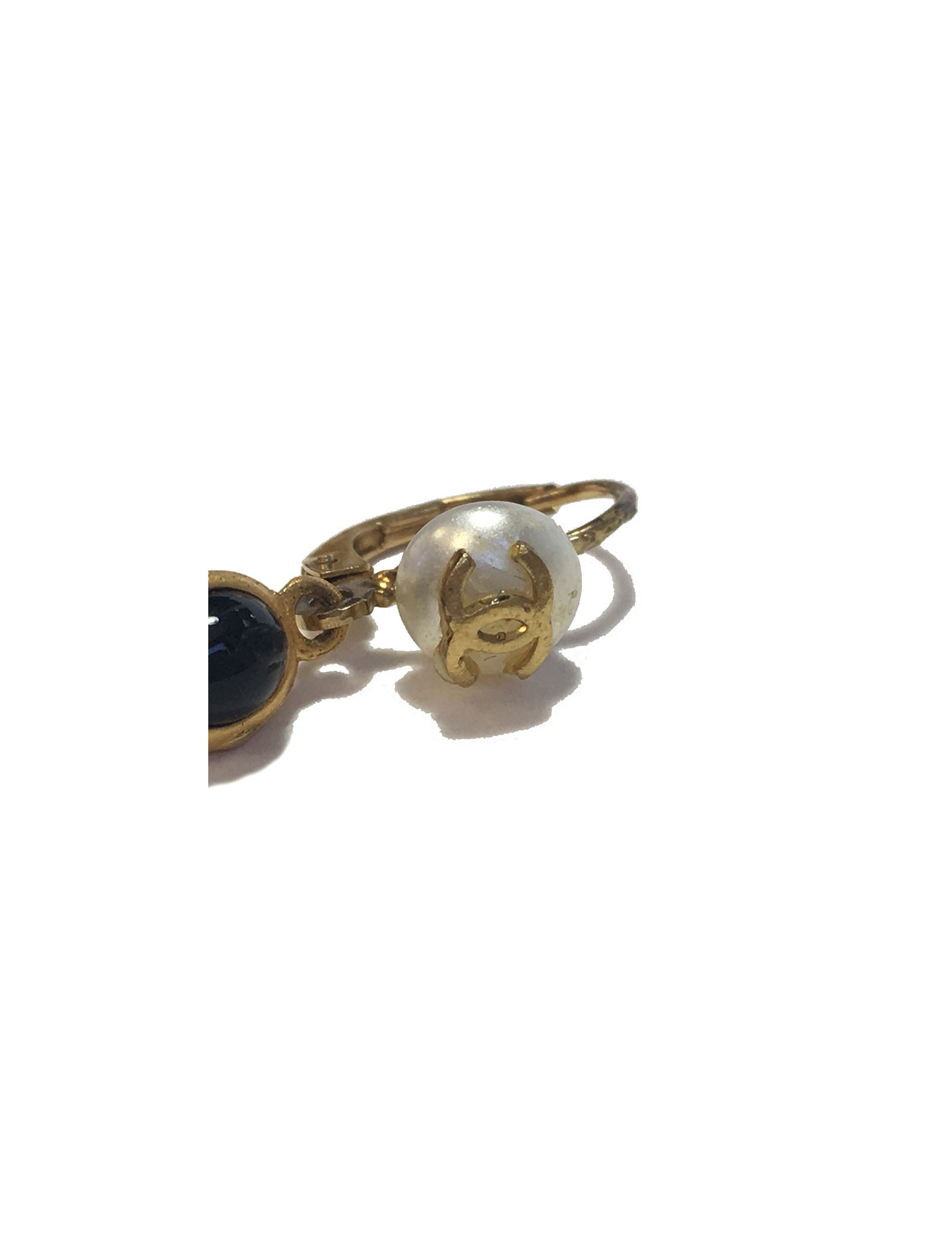 Boucles d'oreilles clous CHANEL pendantes en métal doré, pâte de verre noire et perle nacrée