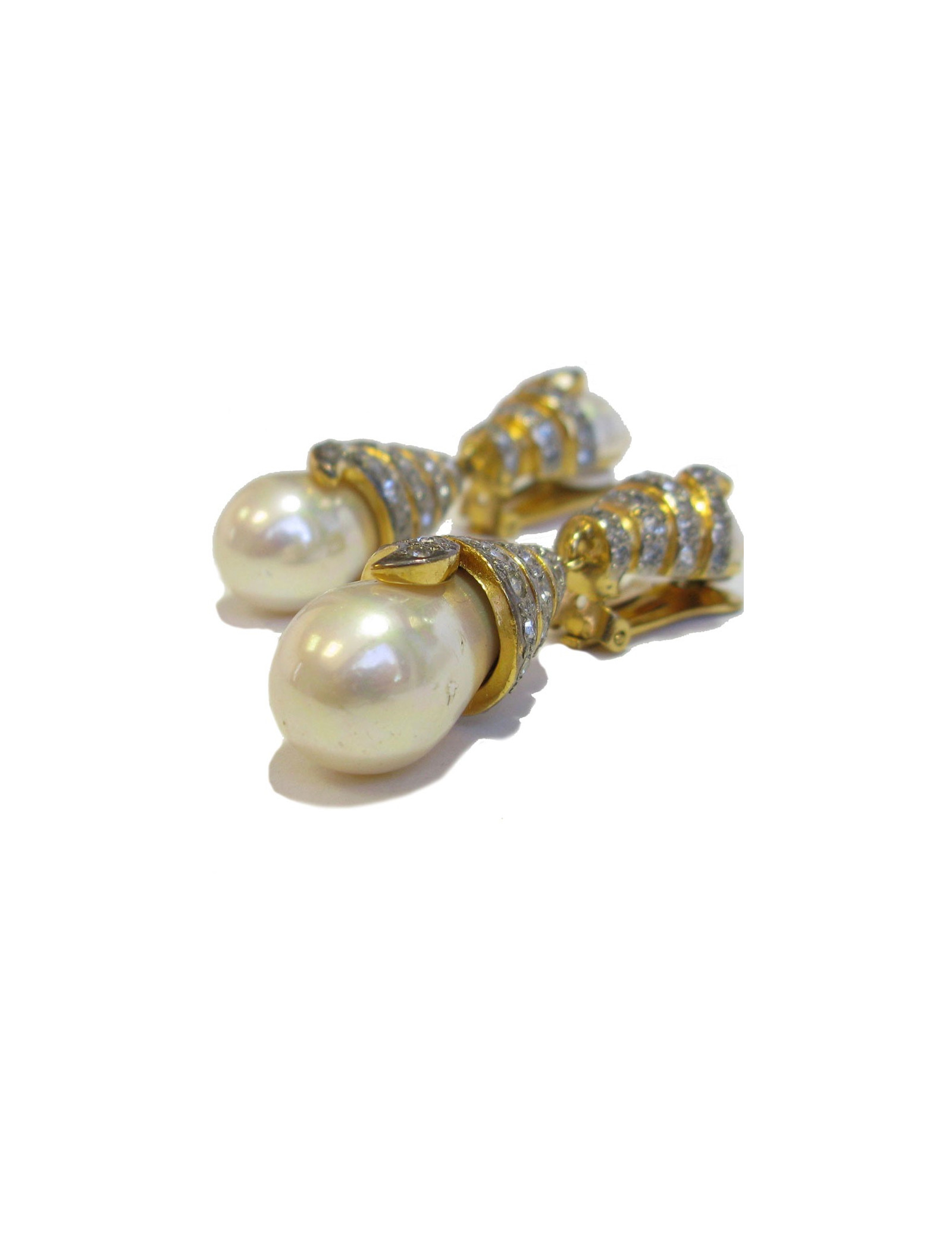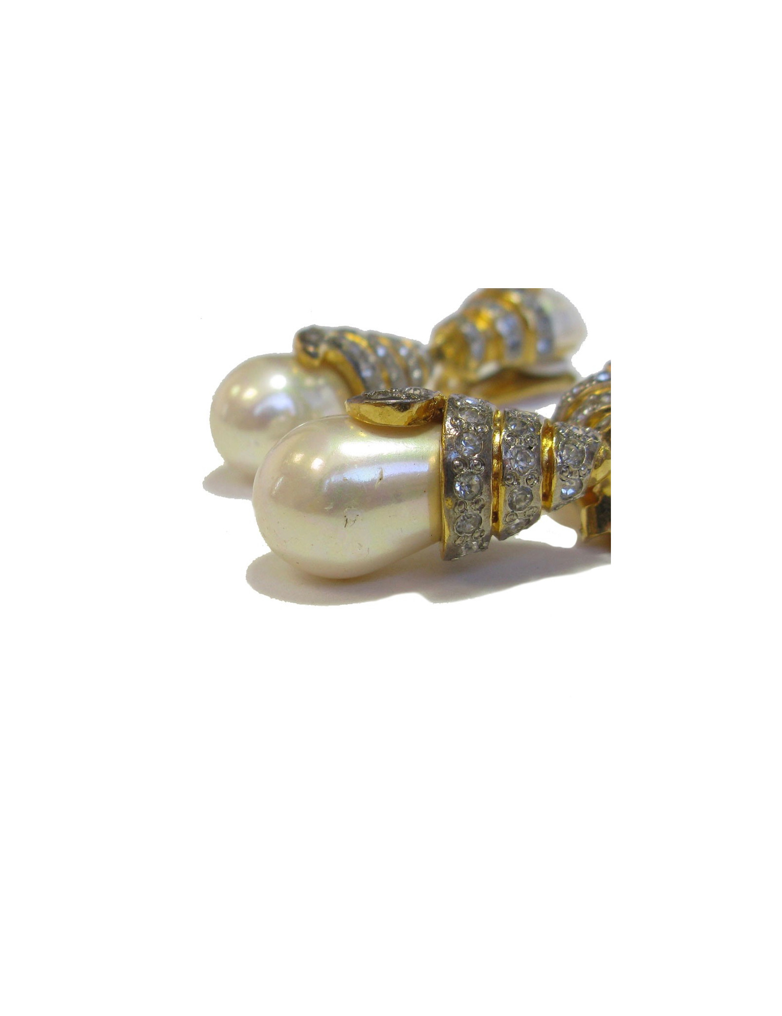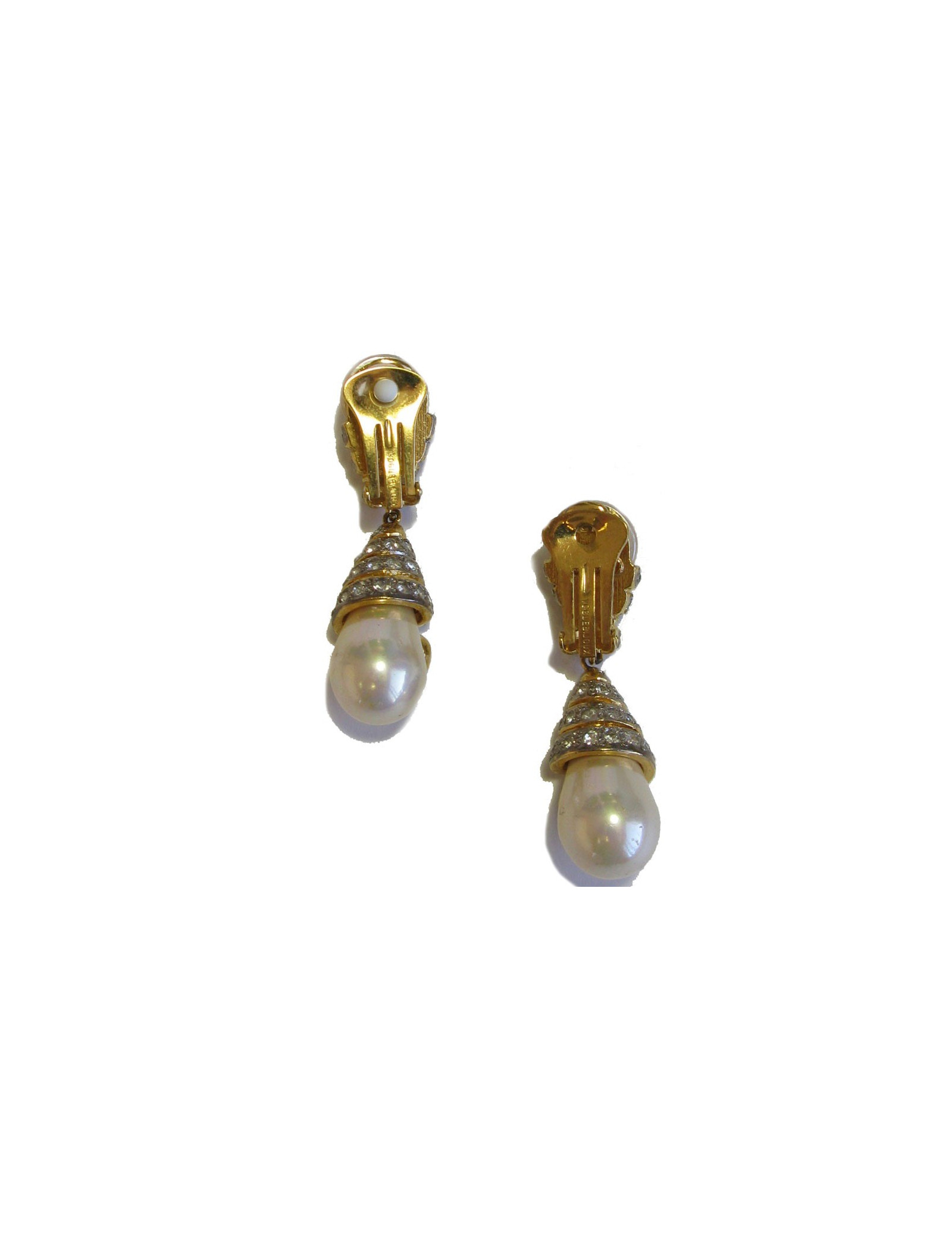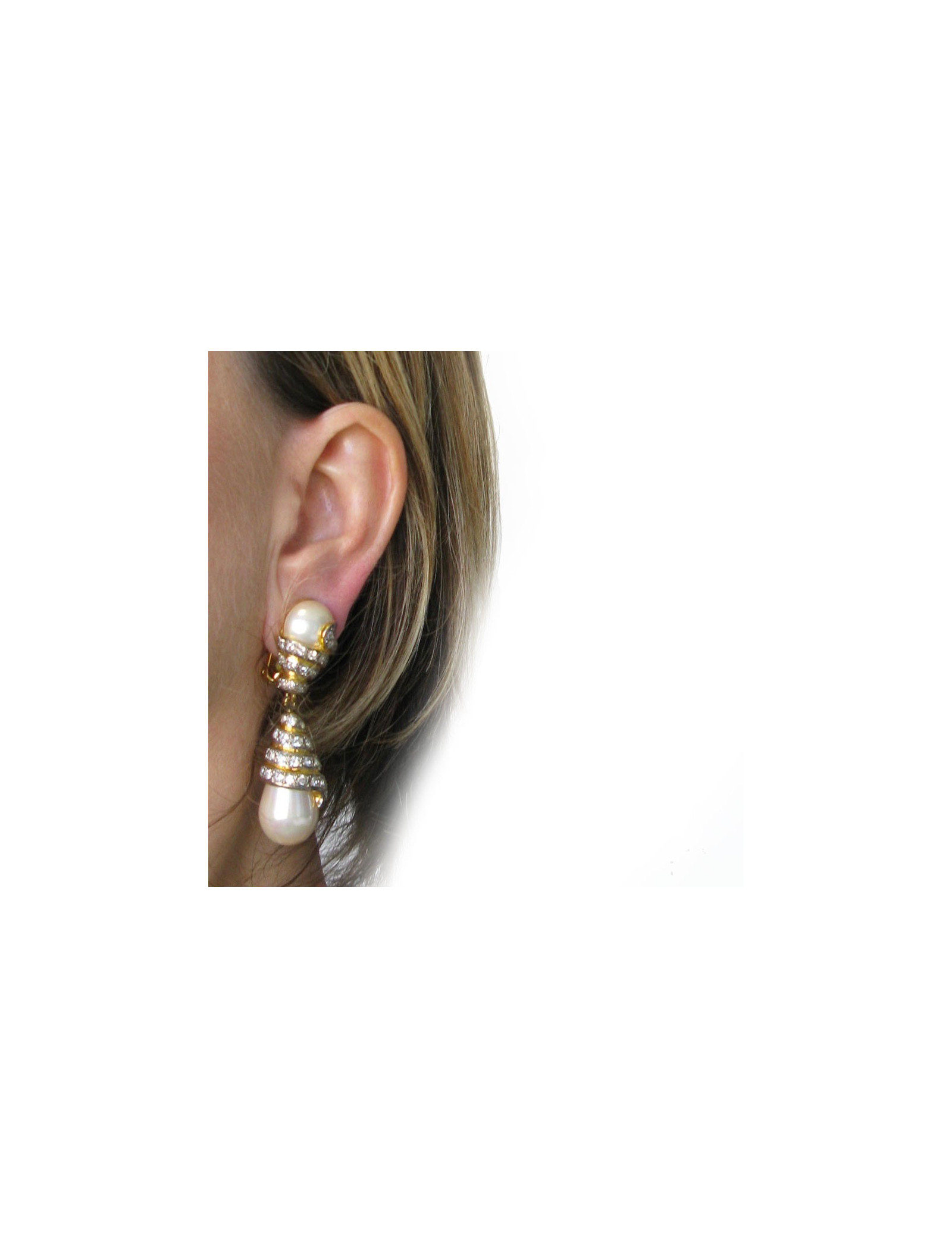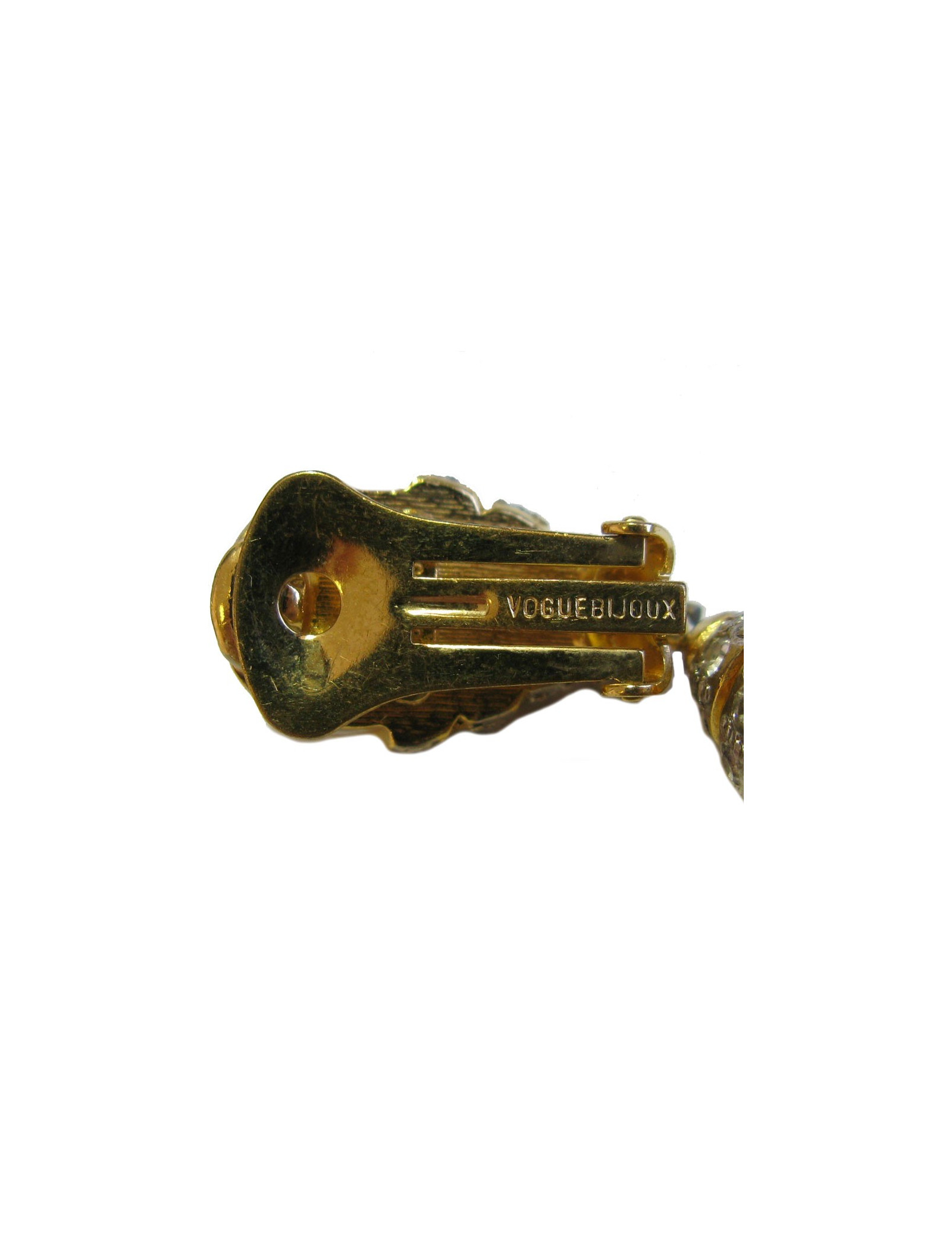 Boucles d'oreille clips pendants Vogue Bijoux en métal doré, serties de strass et perles nacrées.
