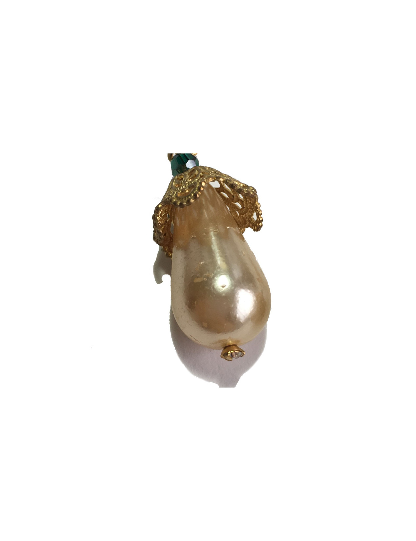 Boucles d'oreille clous pendants Marguerite de Valois en métal ajouré doré à l'or fin et perle, forme poire, en pâte de verre nacrée. Petite pierre bleue facettée sur le haut de chaque boucle et petit strass au bout de la perle..