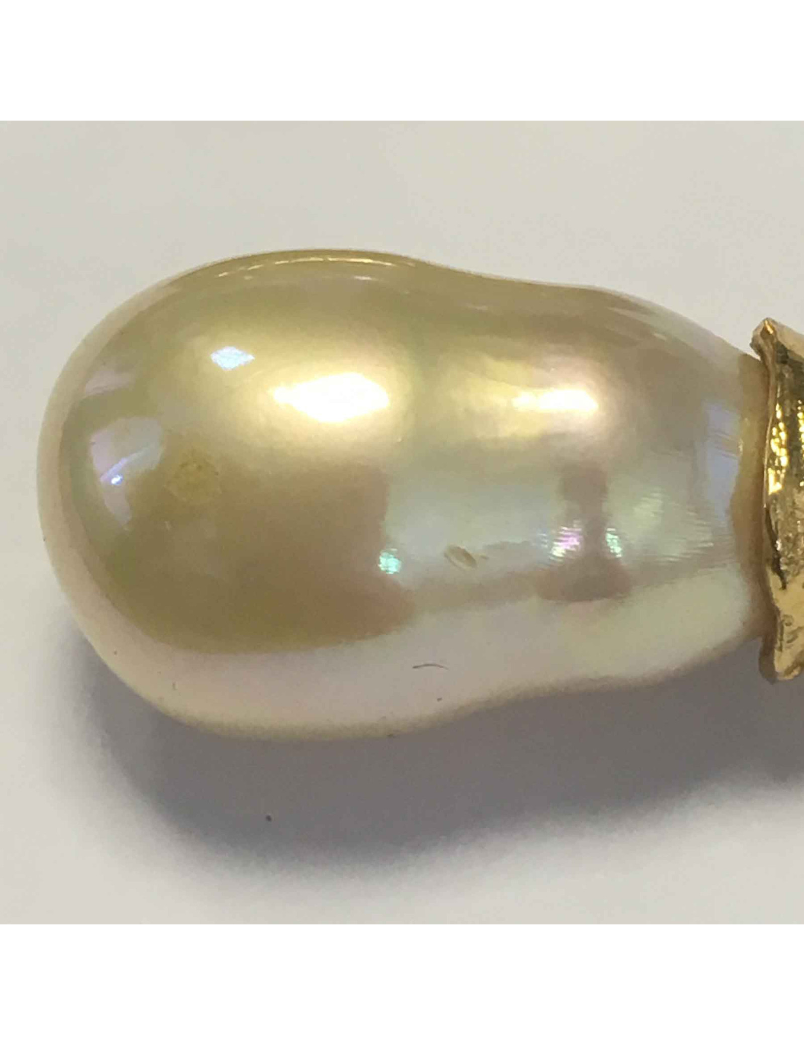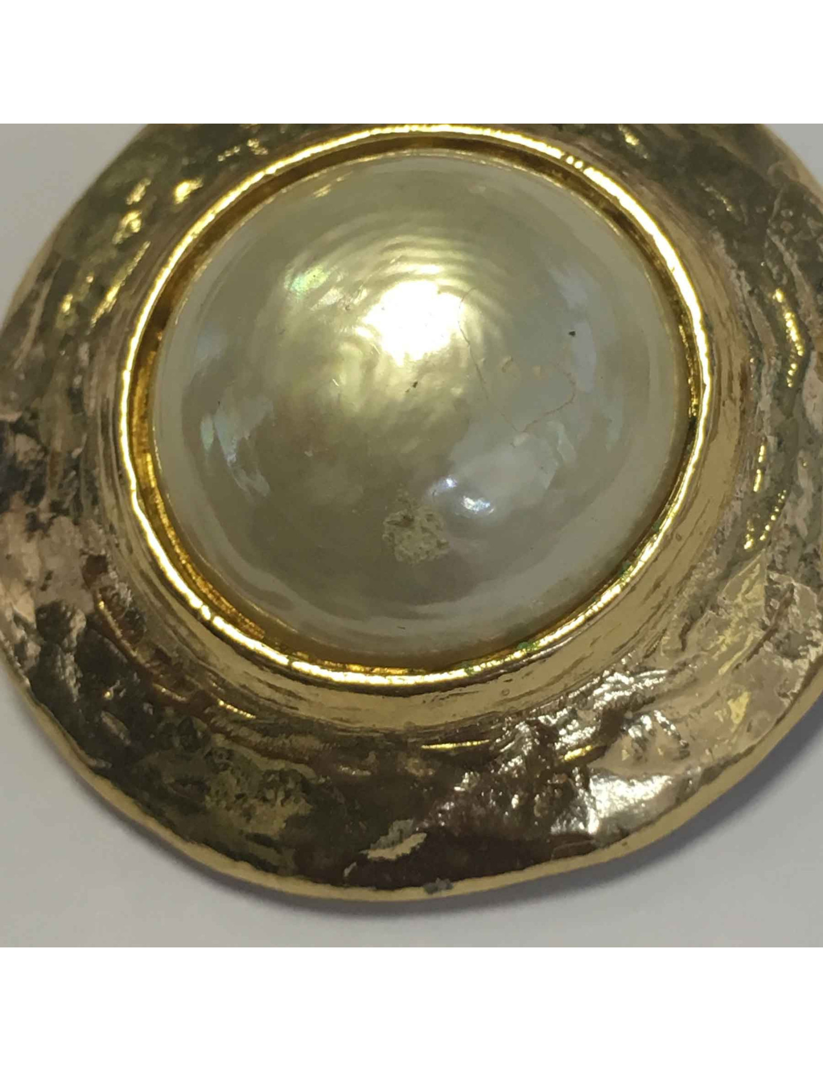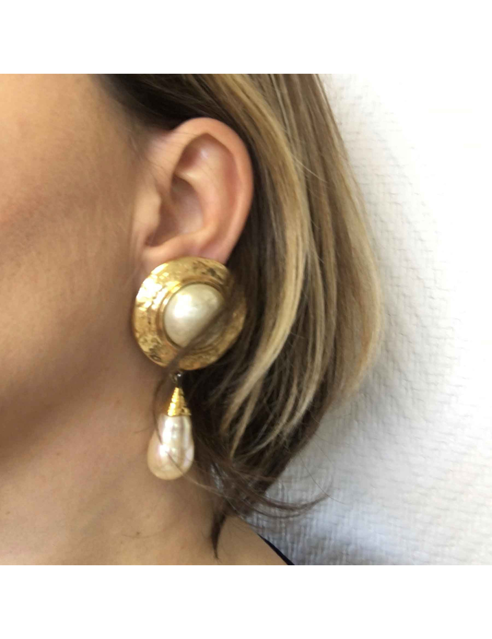 Boucles d'oreille clips YSL Yves Saint Laurent pendantes en métal doré aspect martelé et perles nacrées, rondes et en forme de goutte. Bijou vintage en bon état. De petits éclats sur les perles.