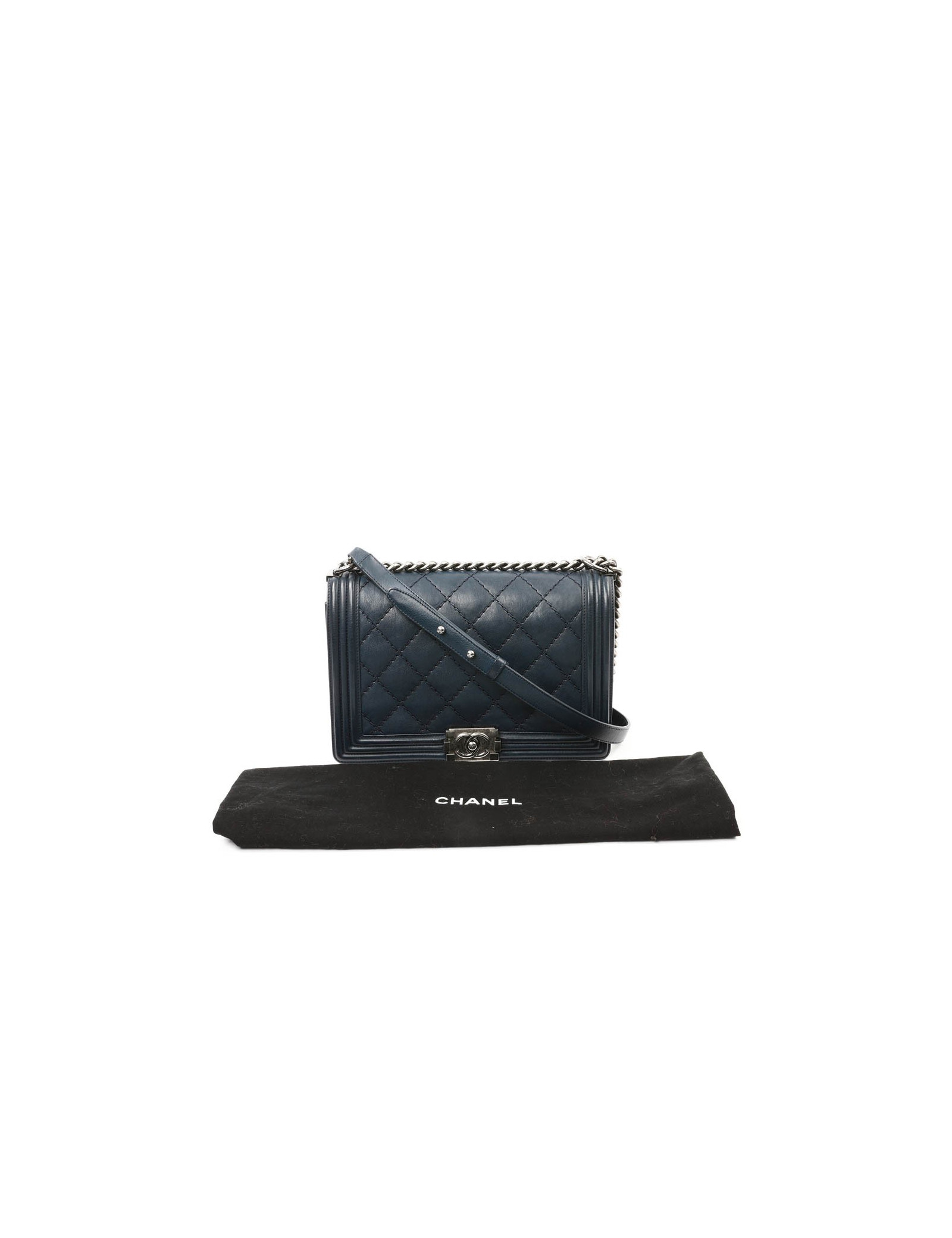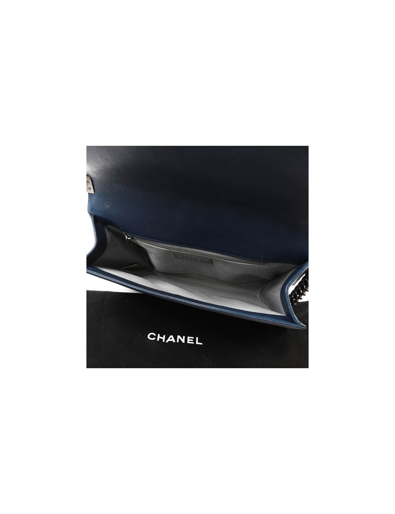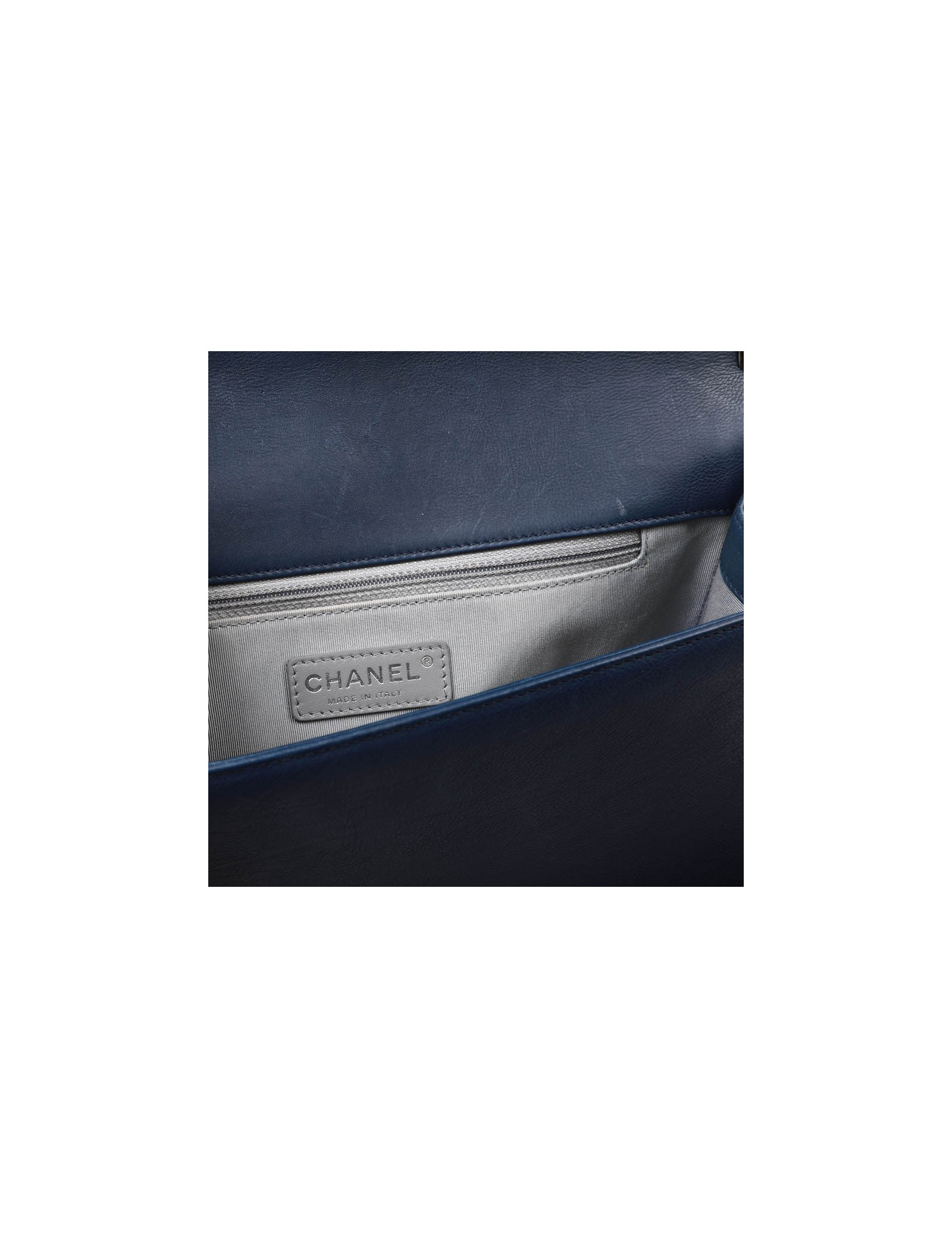 Pour l'histoire, ce sac a été imaginé par KarL Lagerfeld en 2010 suite à la découverte dans les archives de Coco Chanel, d'un sac de chasse celle-ci était devenu une cavalière et s'en servait de sac à main. Le rabat est doublé en cuir de même couleur. L'intérieur est doublé en toile grise avec une poche zippée.