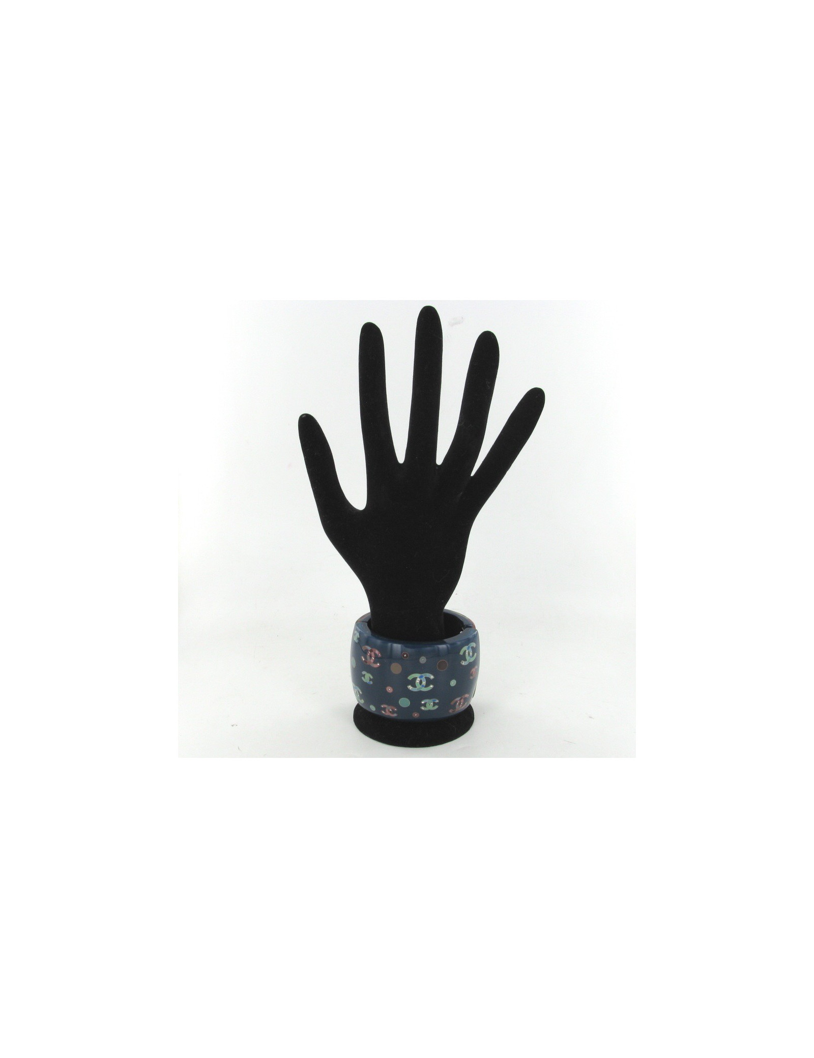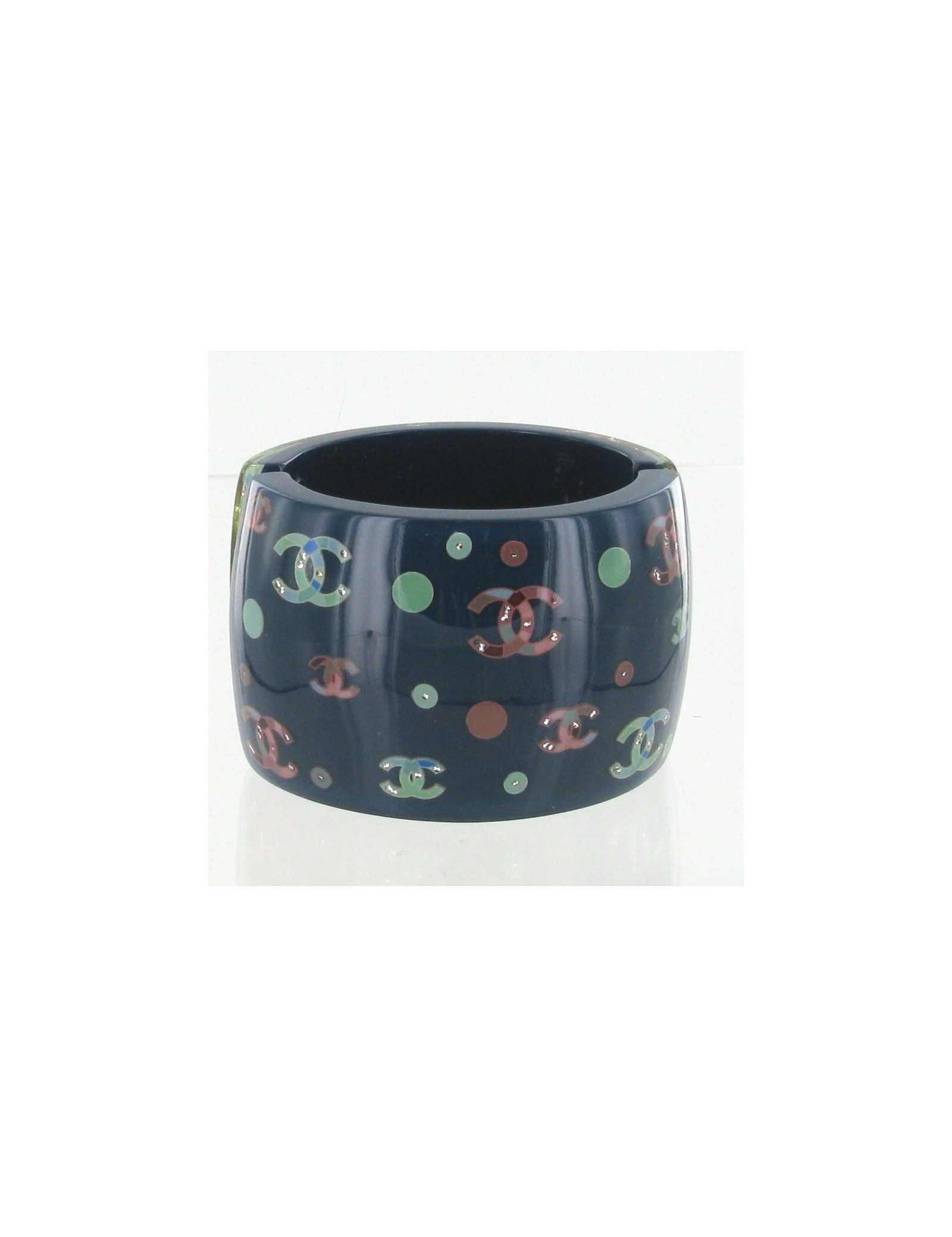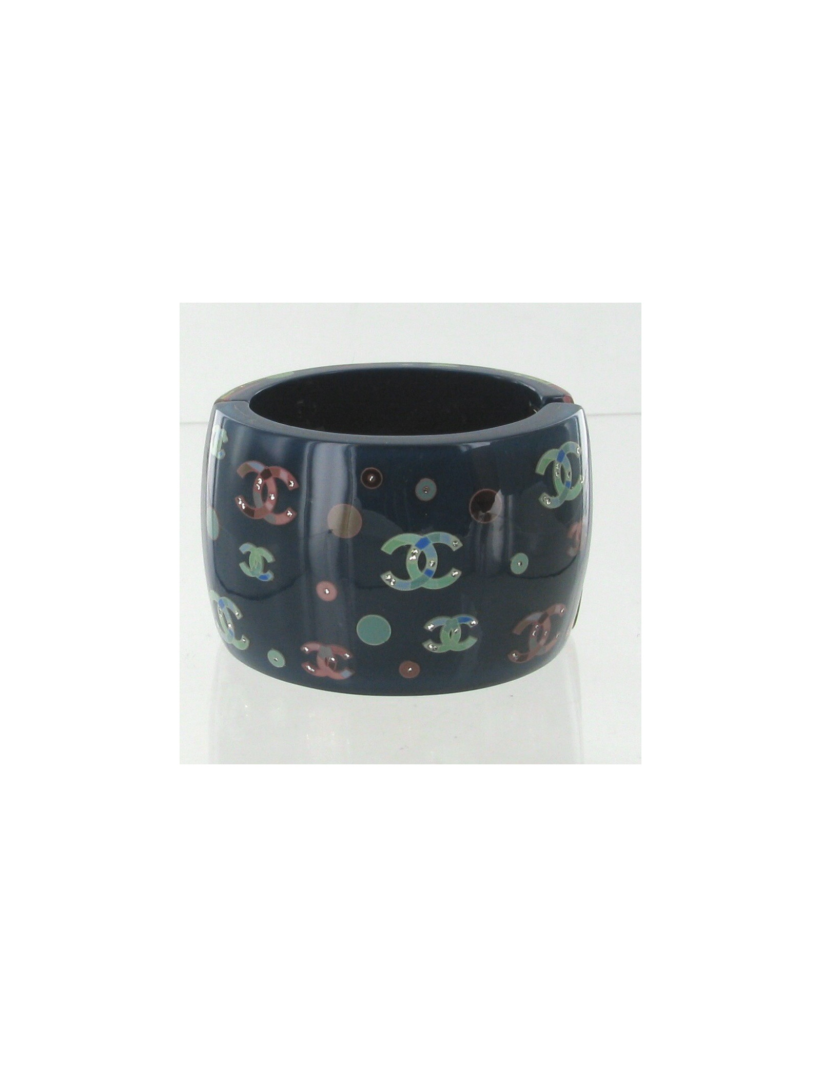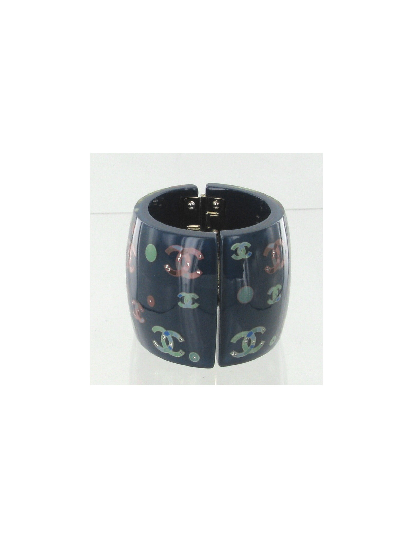 Superbe manchette CHANEL en résine bleu outre mer incrusté de CC multicolores sertis de strass et de points multicolores. La fermeture est aimantée. Micros rayures.