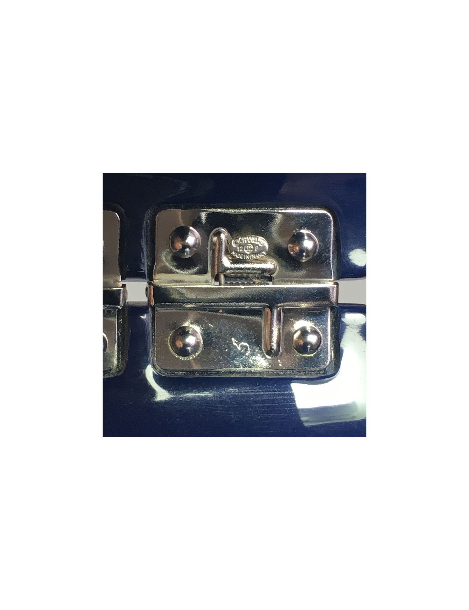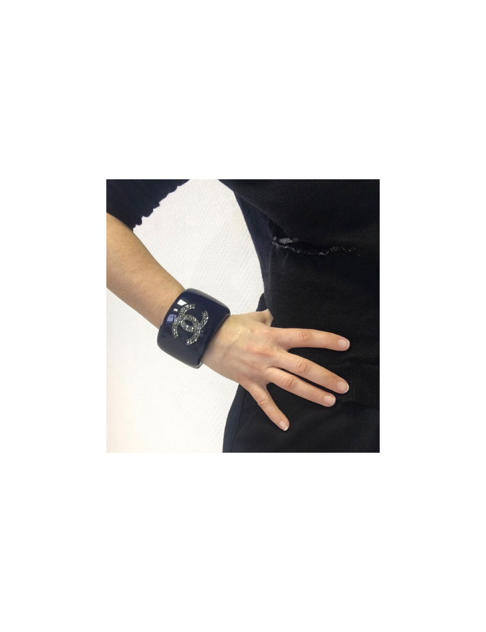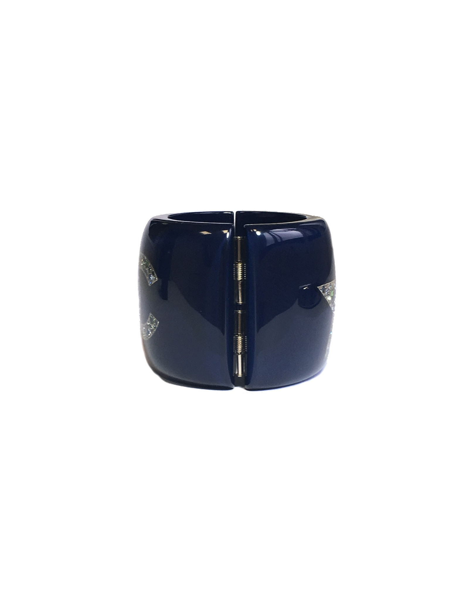Manchette CHANEL en résine bleu laqué, CC et étoile avec inclusions de strass