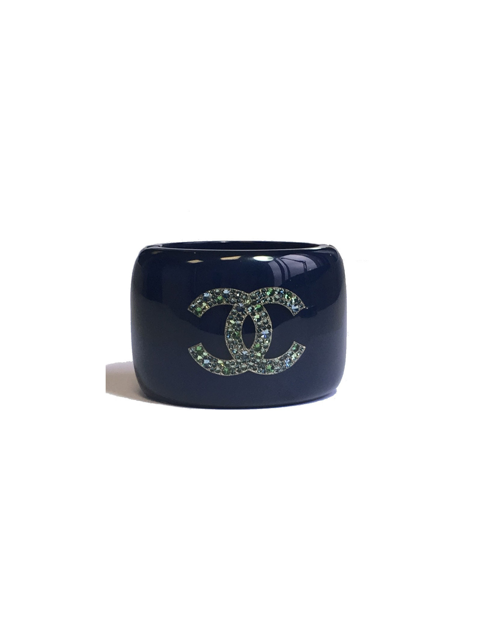 Superbe manchette Chanel en résine bleu laqué. CC et étoile sertis de strass vert, bleu et blanc en inclusion dans le bracelet.