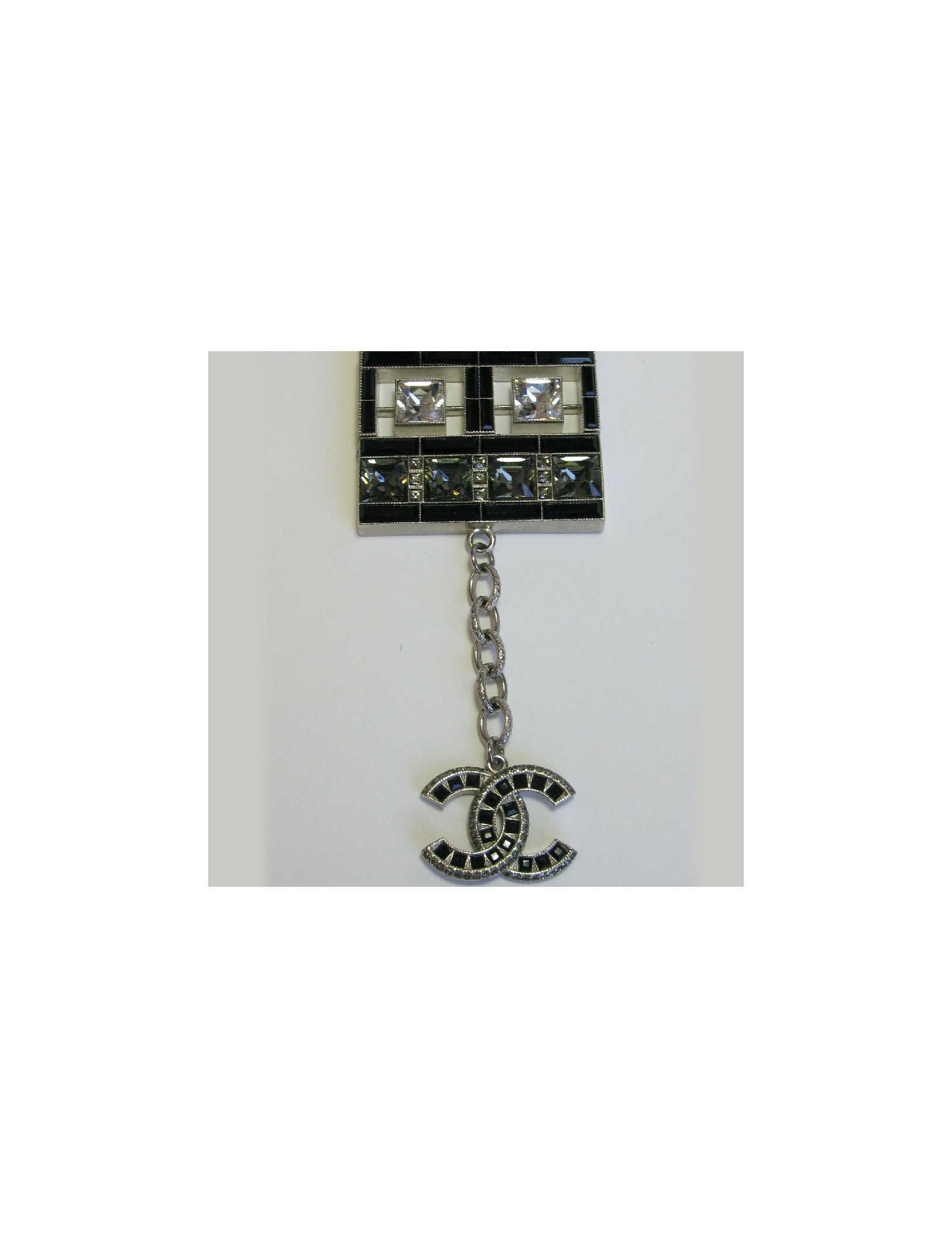 Couture! Superbe manchette articulée Chanel en métal argenté mat sertie de strass Swarovski de différentes formes. Un CC au centre.