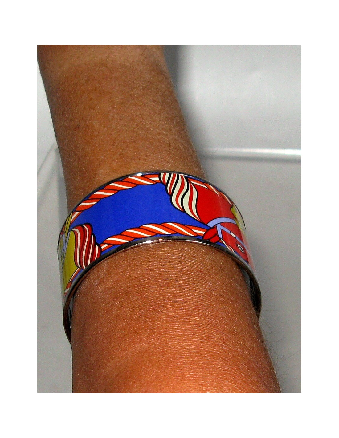 Bracelet HERMES quadrige extra large peinture acrylique. Il se compose d'un motif deux têtes de chevaux entrelacés. Ce bracelet a un S des soldes (le prix public est d'environ 600 euros). Il est vendu avec son dustbag.
