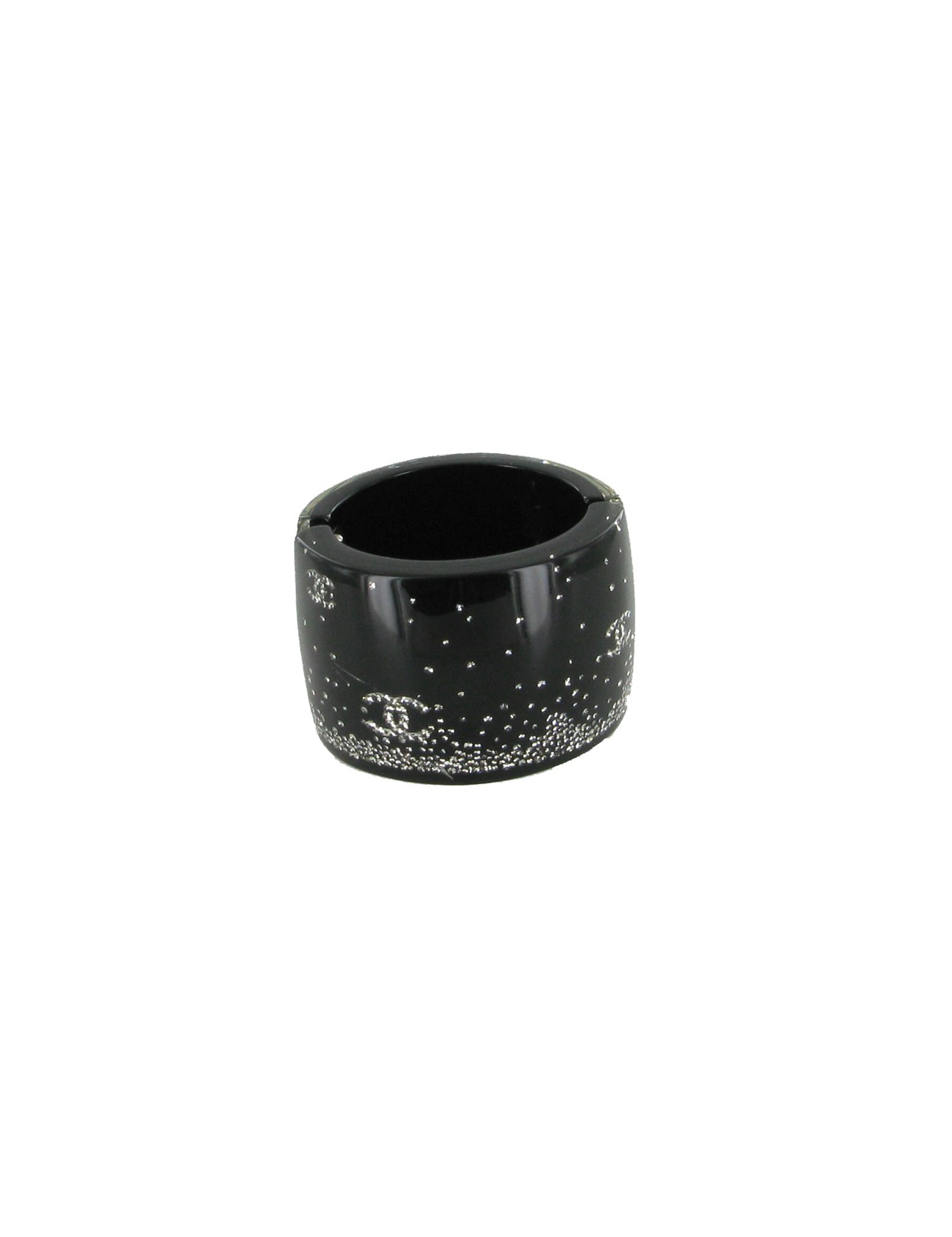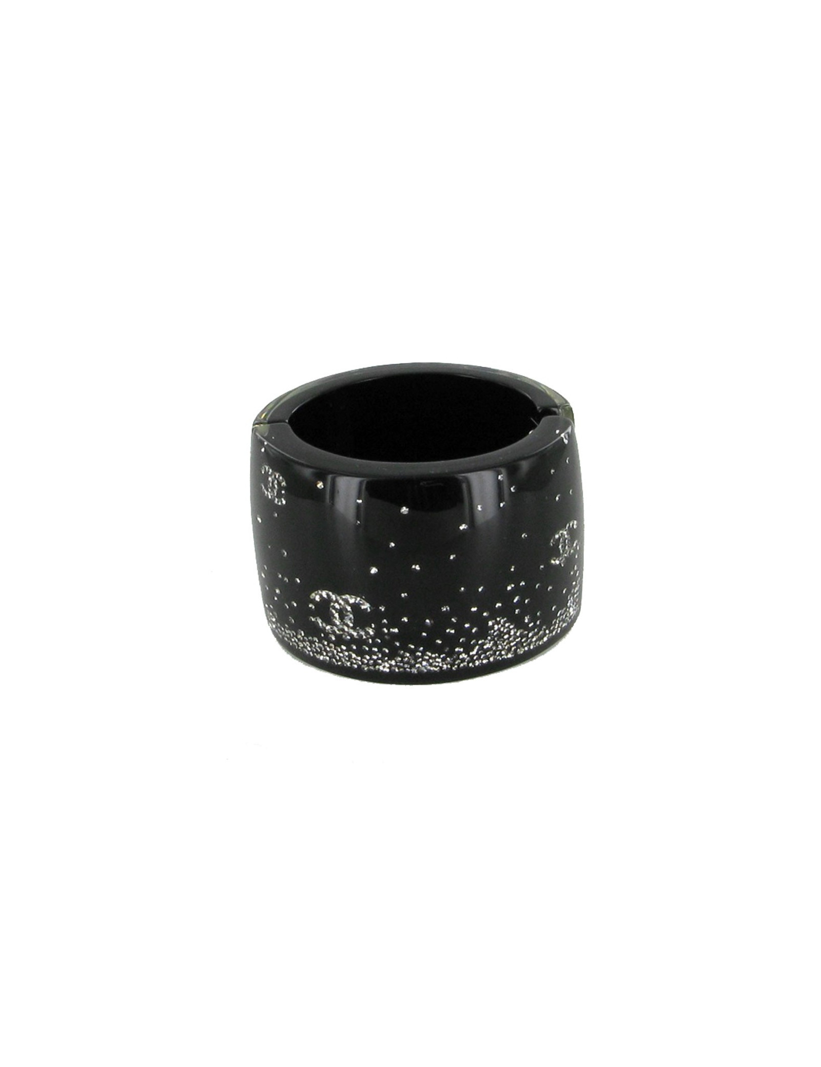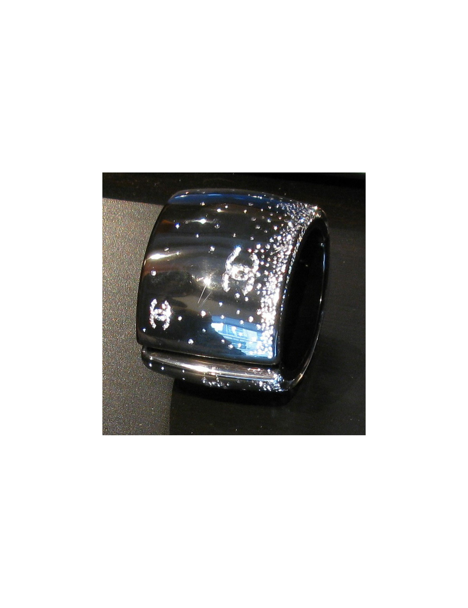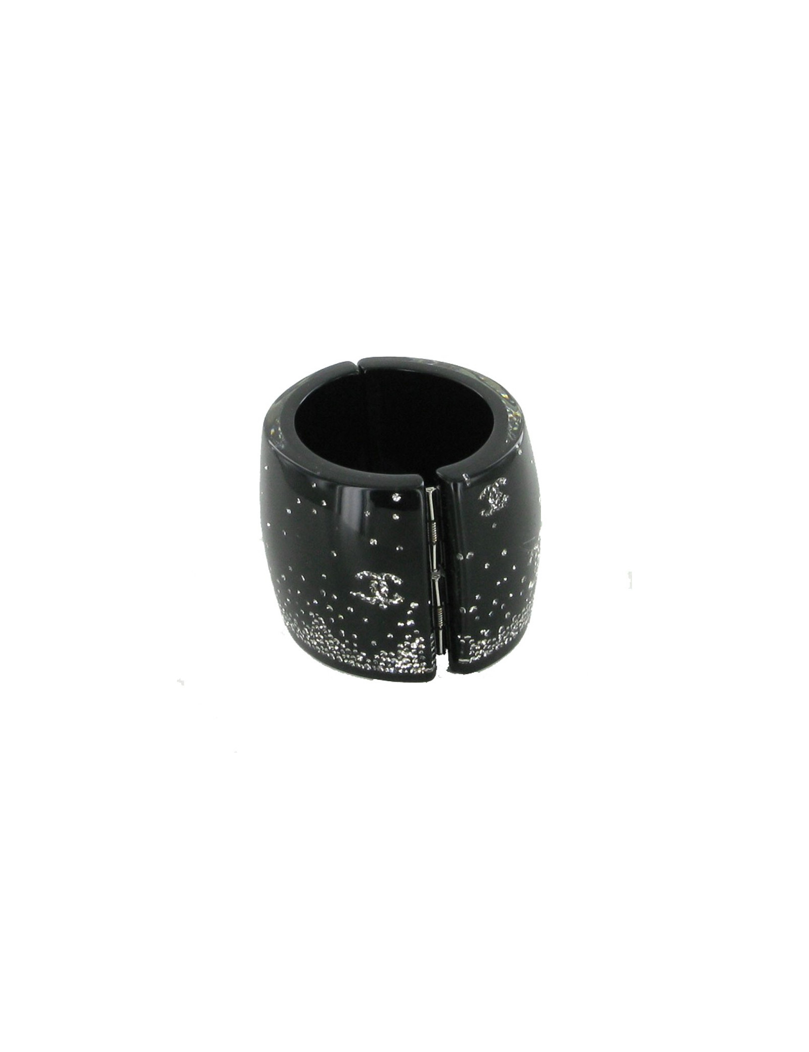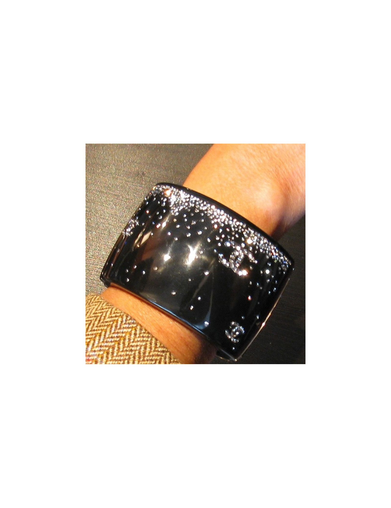 Cette magnifique manchette CHANEL est en résine noire incrustée de strass et CC en strass.
