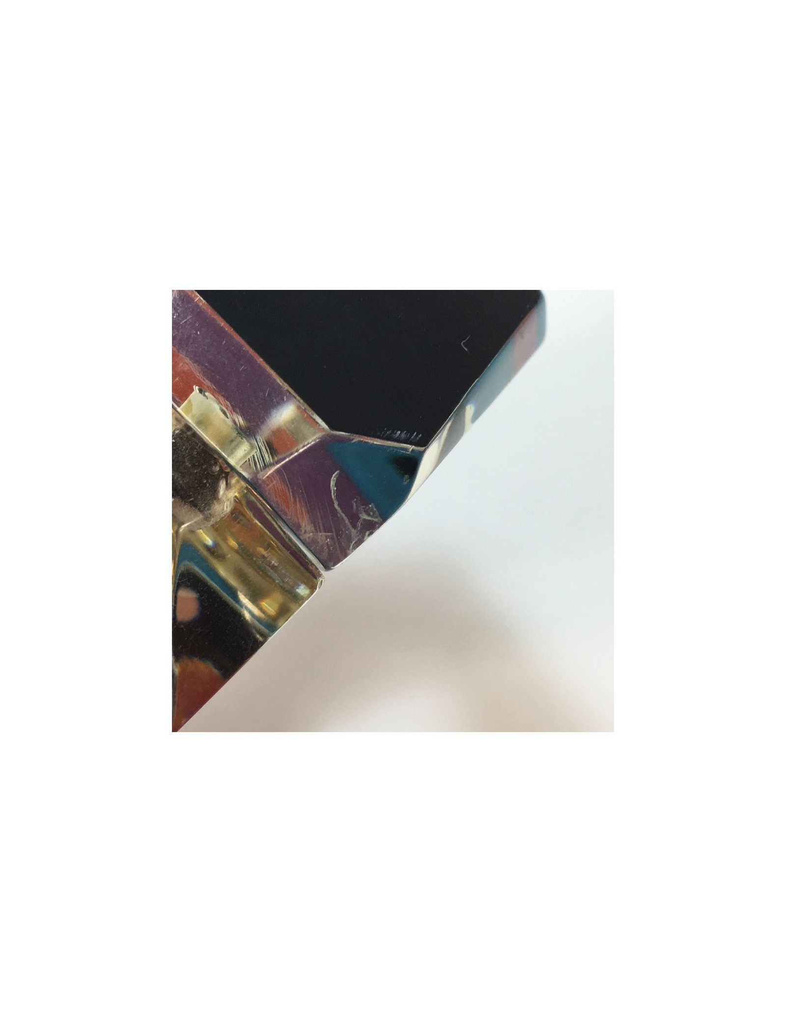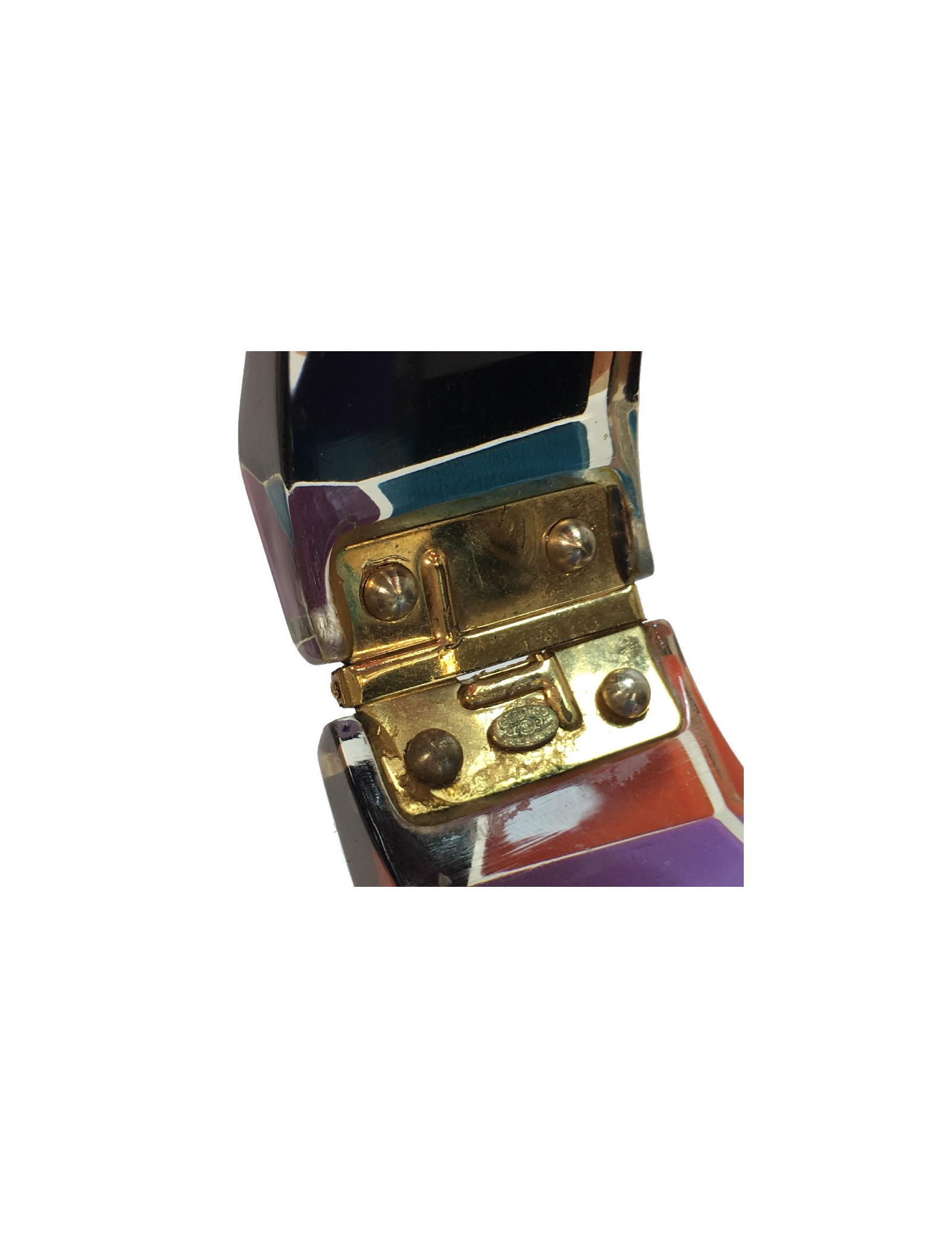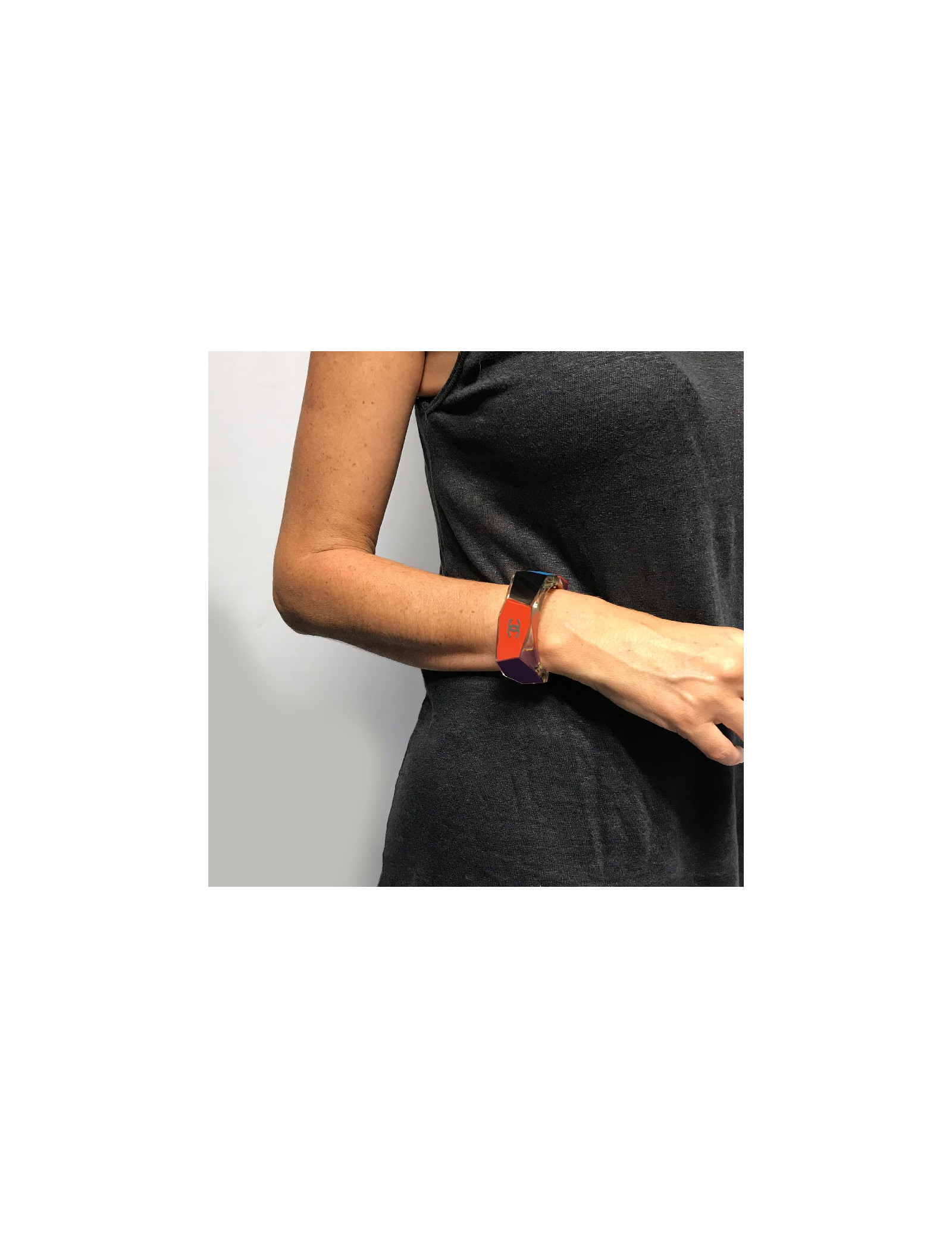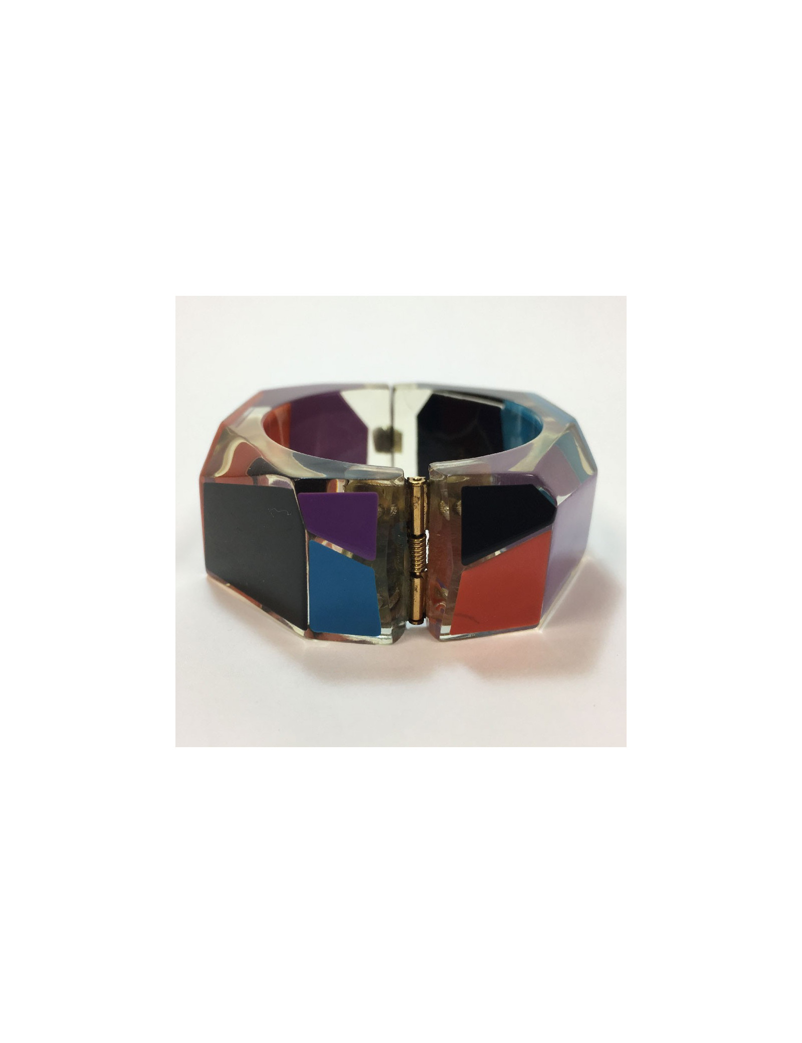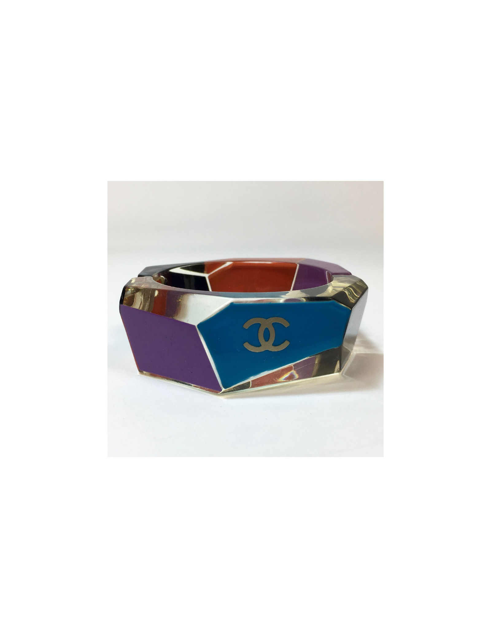 Manchette Chanel en plexiglass mauve, corail, noir et bleu. Elle se ferme par un clips sur le côté. La vignette Chanel est à l’intérieur et nous indique que ce bracelet est issu d'une collection Chanel de 2007.