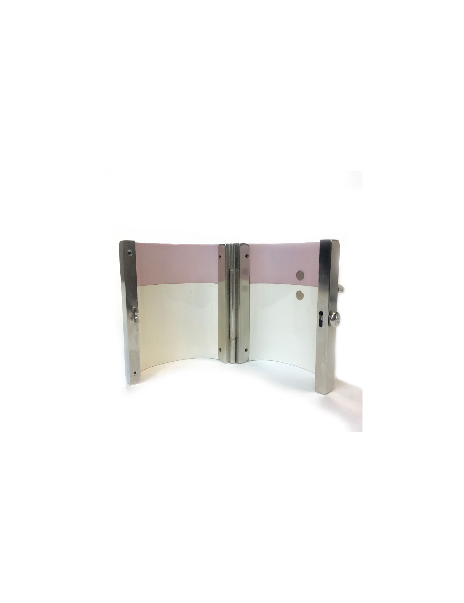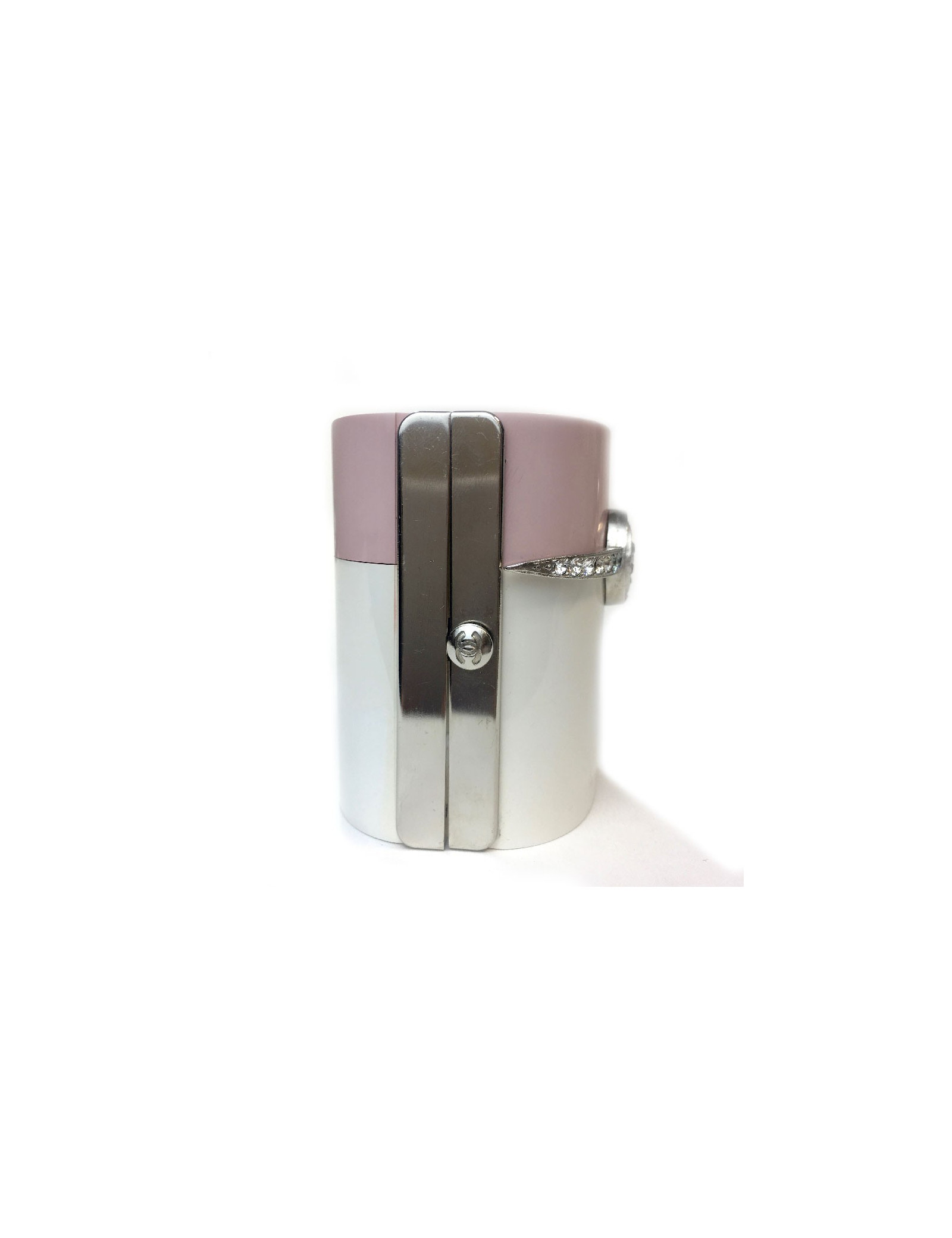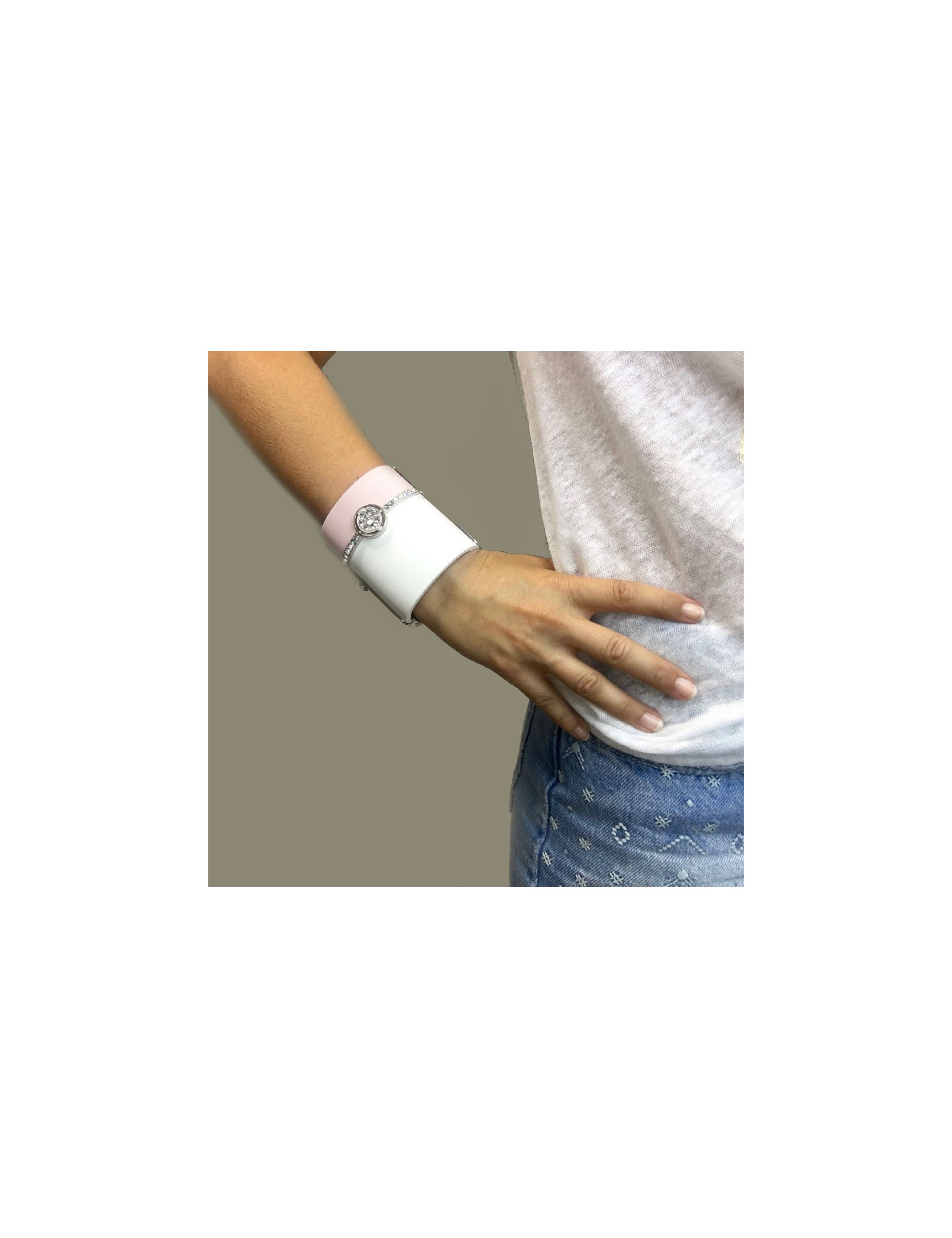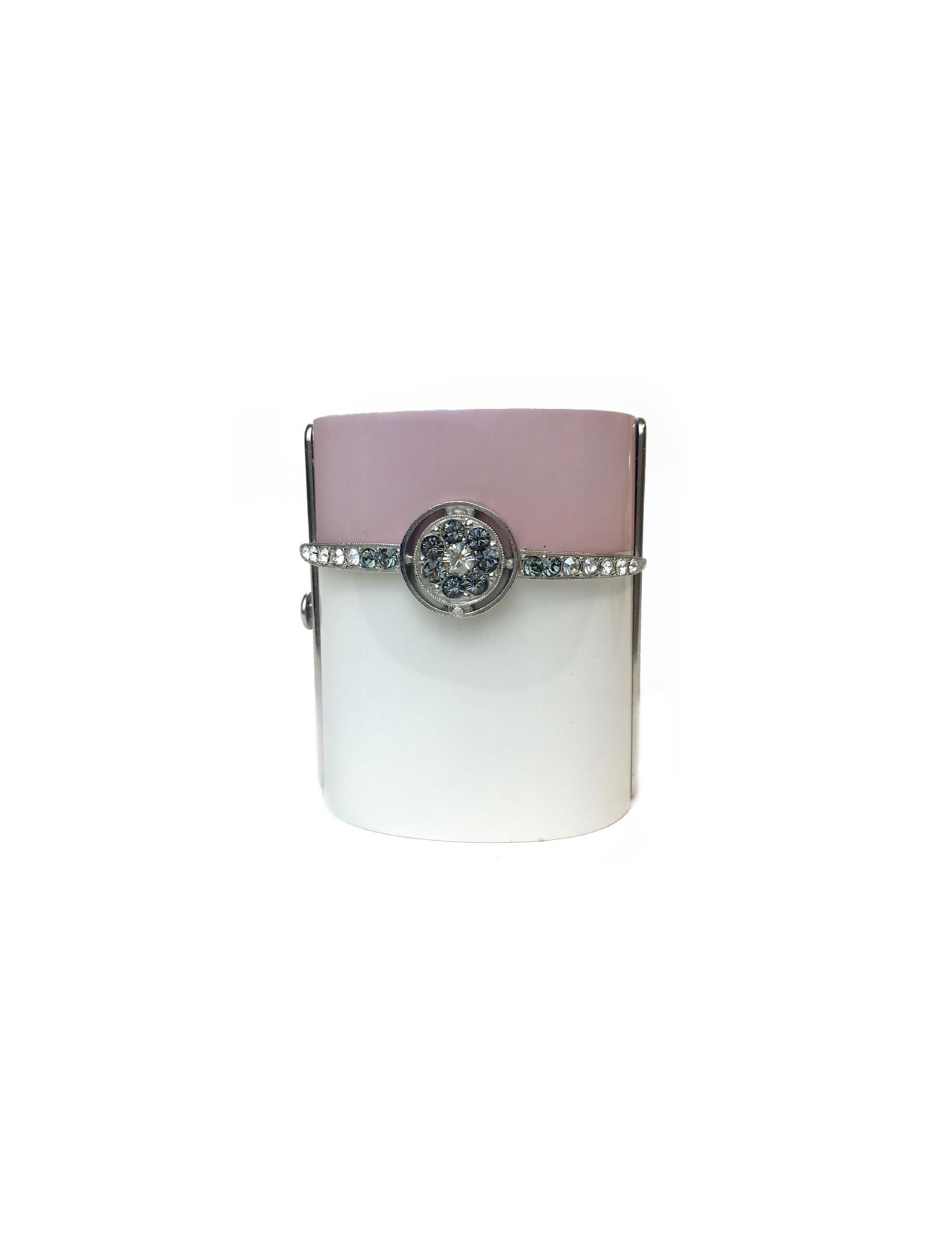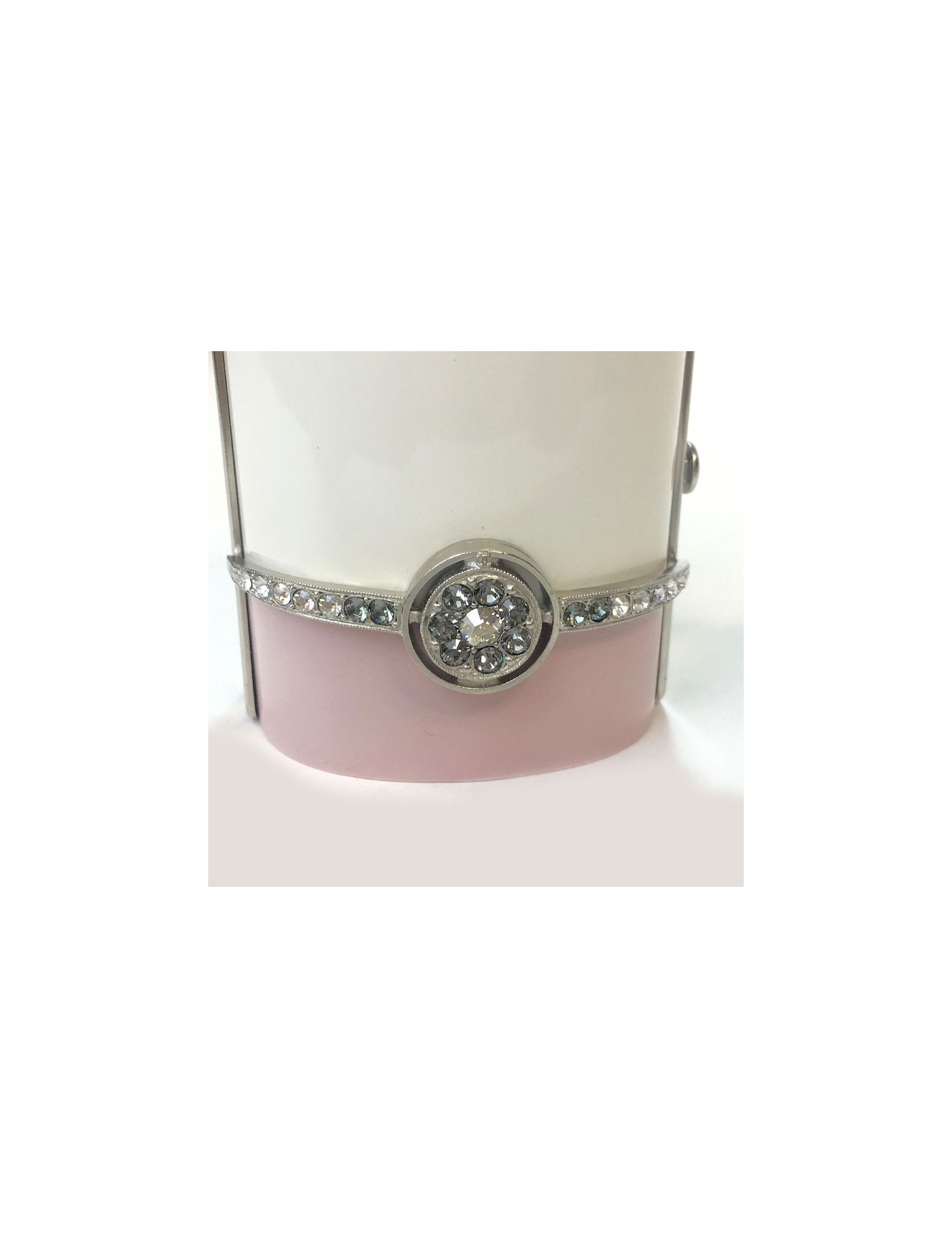 Superbe longue manchette Chanel en résine rose et blanc sertie de strass.