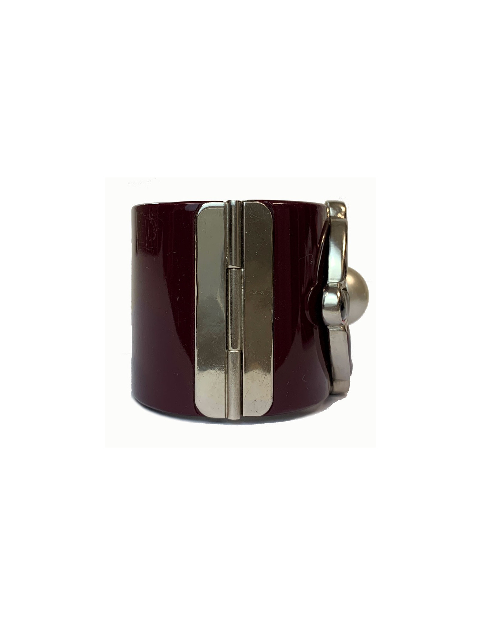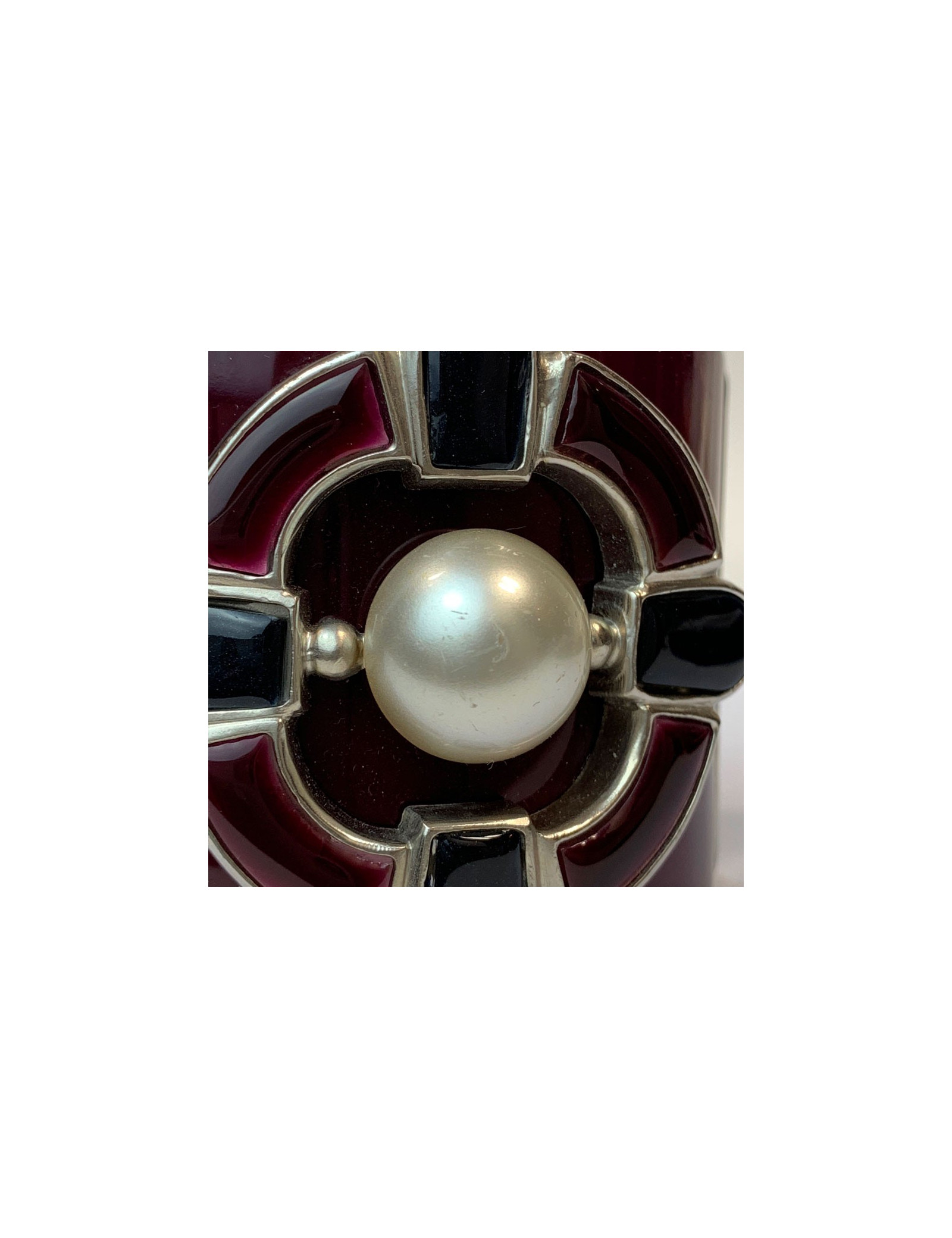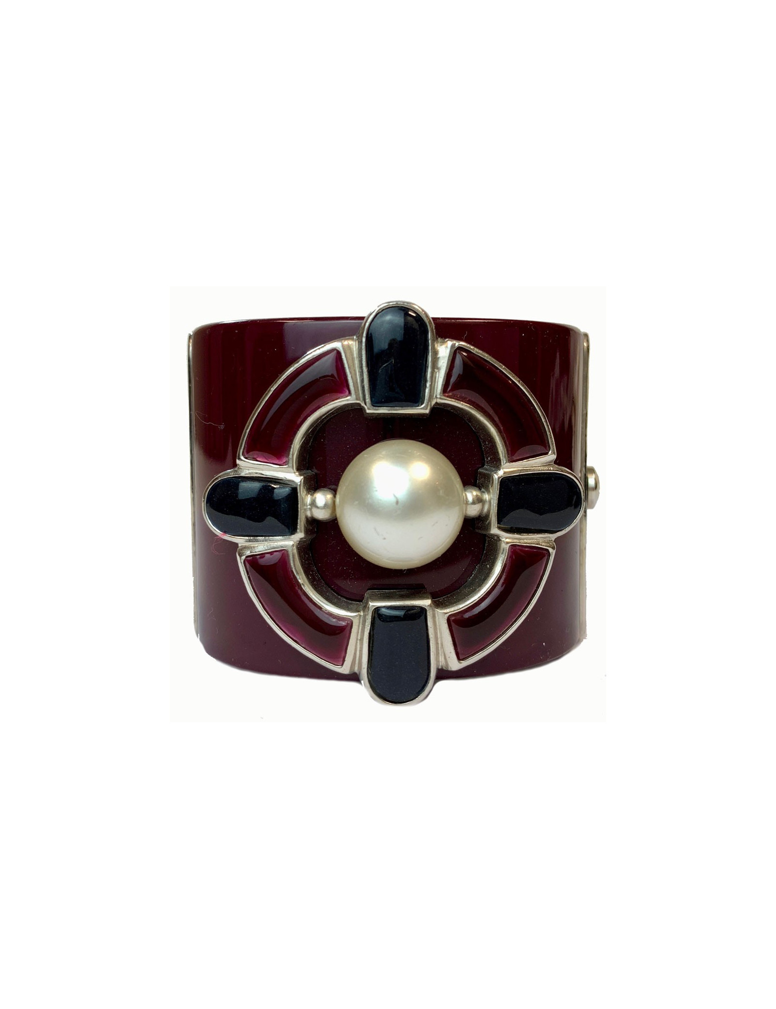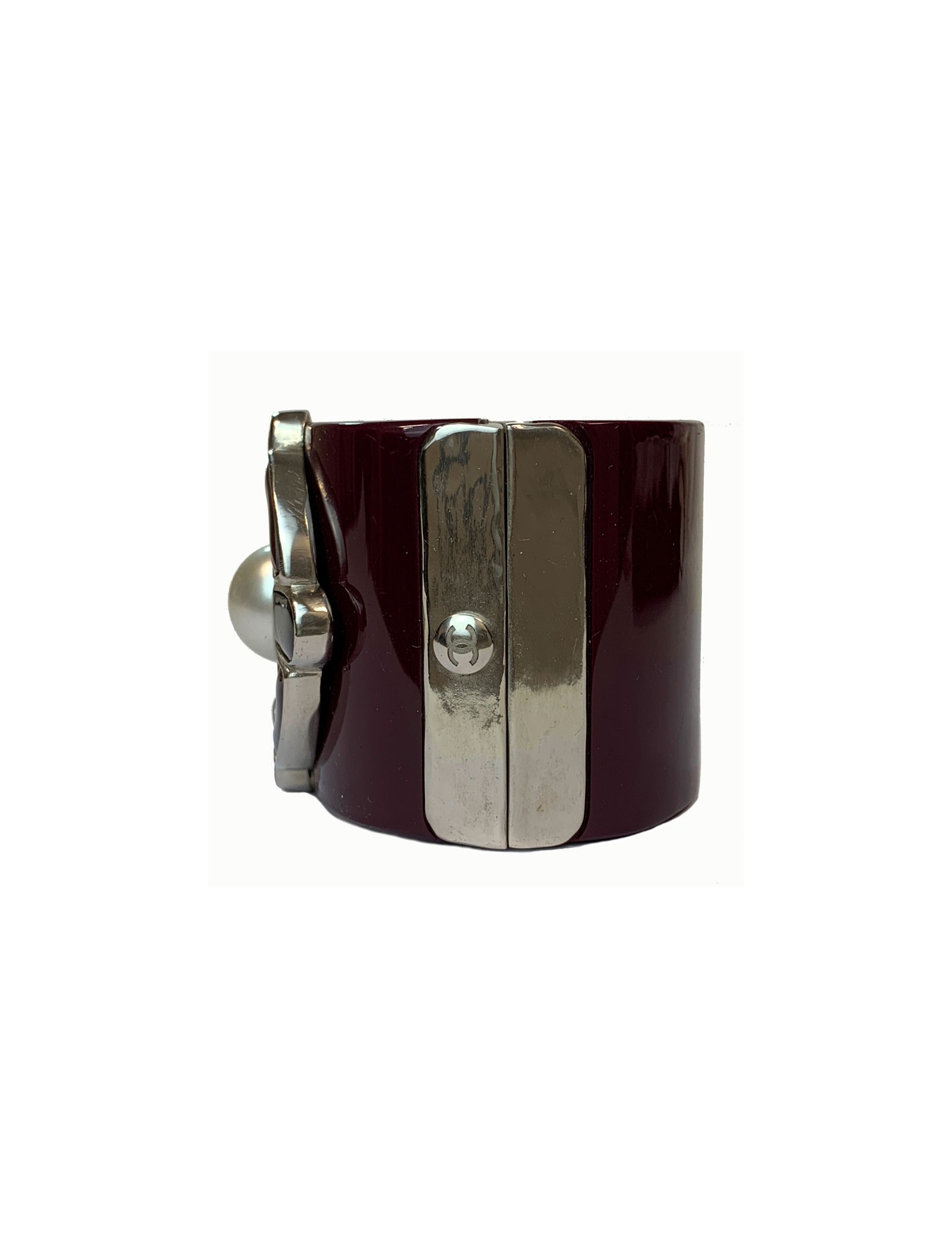 Couture! Cette manchette CHANEL en plexiglass violet est belle. Agrémentée d'une pièce en métal doré sertie de résine violette et d'une perle nacrée au centre. La bijouterie est en métal argenté.