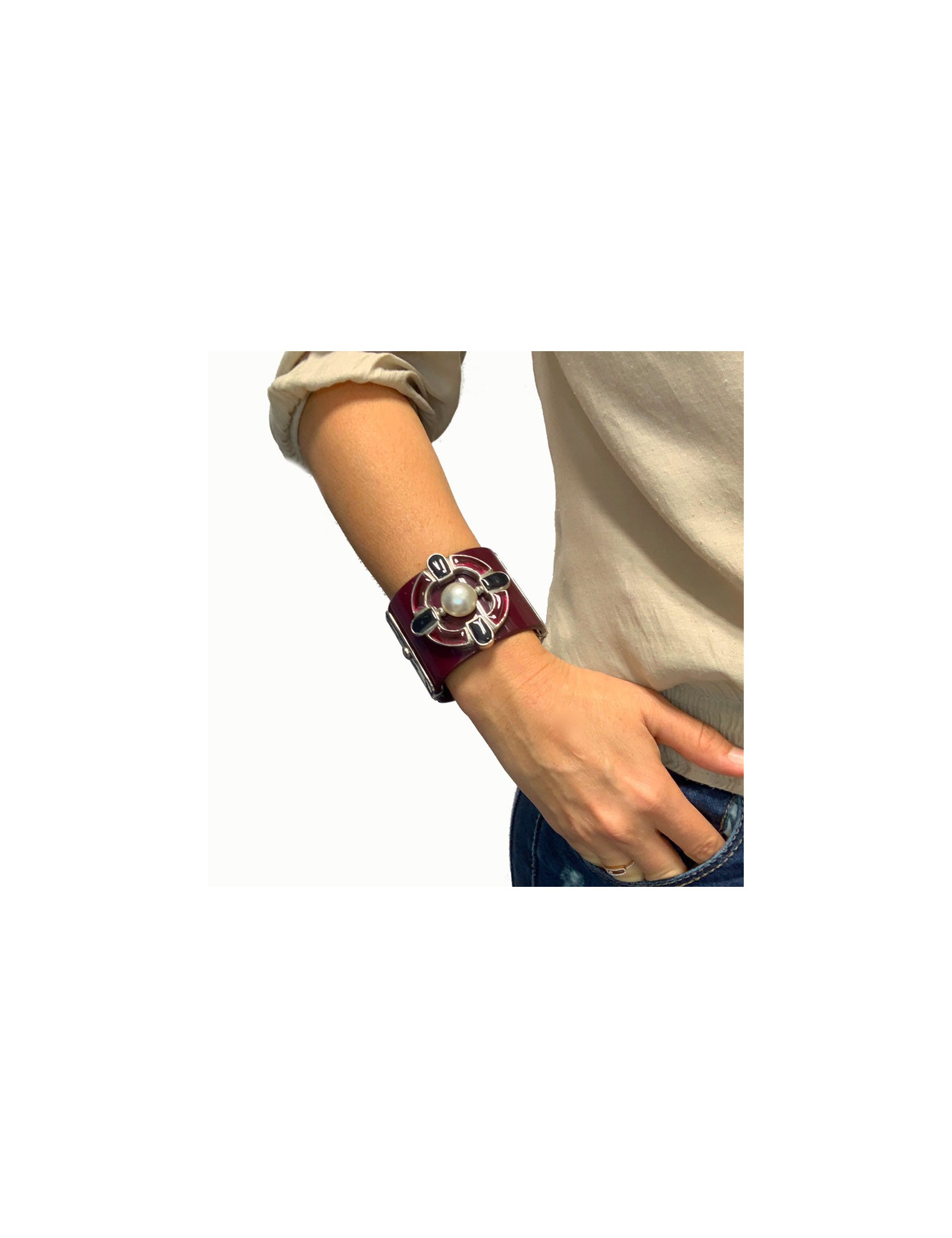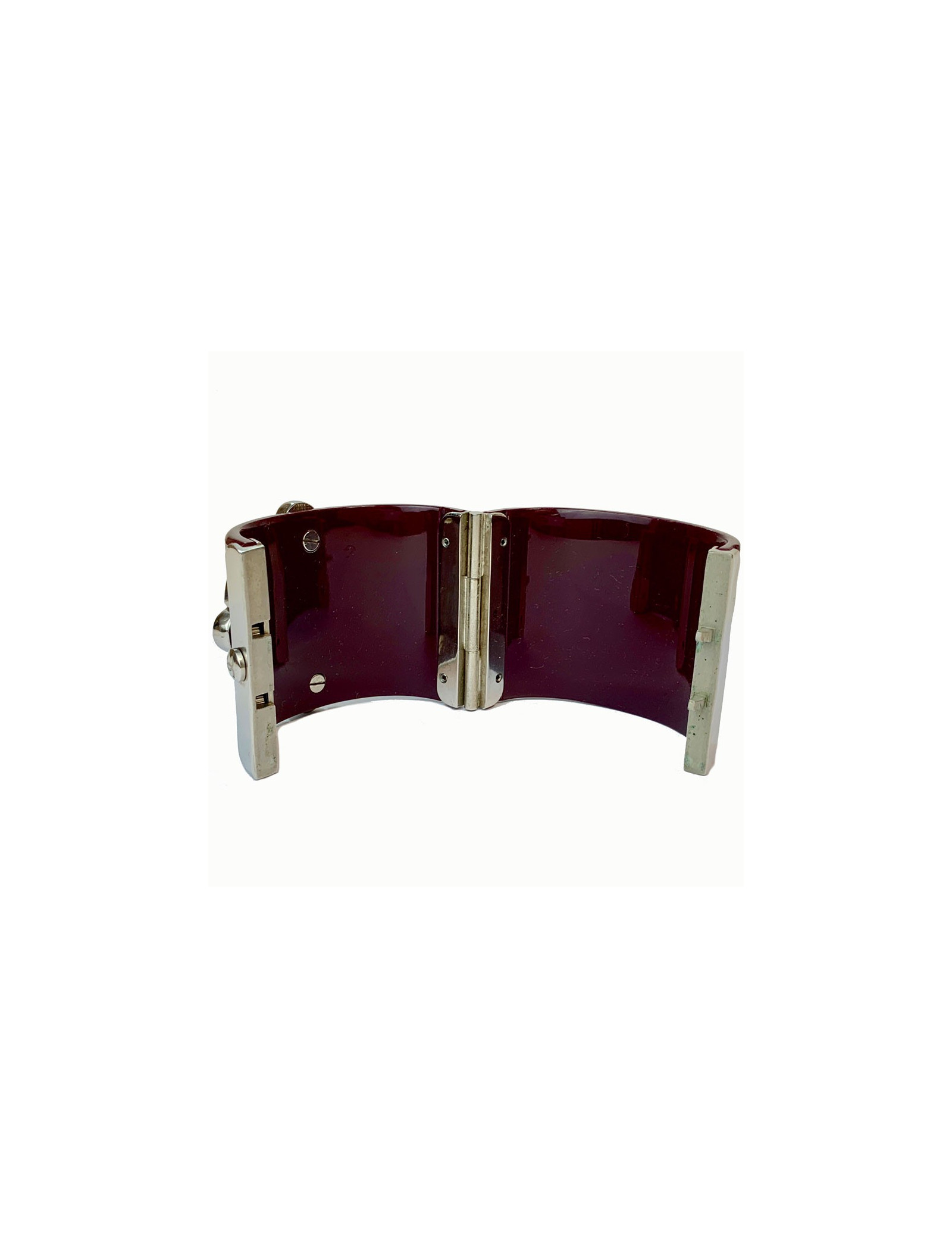 Ce bracelet CHANEL est en très bon état général. La nacre est légèrement écaillée. Il y a également des micro rayures sur le plexi violet.