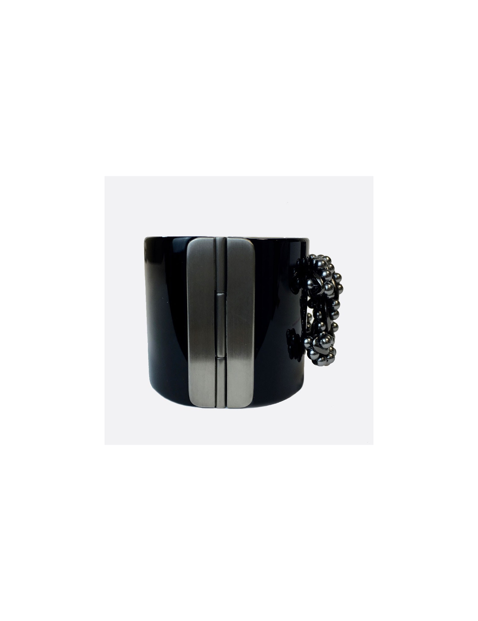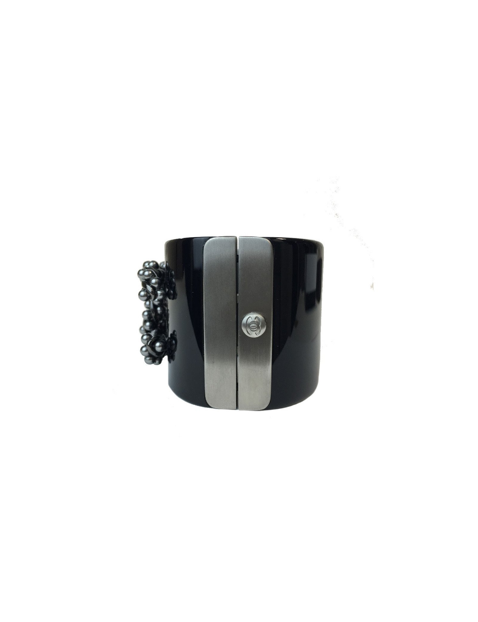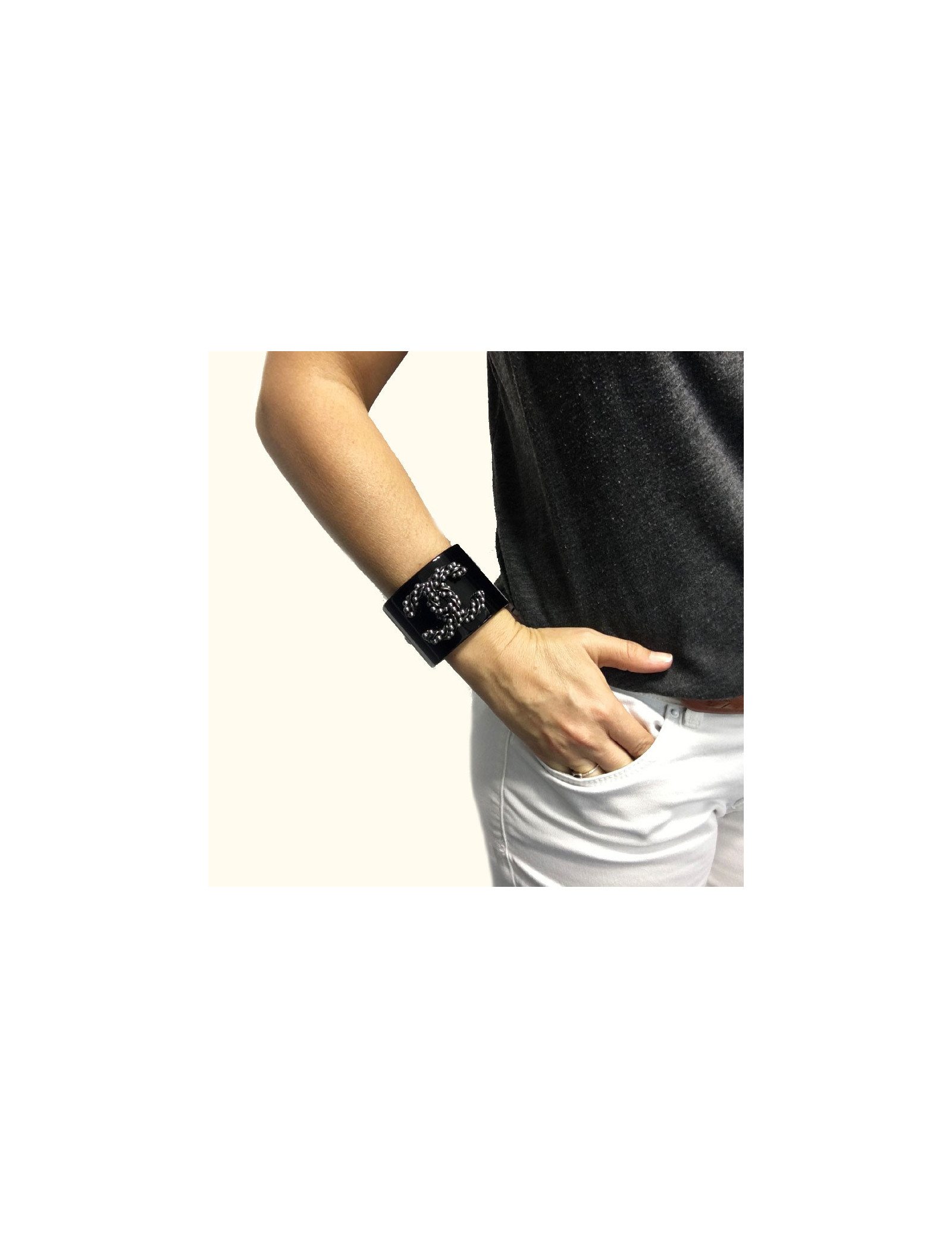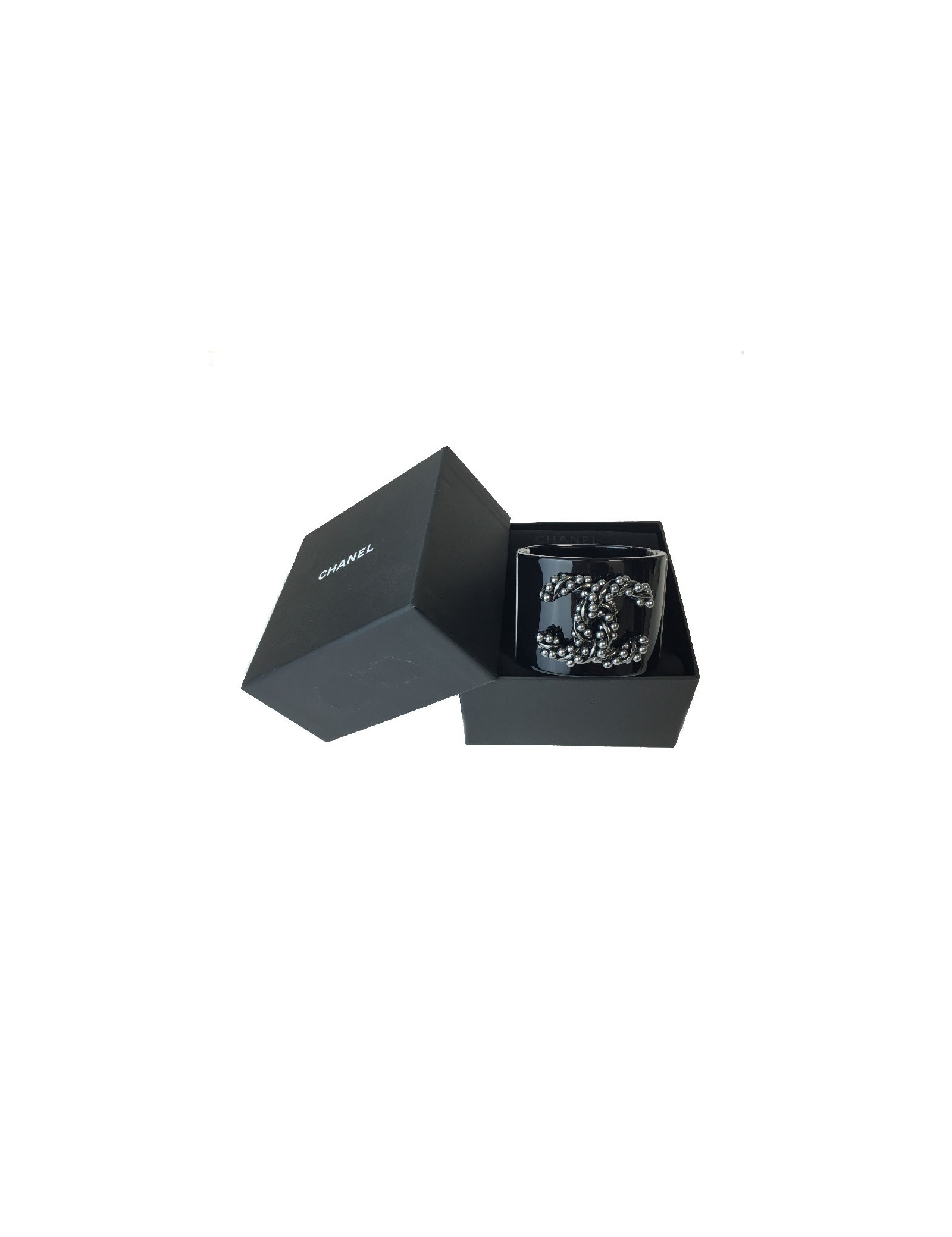 Manchette Chanel en plexi noir et CC en métal couleur canon de fusil